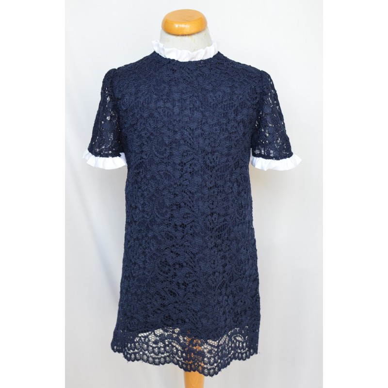 Abito foderatoย a trapezio in pizzo blu, con frappetta bianca sullo scollo e sulle maniche. Vestibilitร ampia. 52% viscosa 48% poliammide DISPONBILE-SPEDIZIONE IMMEDIATA-
