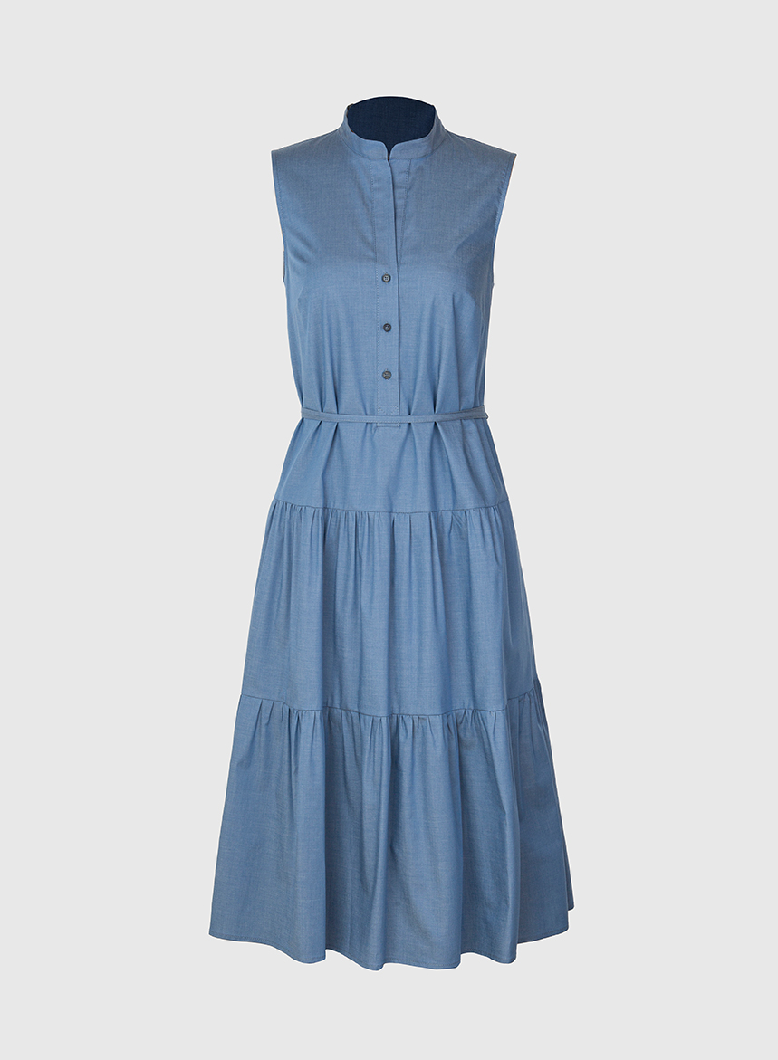 Abito Midi in Cotone. Allacciatura anteriore a chemisier con collo a giro. Smanicato e caratterizzato da due balze sul fondo dellโabito. Silhoutte scivolata con tasche nel fianco e cinturino in tessuto per segnare a piacimento il punto vita.