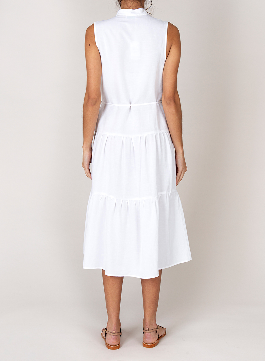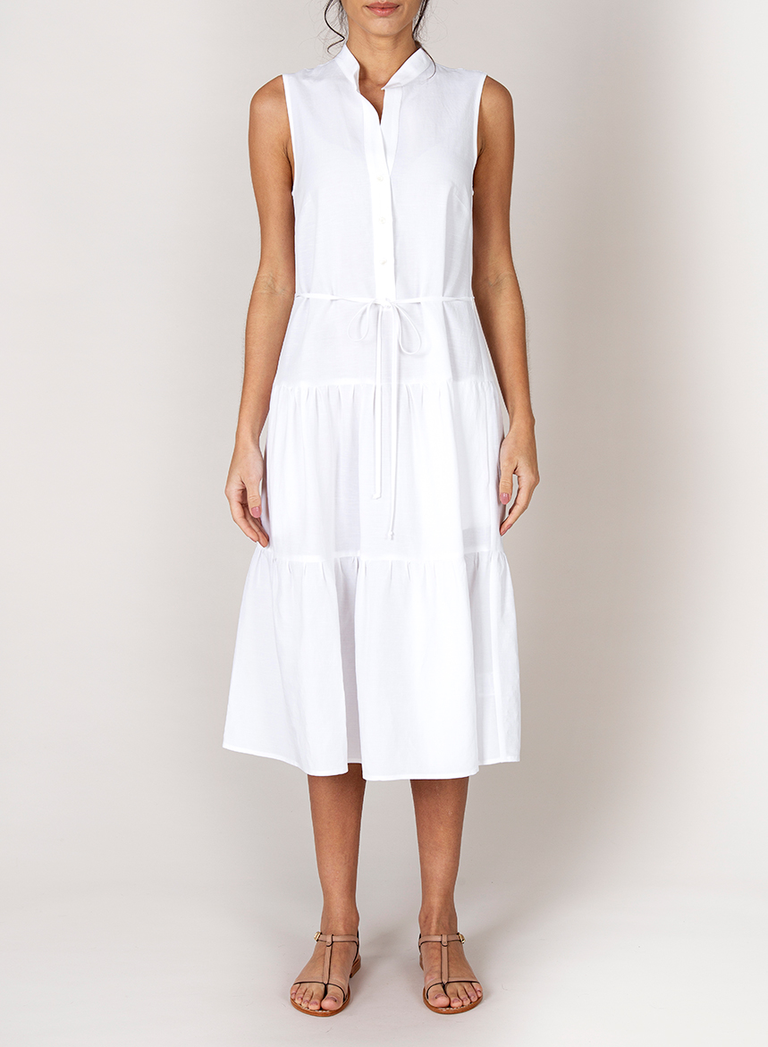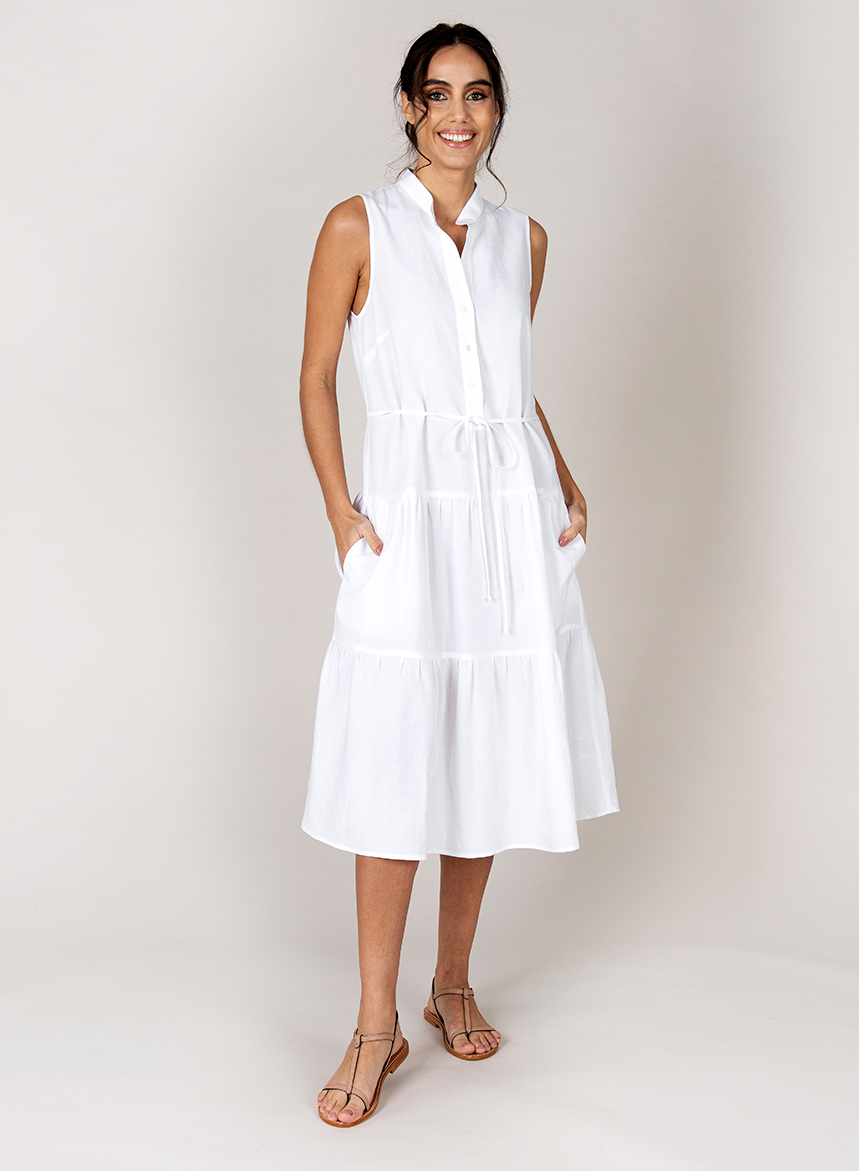 Abito Midi in Viscosa e Lino. Allacciatura anteriore a chemisier con collo a giro. Smanicato e caratterizzato da due balze sul fondo dellโabito. Silhoutte scivolata con tasche nel fianco e cinturino in tessuto per segnare a piacimento il punto vita. La modella รจ alta 175 cm e veste una tg 40.