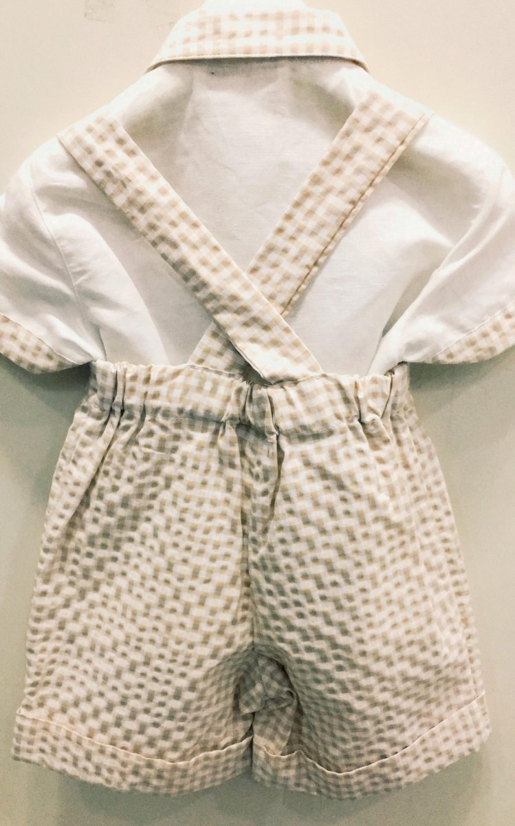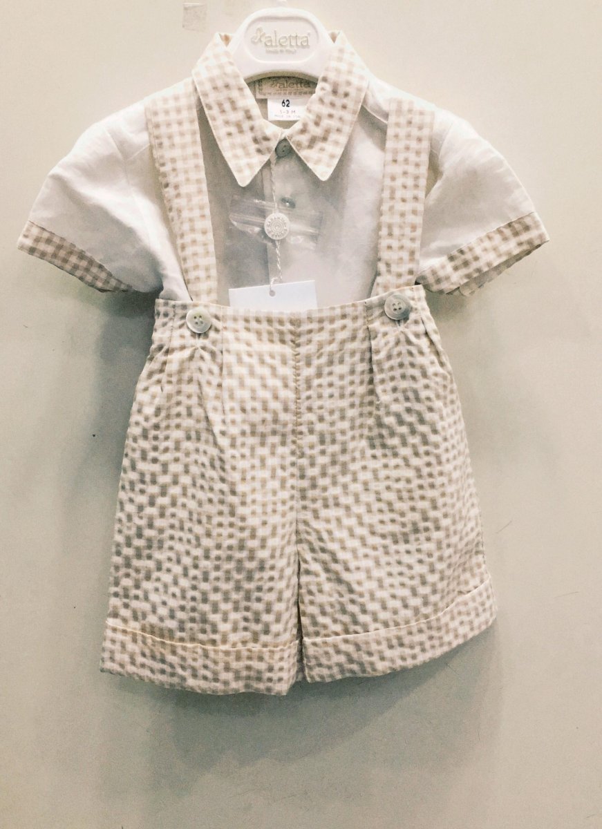 ALETTA COMPLETO NEONATO ALETTA COMPLETO NEONATO composto da bermuda con bretelle regolabili ed elastico in vita e camicia manica corta colore:ย bianco/beige taglia: dalla 1-3 mesi (62 cm) composizione: camicia 15% lino 85% viscosa, bermuda 51% poliestere 49%cotone