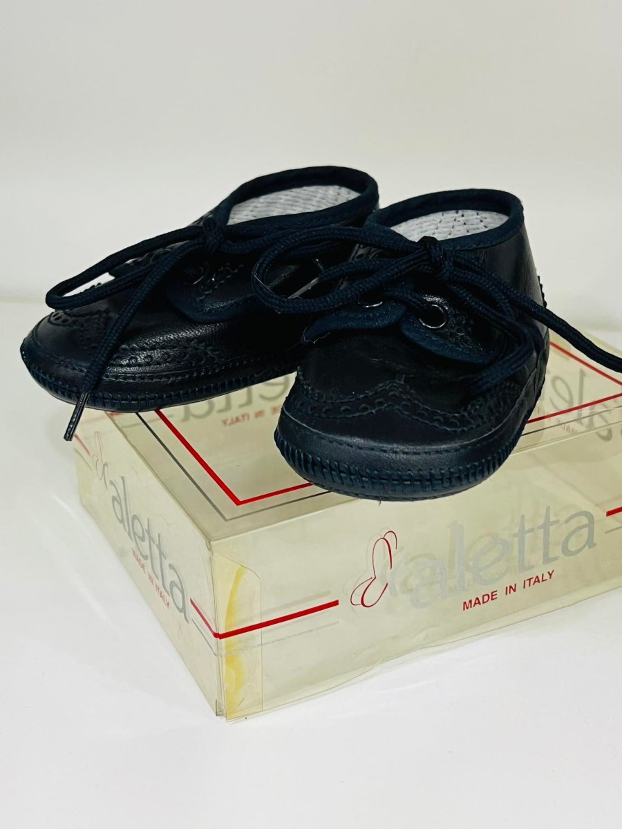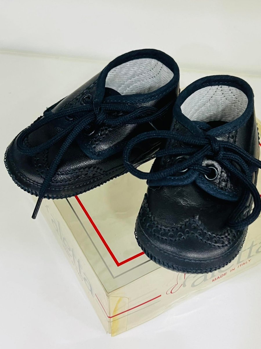 ALETTA SCARPETTE NEONATO ALETTA SCARPETTE NEONATO modello chiuso con lacci. VERA PELLE colore: blu notte VERA PELLE taglia: dal 15 al 20