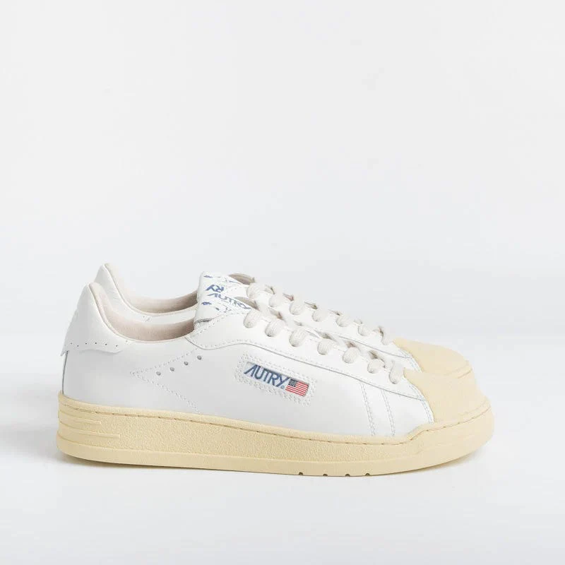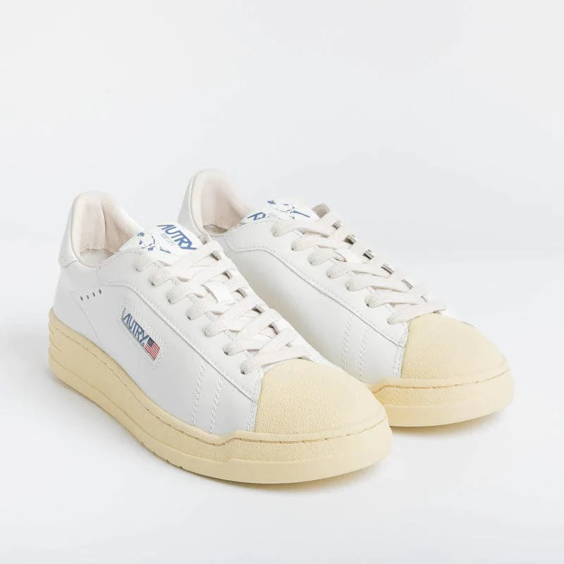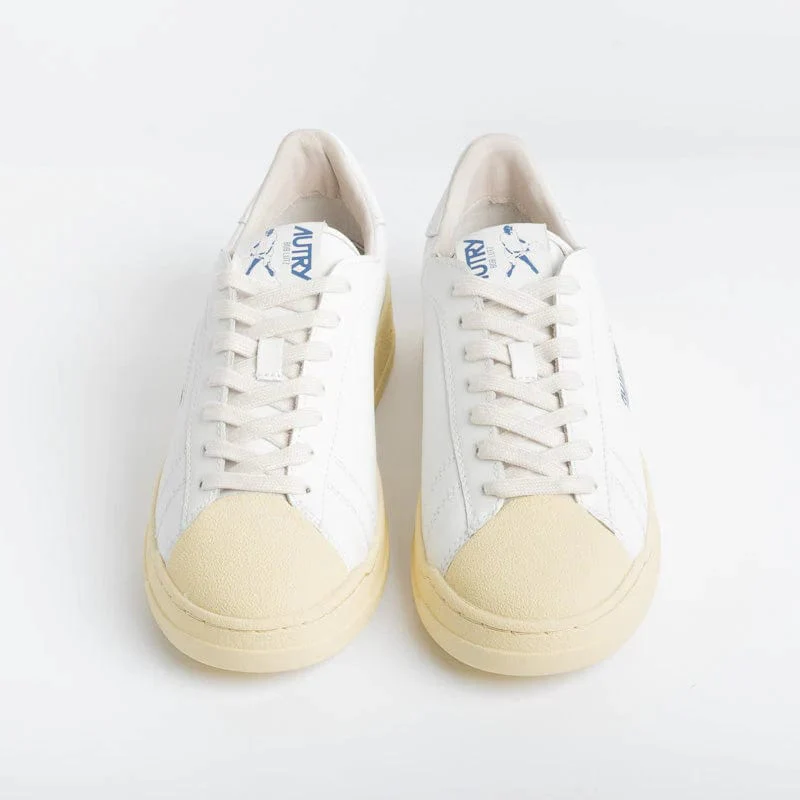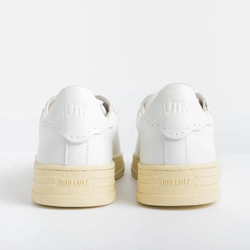 Sneaker modello Bob Lutz in pelle bianca con punta in contrasto di colore, suola rialzata di 2 cm, linguetta in tessuto con label cucita in tono. BLLM-TC01.
