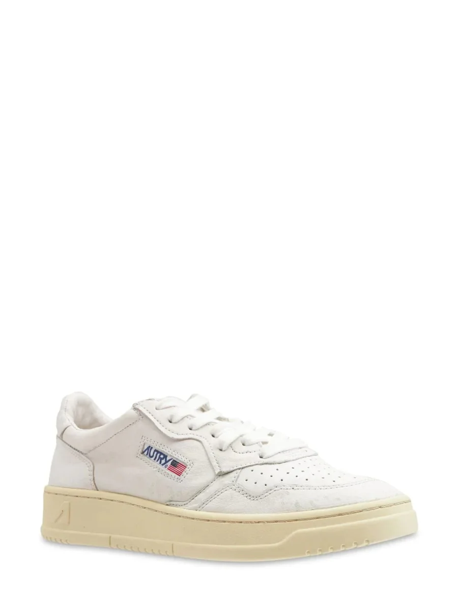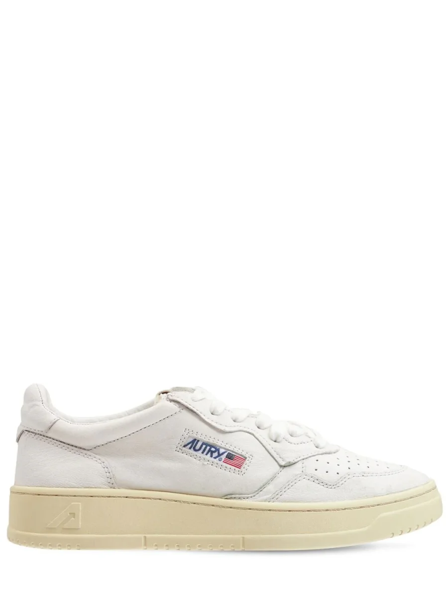 Sneaker modello Medalist in pelle di capra bianca , punta traforata e suola rialzata di 2 cm, linguetta in tessuto con label cucita in tono. AULM GG04.