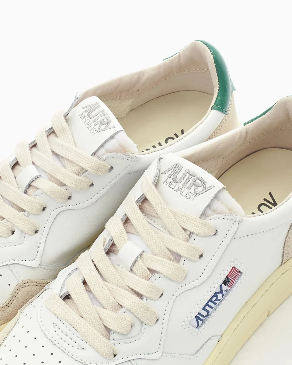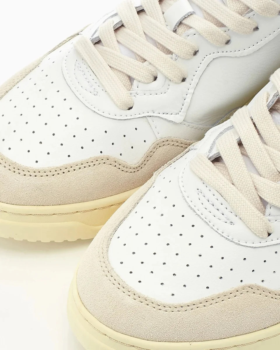 Sneaker modello Medalist in pelle bianca con suede in contrasto, punta traforata e suola rialzata di 2 cm, linguetta in tessuto con label cucita in tono. AULM LS23.