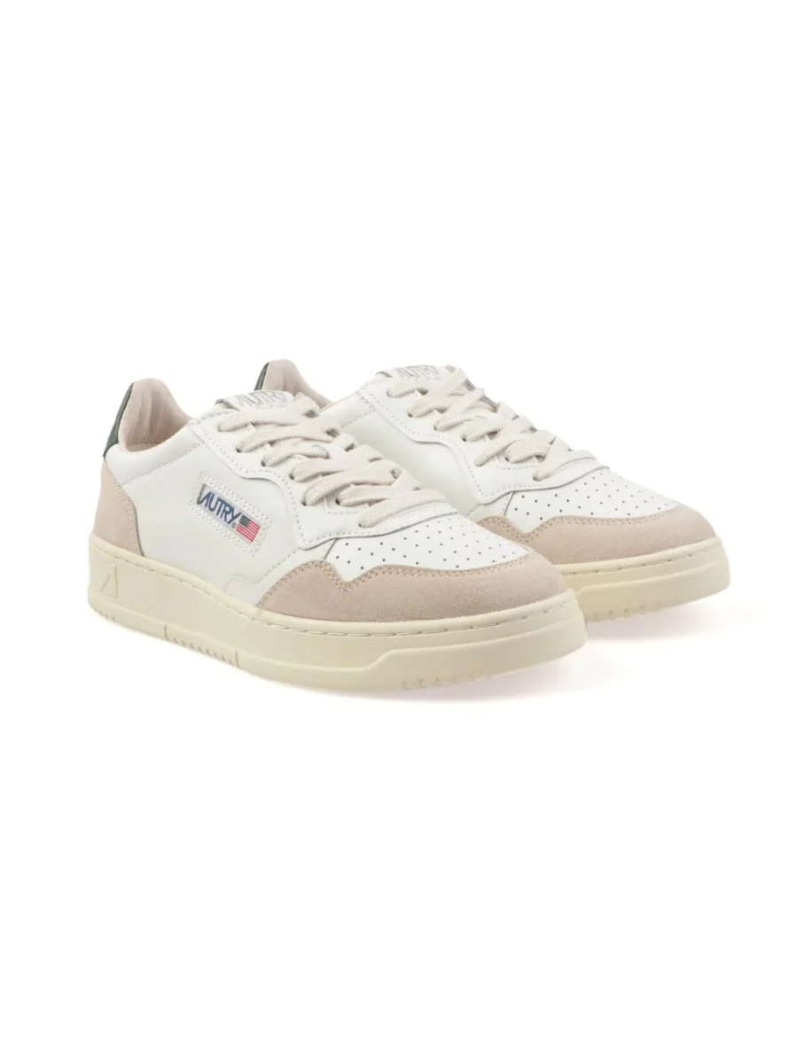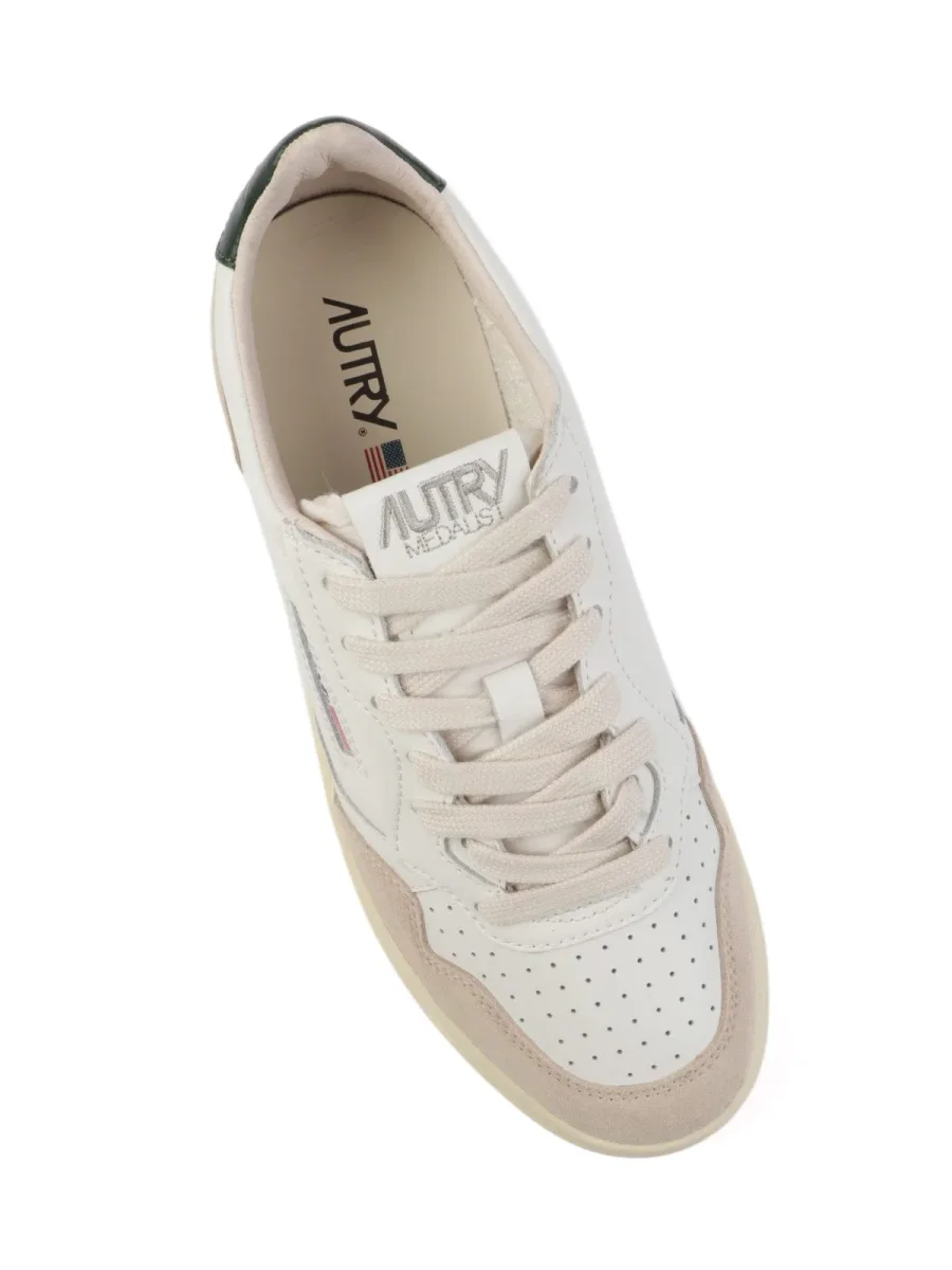 Sneaker modello Medalist in pelle bianca con colore in contrasto, punta traforata e suola rialzata di 2 cm, linguetta in tessuto con label cucita in tono. AULM LS56.