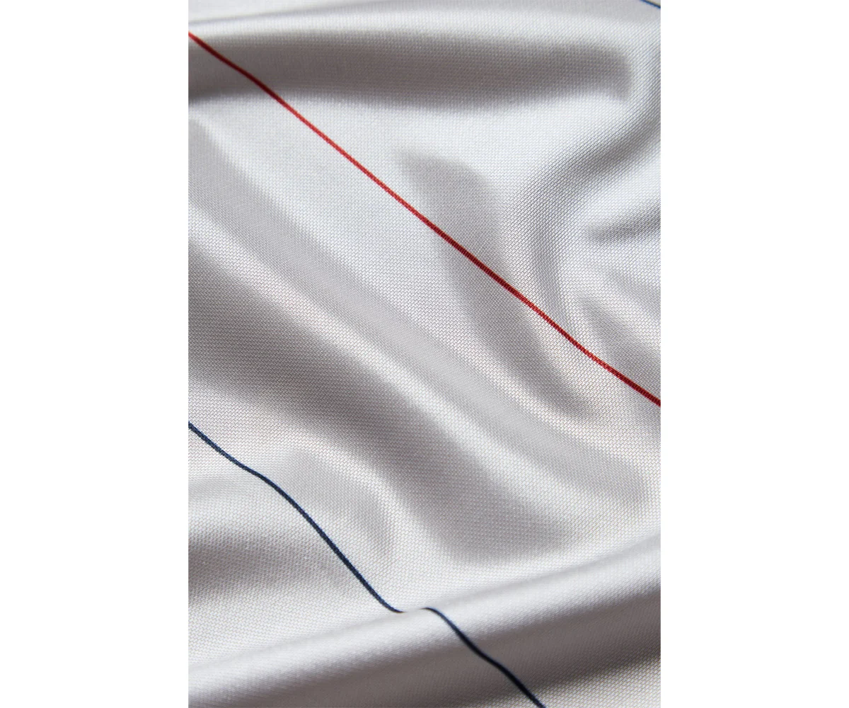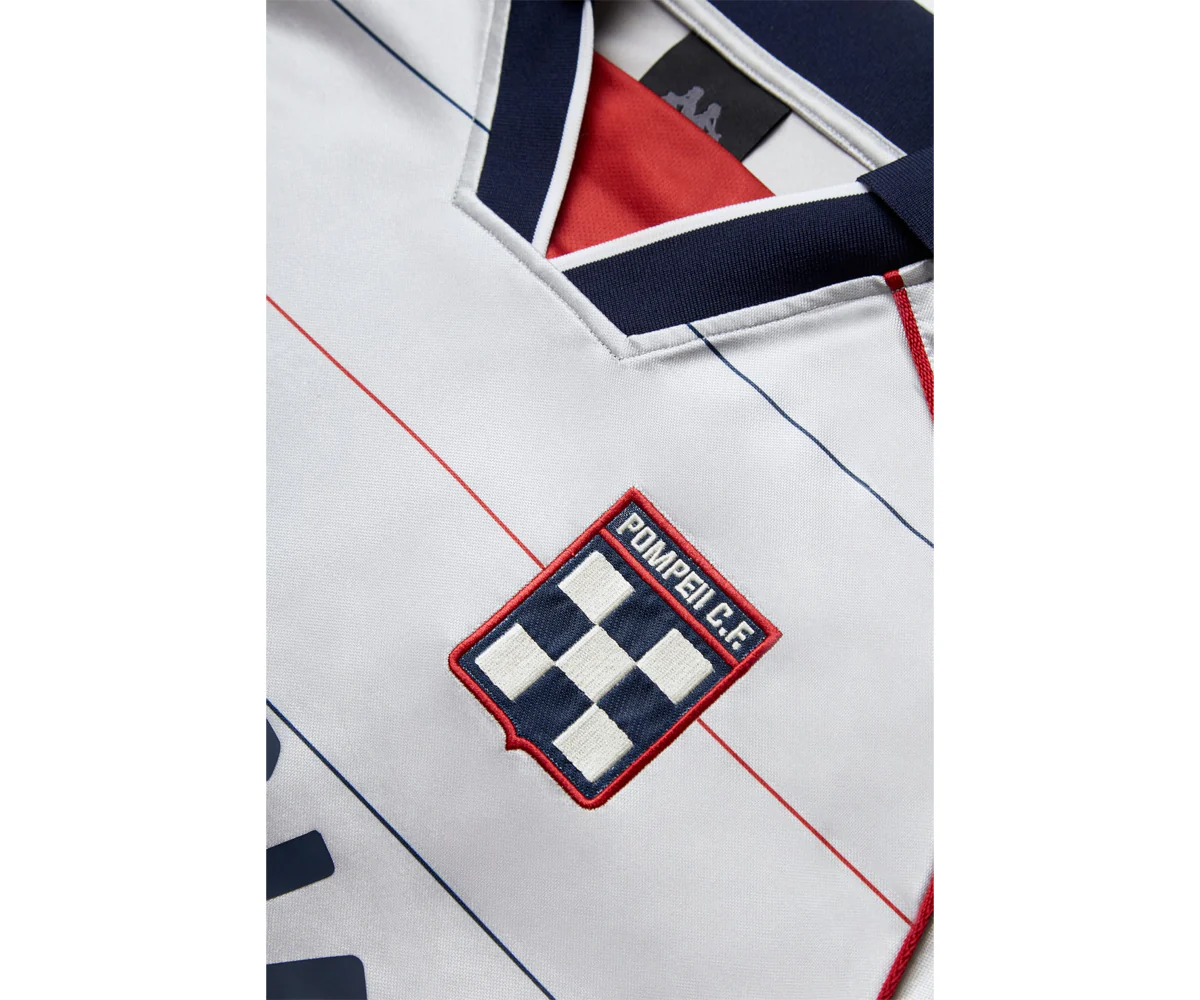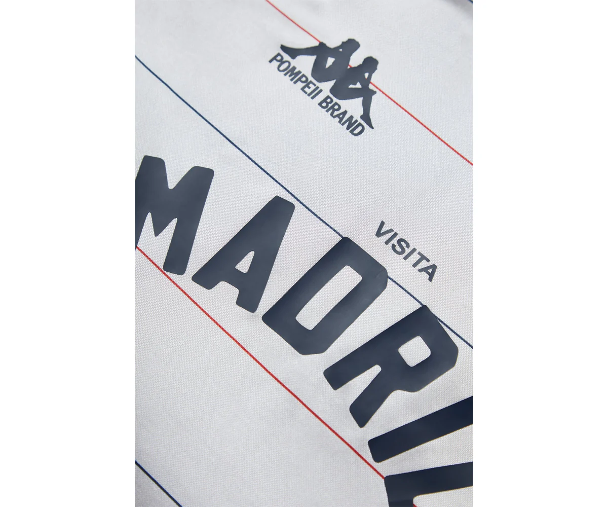 Divisa da trasferta del Pompeii Club de Fรบtbol, il club meglio vestito al mondo, in collaborazione con Kappa. Colletto polo, microriga orizzontale intrecciata su sfondo argento, sponsor “Visita Madrid” e l’iconica banda Omini sulla manica. Realizzata in poliestere con tecnologia “quick dry” per un’asciugatura rapida.
