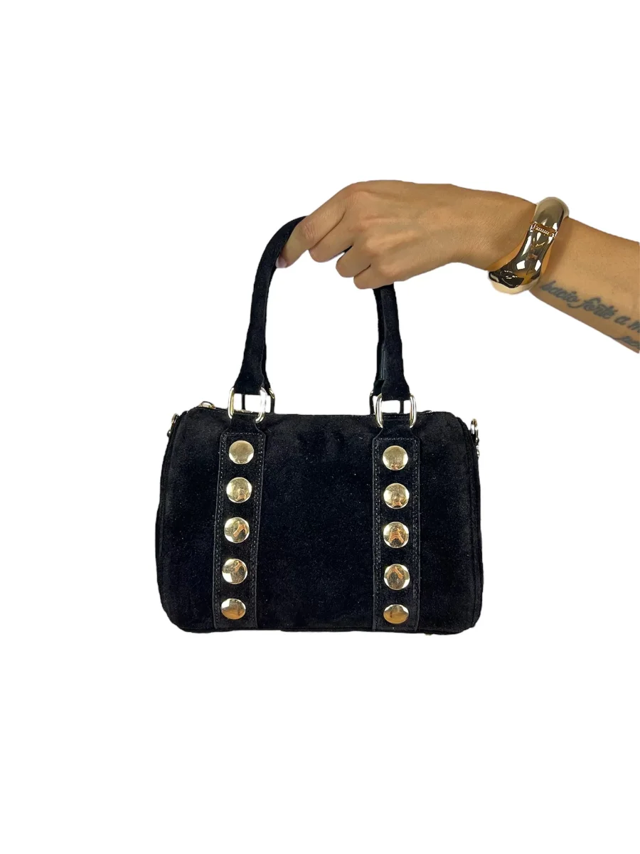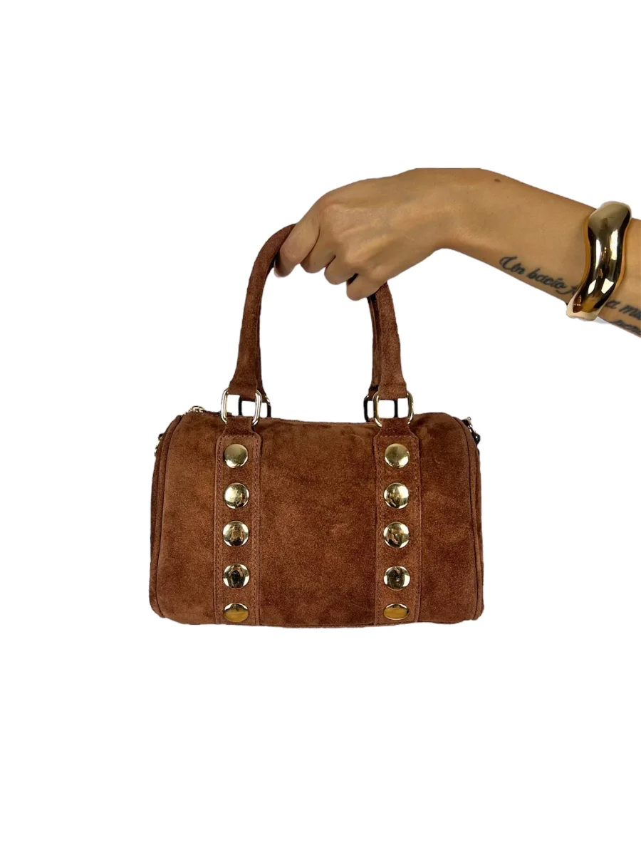 modello bauletto in camoscio con borchie color oroย frontali tasca interna con zip e chiusura con zip tracolla si regolabile colore tabacco,marrone,nero composizione 100%vera pelle 10%acciaio made in italy