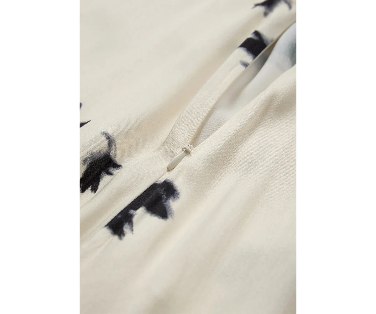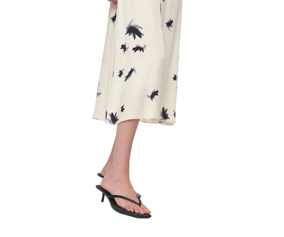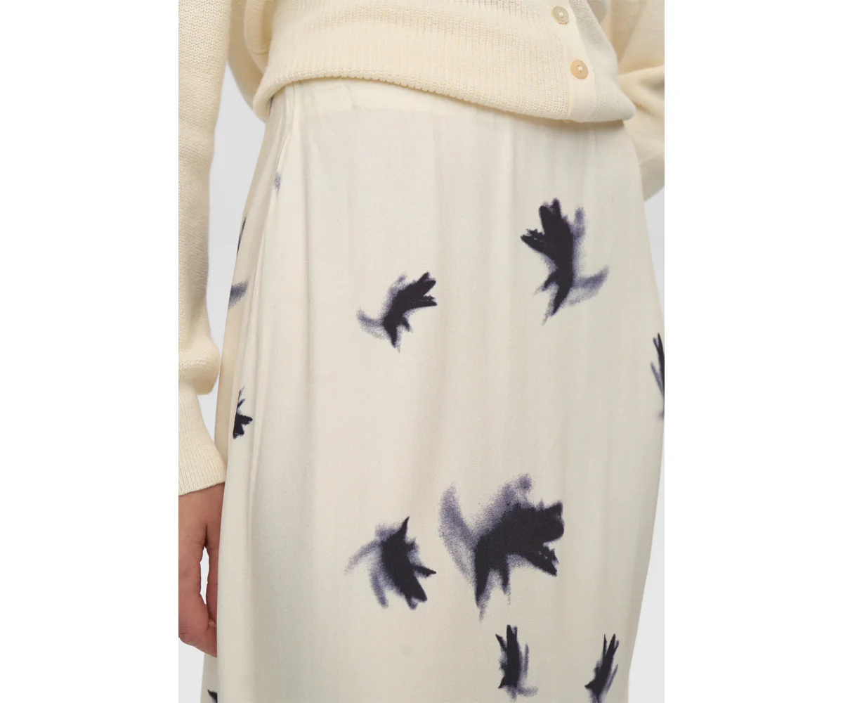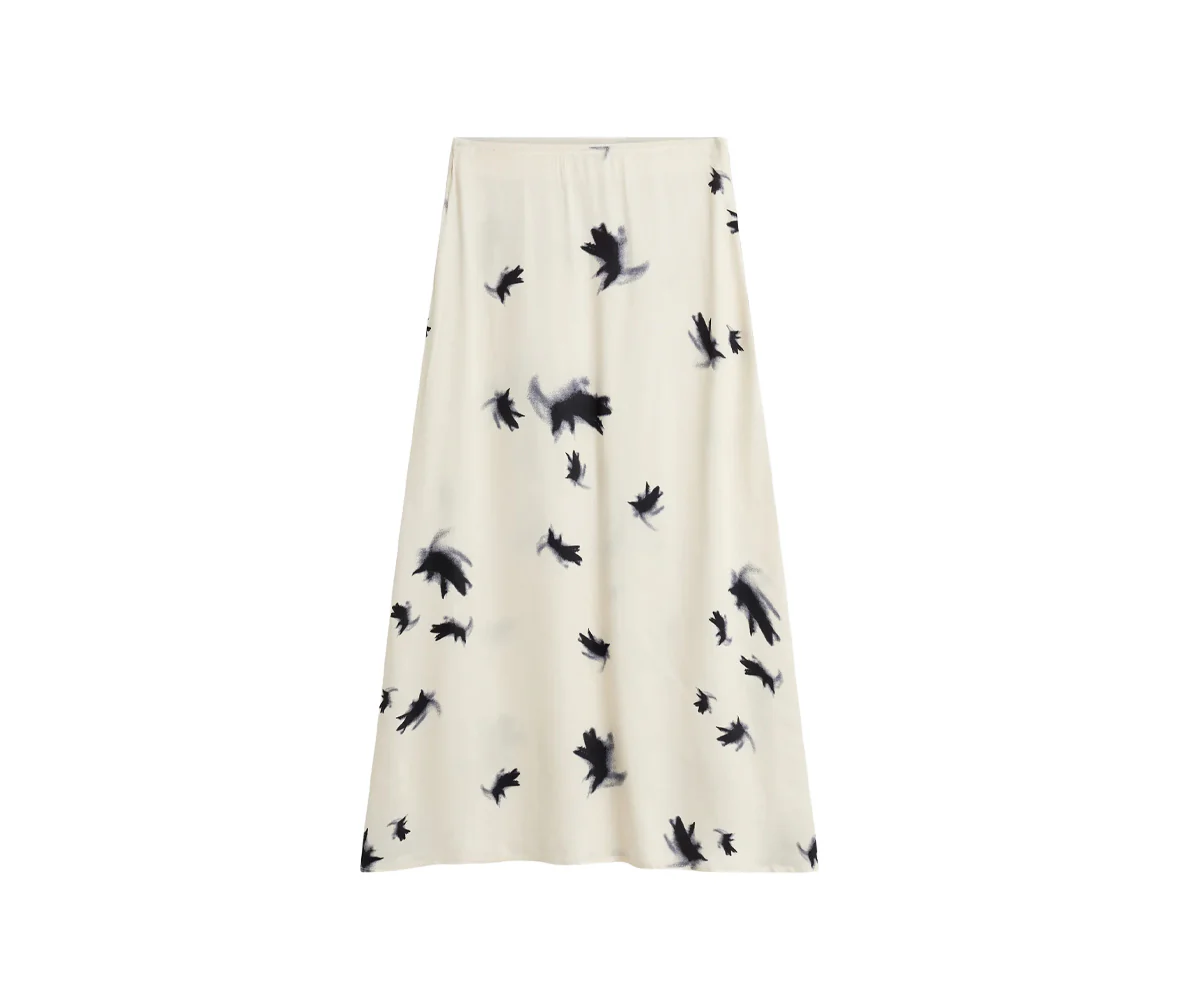 Elegante gonna di media lunghezza in viscosa stampata, con elastico in vita. Il tessuto รจ tagliato in sbieco per una vestibilitร piรน comoda.
