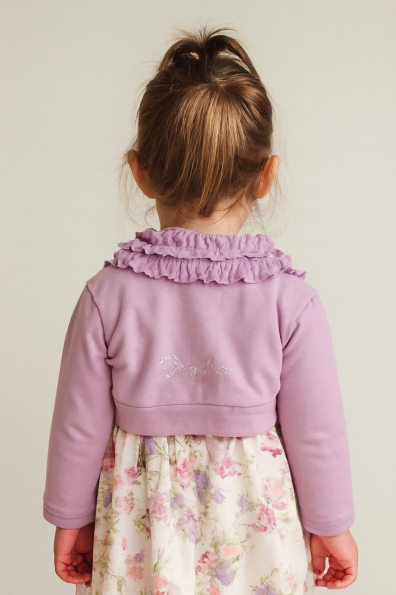 BIMBUSย COPRISPALLEย NEONATA BIMBUSย COPRISPALLEย NEONATA manica lunga con rouchesย al colletto e logo con strass sul retro. scaldacuore colore:ย lilla taglia: 12 mesi e 24 mesi composizione: 95% cotone, 5%ย elastico