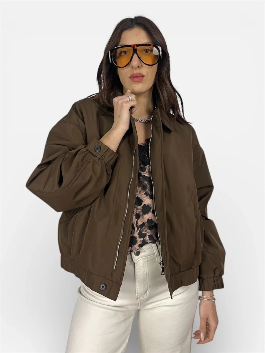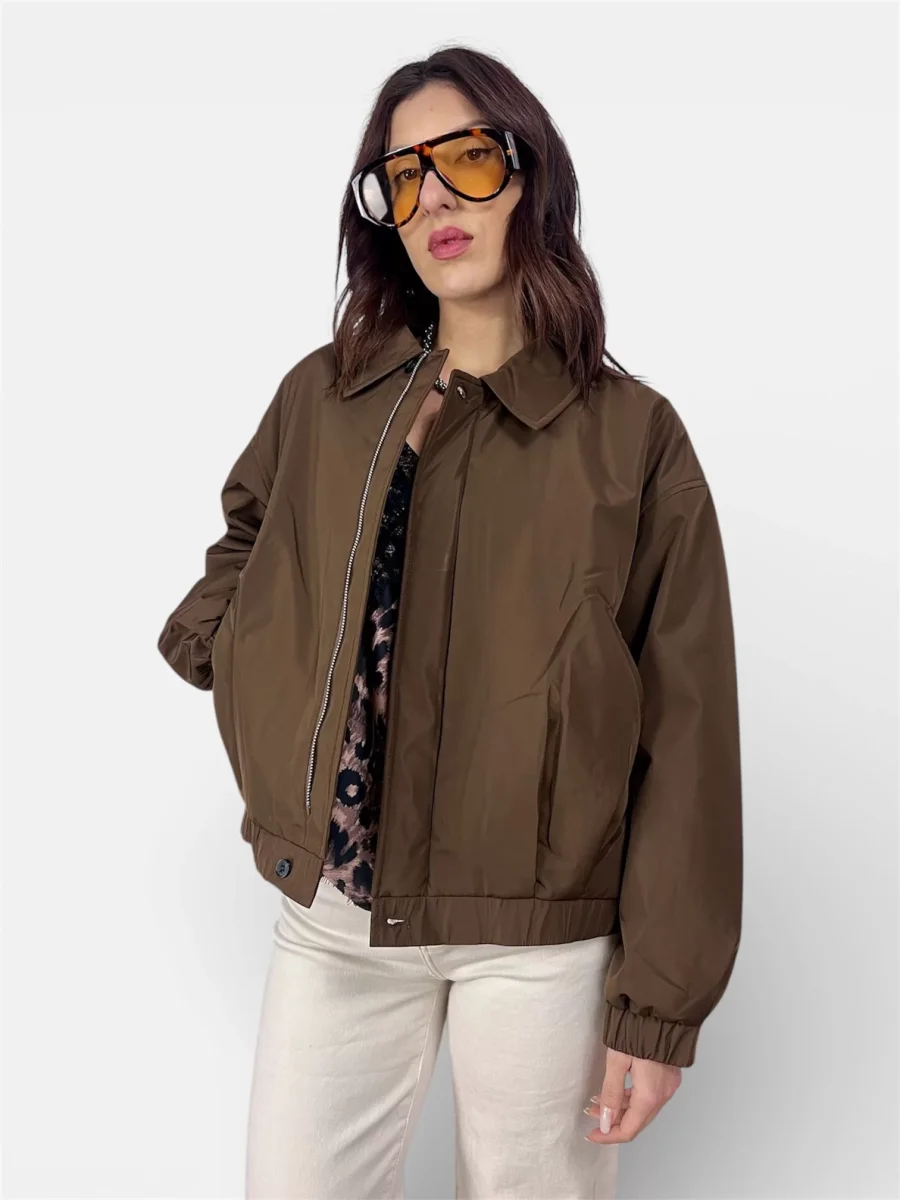 modello bomber acetato con colletto e tasche,zip e bottone agli estremi come chiusura vestibilitร regolare colore militare,moro composizione 100%polyestere made in italy la modella รจ una taglia 40 e veste la taglia s/m