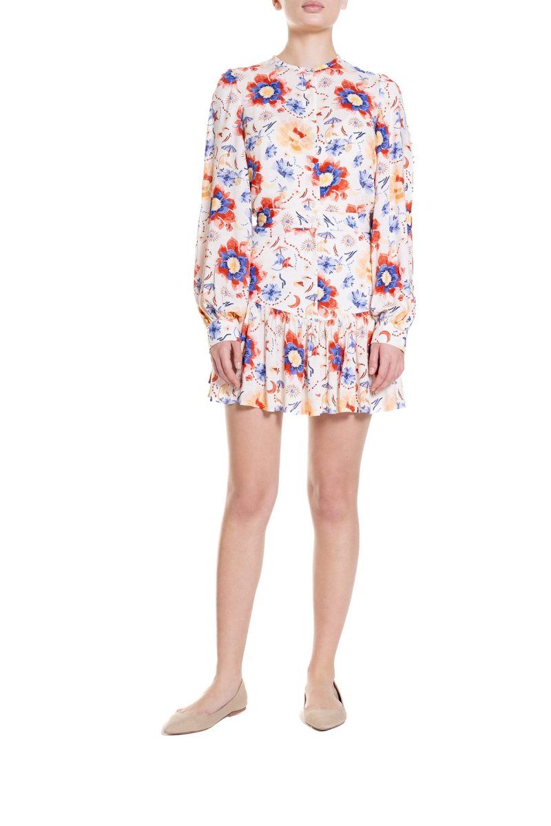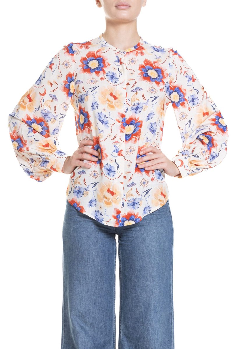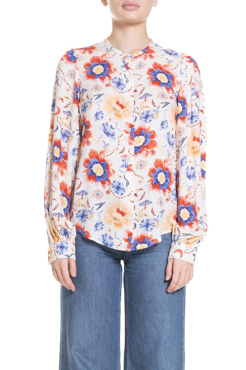 Gli essenziali di Poupine arricchiscono il guardaroba con capi eternamente chic, come questa camicia confezionata in morbido cotone o viscosa ed un elegante dipinto a mano colorato. Le maniche lunghe e leggermente a sbuffo, con polsini abbottonati, aggiungono un tocco romantico e sofisticato. La camicia ha una chiusura frontale con bottoni madreperla e un taglio leggermente svasato che si adatta comodamente alla figura, rendendola ideale per la stagione primaverile o estiva. Abbina questa camicia con dei pantaloni Poupine o una gonna a vita alta per un look elegante e raffinato.
