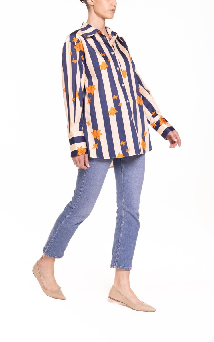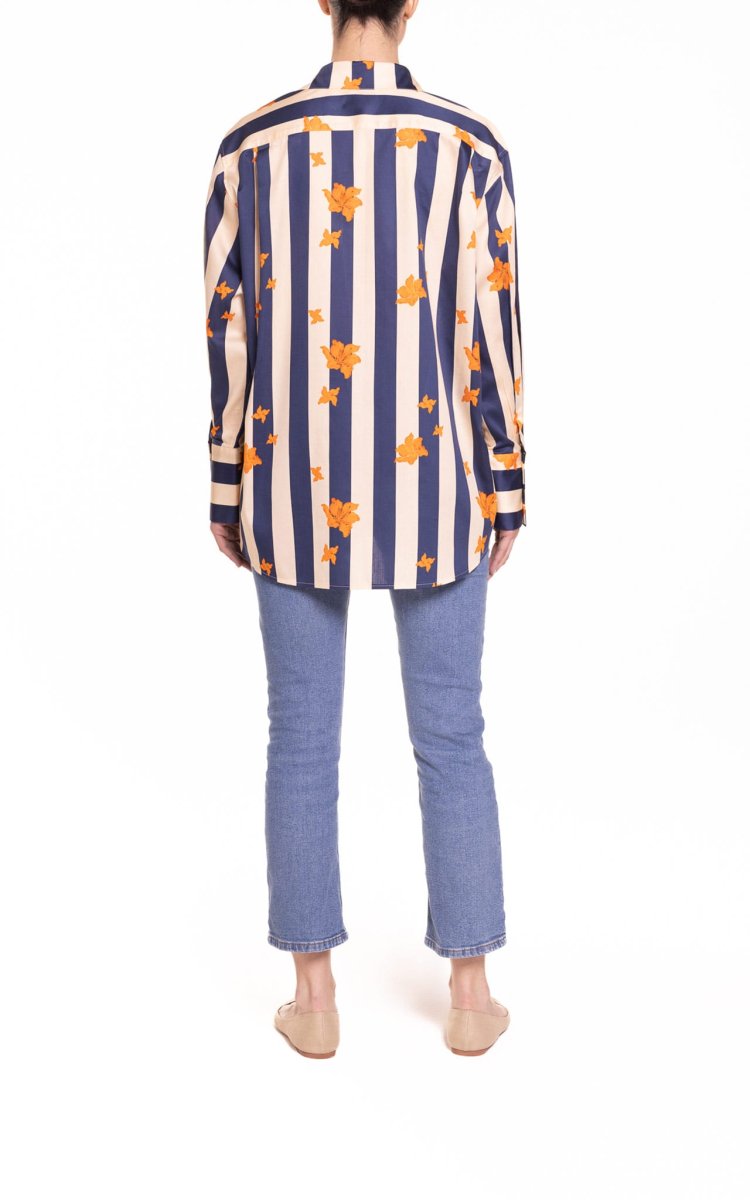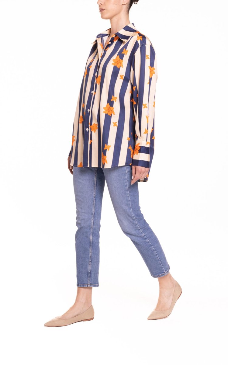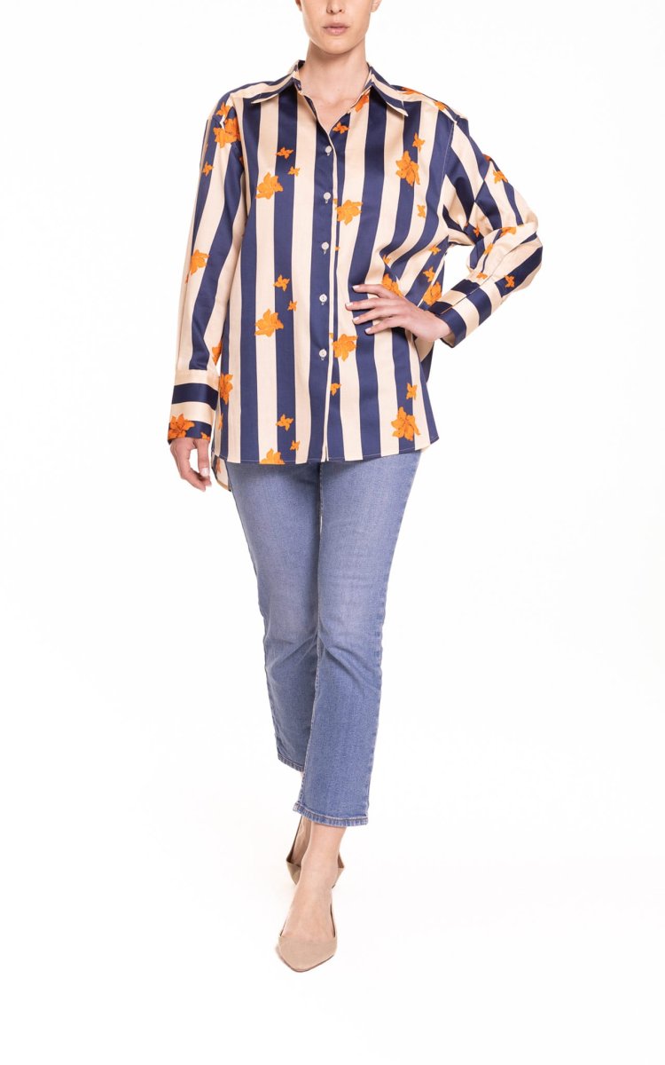 Camicia oversize riga blu e panna con fiore arancio