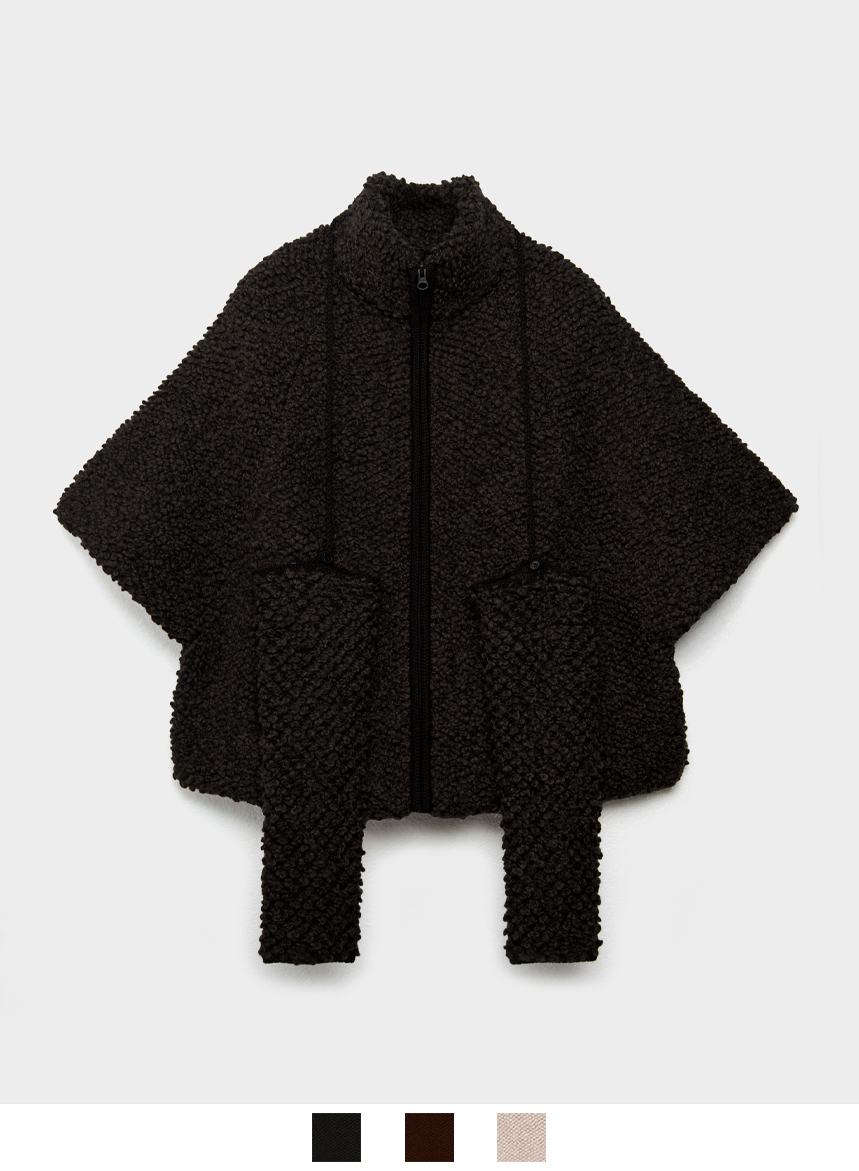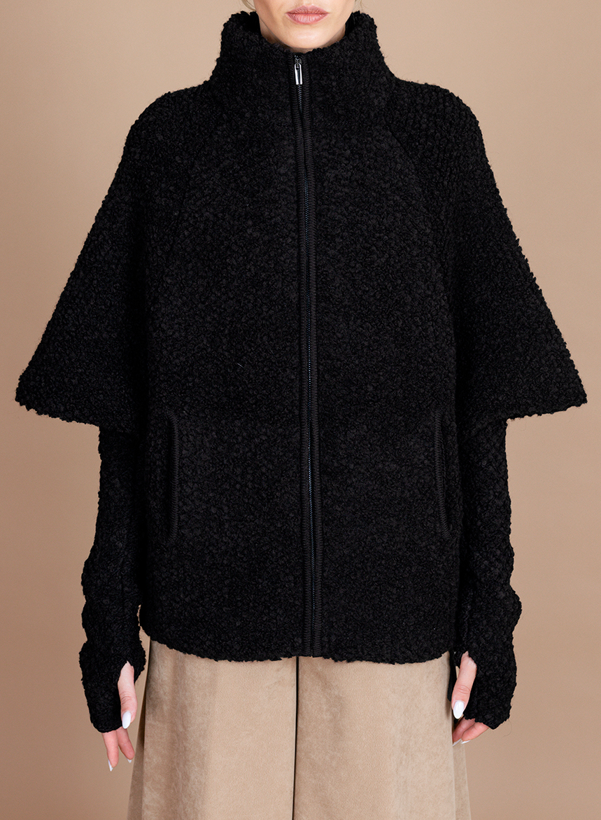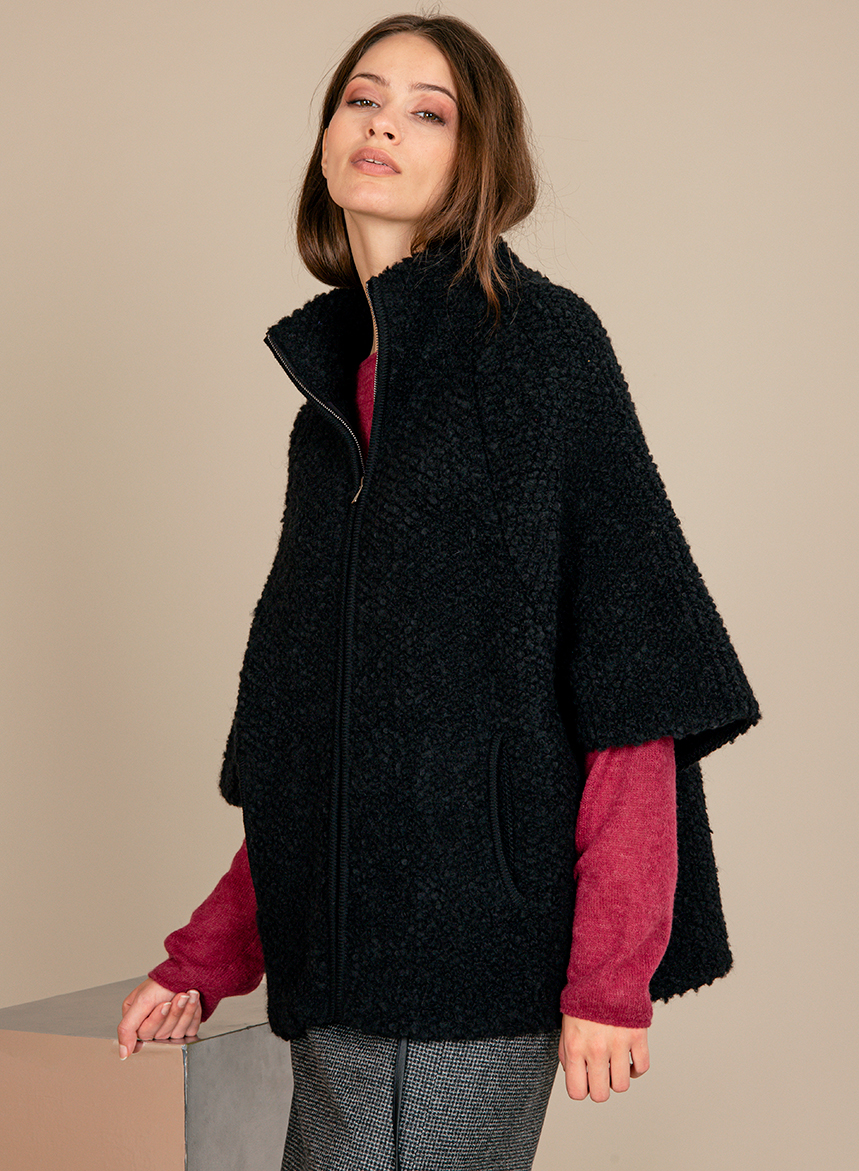 Cappa di maglia in lana ed alpaca lavorato a punto pelliccia. Chiusura anteriore con zip a mono cursore, collo alto e manicotti in coordinato. Tasche anteriori. Capo sfoderato. Il progetto Ethical Fur nasce dall’amore e dal rispetto per la natura. Realizzato con un filato in Lana e Alpaca superfine, questo capo unisce morbidezza e volume, evocando la pelliccia animale in modo etico.