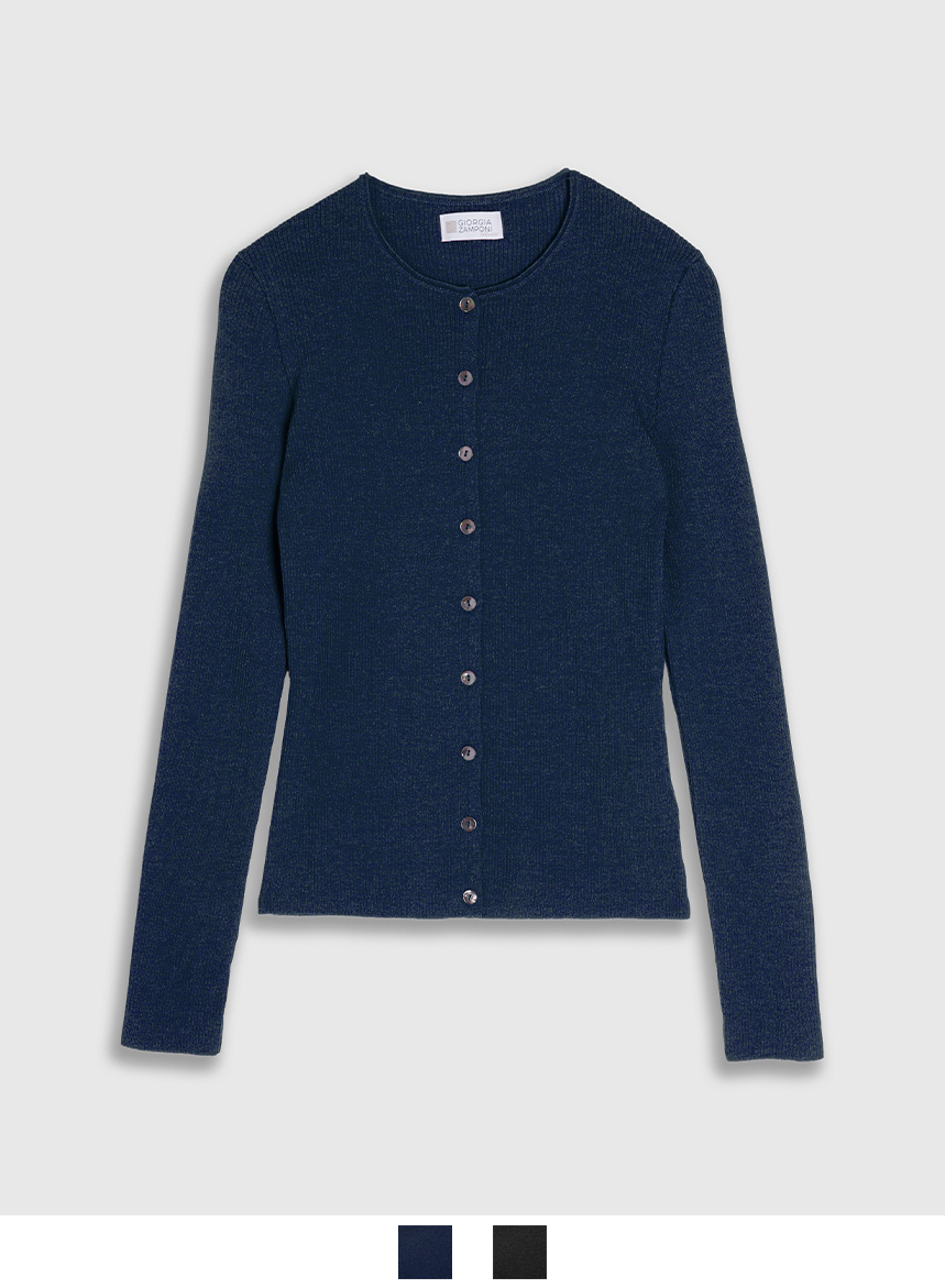 Cardigan di maglia a coste fini in Lana, Seta e Cashmere, dalla linea fit. Scollo a giro con allacciatura anteriore con bottoni di madreperla. Un filato pregiato ed all season, impreziosito della Seta, unito allโ€™elasticitร  della Lana ed al calore del Cashmere. Il connubio di queste fibre naturali nobili mantiene costante la temperatura del corpo indipendentemente dalle variazioni del clima esterno. I capi sono morbidi e garantiscono la traspirazione della pelle.