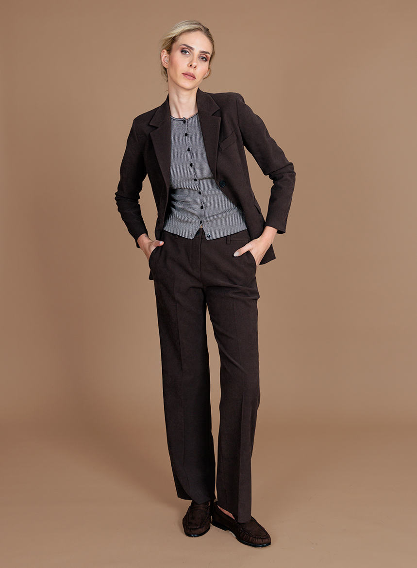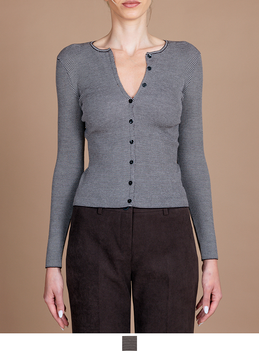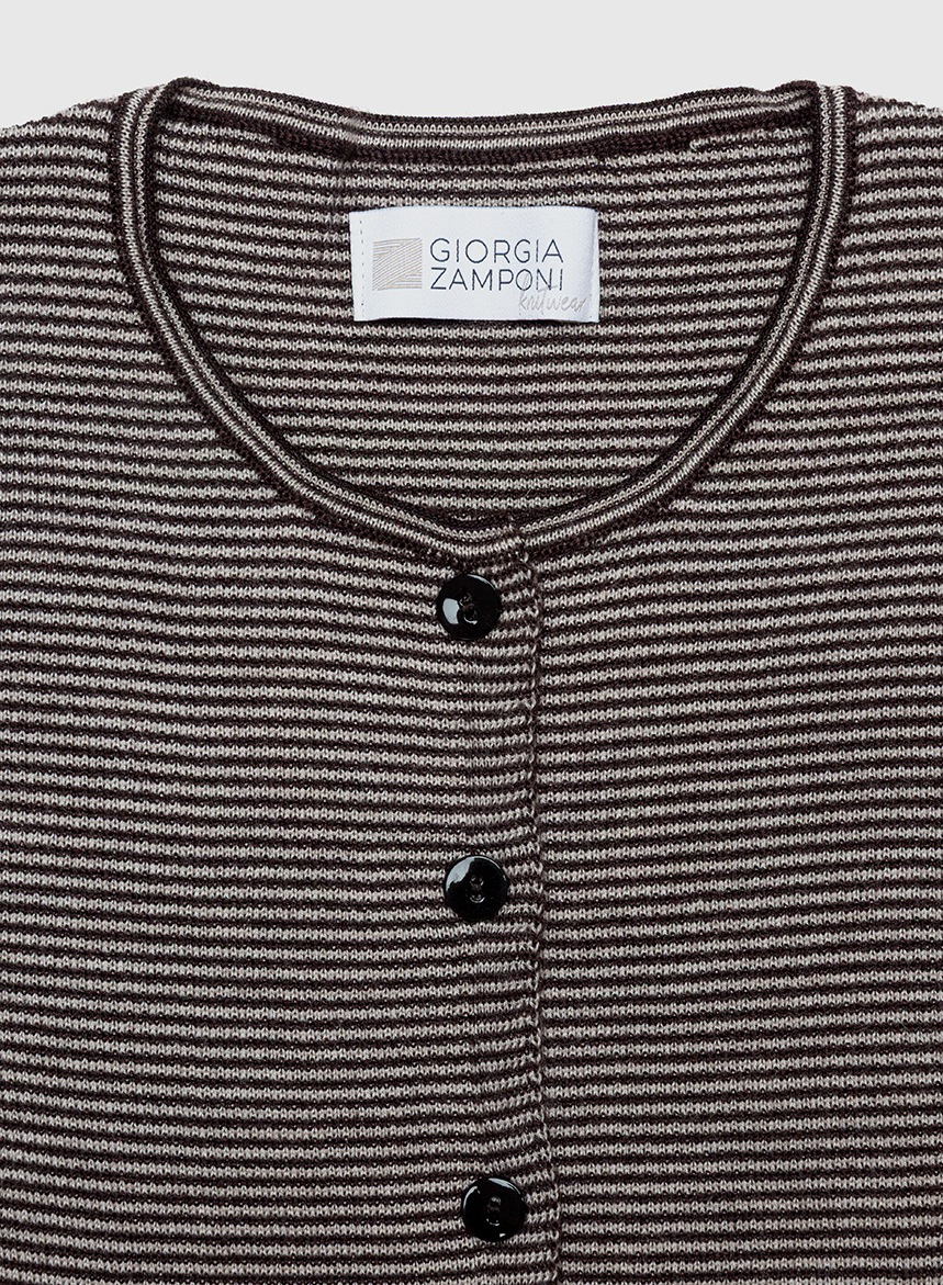 Cardigan di maglia a coste fini in Lana, Seta e Cashmere, dalla linea fit. Scollo a coreana con allacciatura anteriore con bottoni di madreperla. Un filato pregiato ed all season, impreziosito della Seta, unito allโelasticitร della Lana ed al calore del Cashmere. Il connubio di queste fibre naturali nobili mantiene costante la temperatura del corpo indipendentemente dalle variazioni del clima esterno. I capi sono morbidi e garantiscono la traspirazione della pelle. La modella รจ alta 178 cm e veste una taglia M.