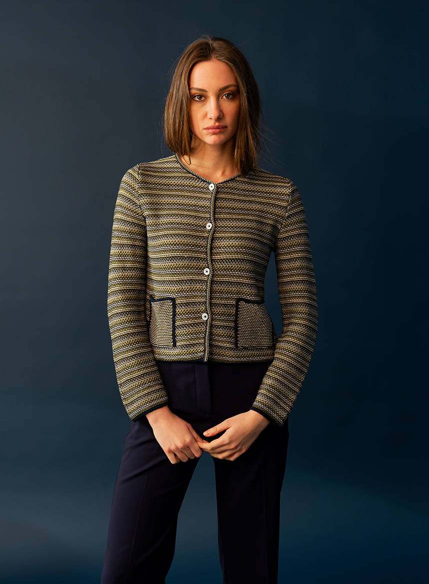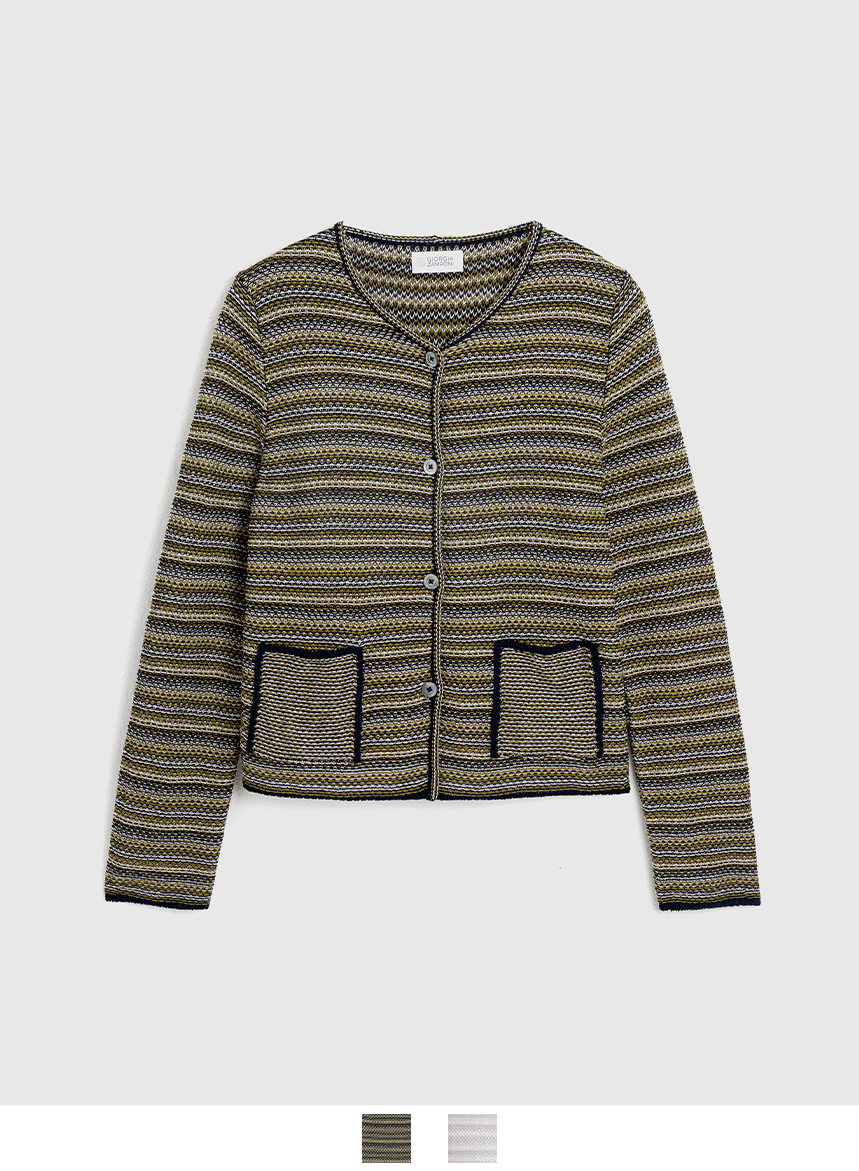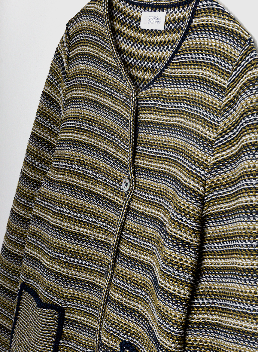 Cardigan di maglia in cotone biologico con lavorazione a piquรฉ rigato. Scollo a giro, maniche lunghe e tasche applicate. Il filato adoperato per questo capo รจ una fibra naturale proveniente da agricoltura biologica con certificazione GOTS, uno standard internazionale che garantisce una produzione sostenibile lungo tutta la filiera. La modella รจ alta 175 cm e indossa una taglia S/M.