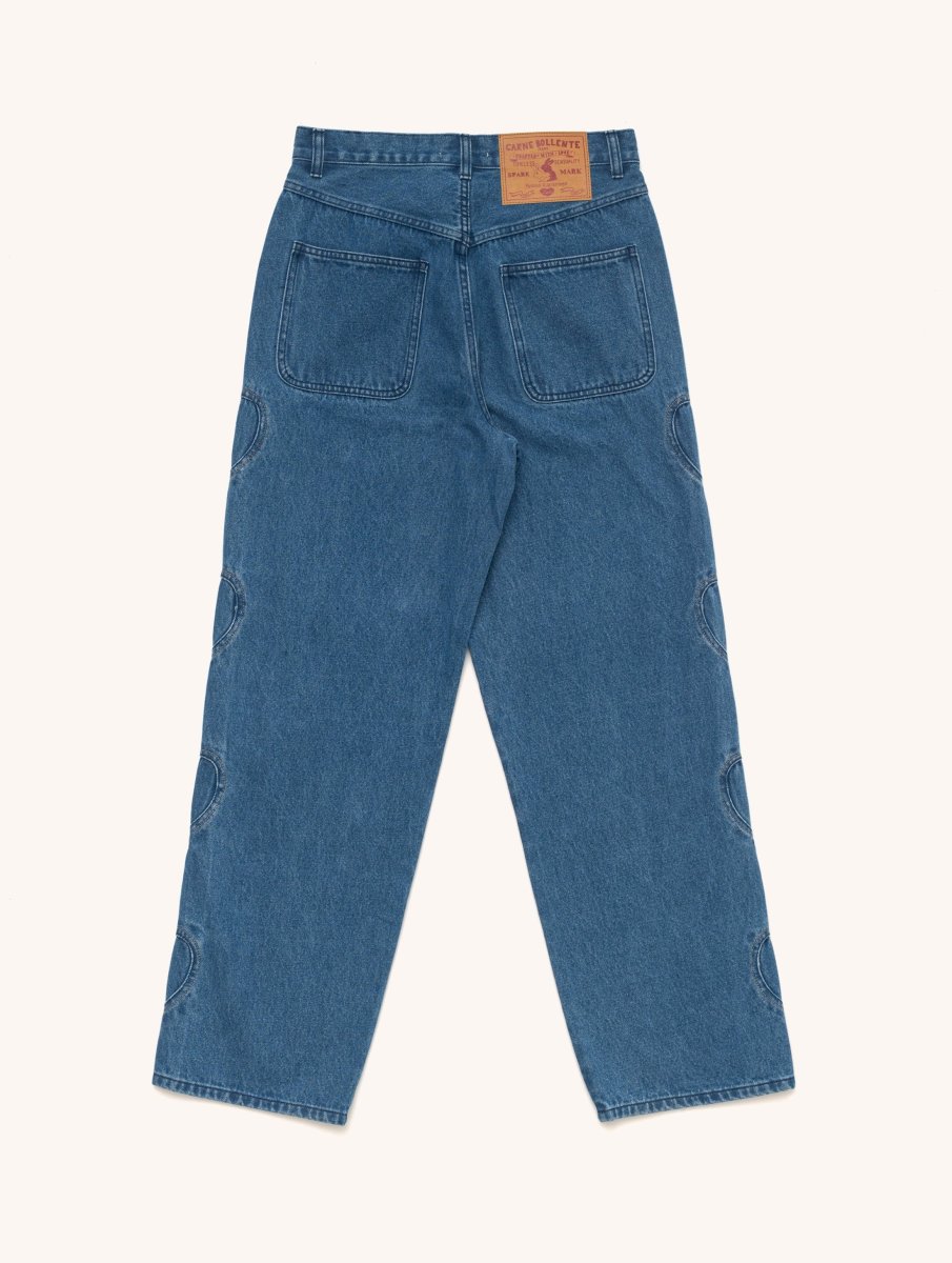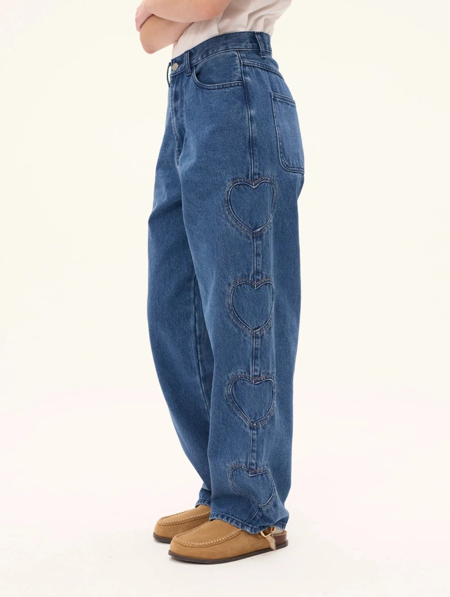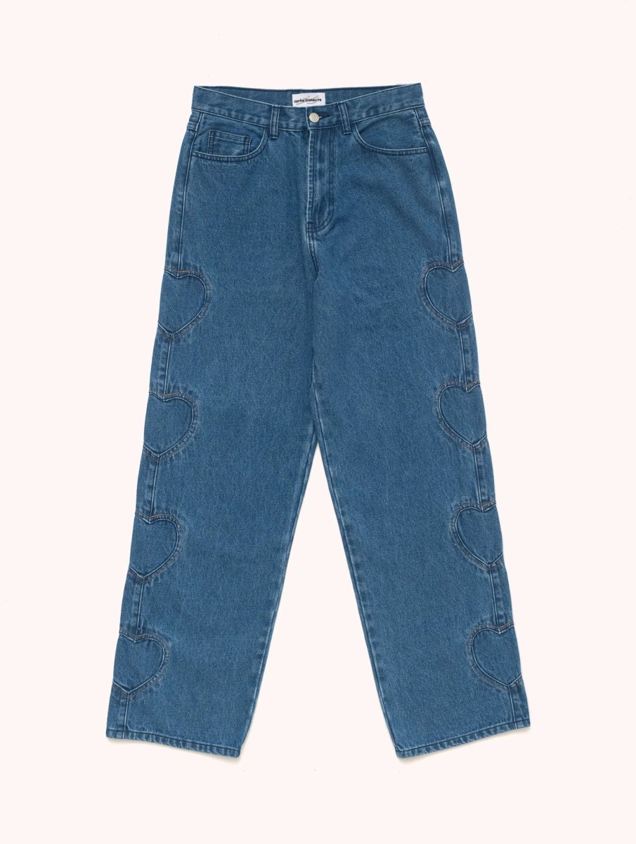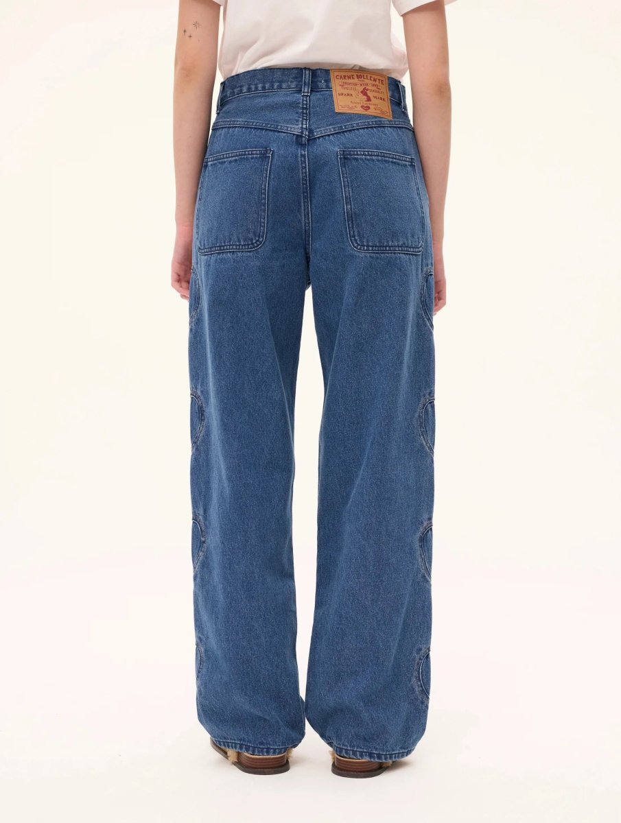 Denim a vita alta con ricamo, chiusura con zip e bottone. 100% organic cotton. SS25DP031.