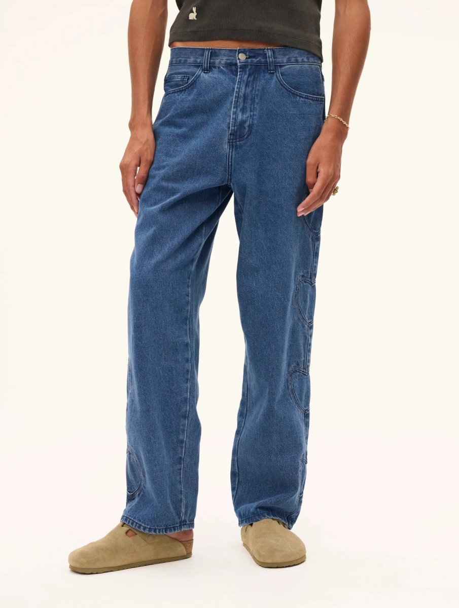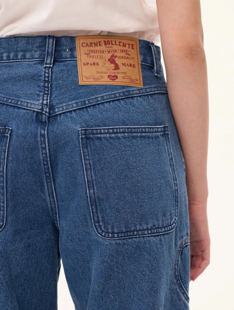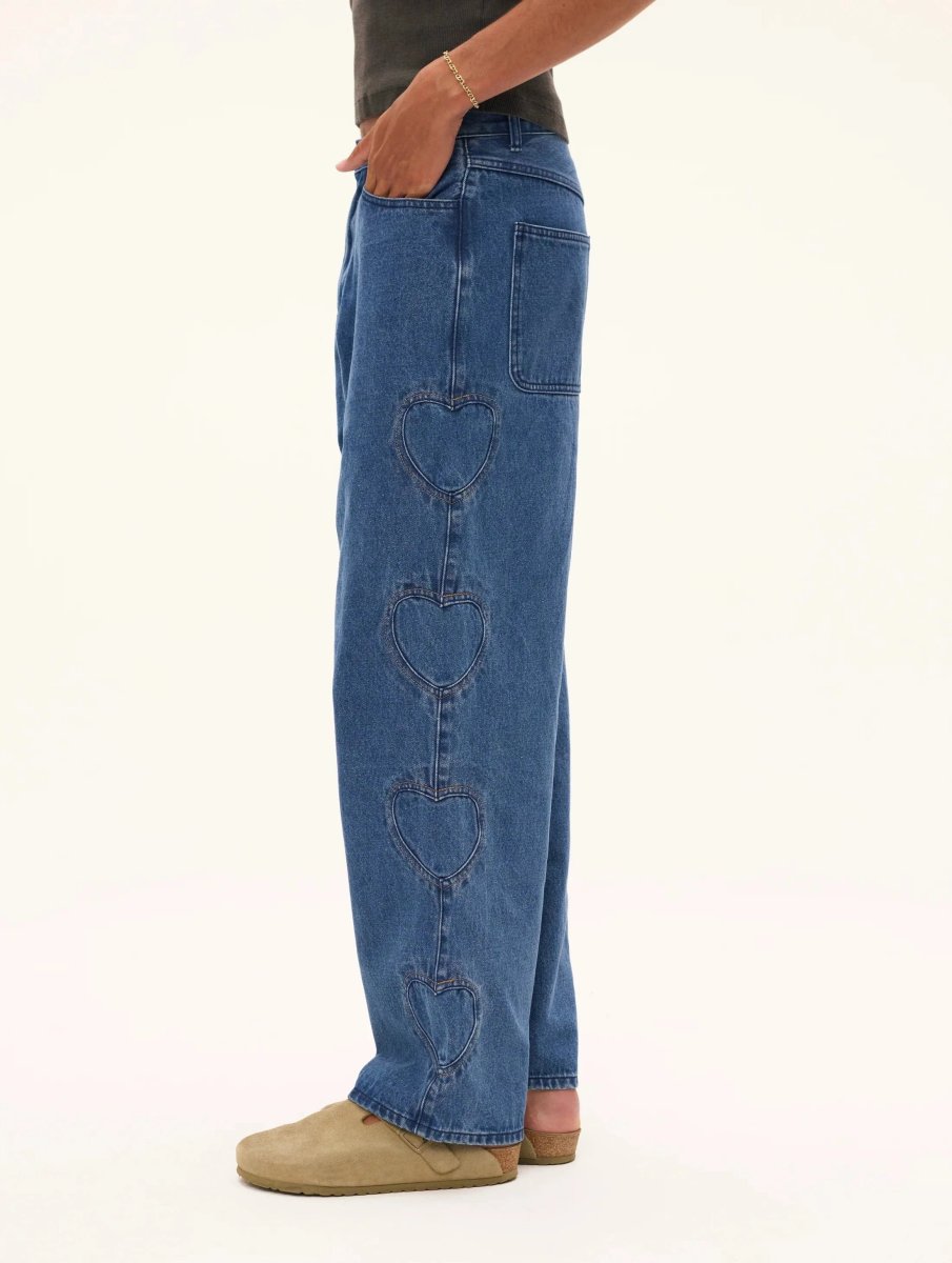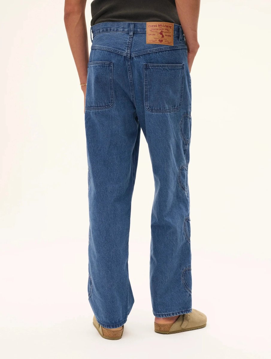 Denim a vita alta con ricamo, chiusura con zip e bottone. 100% organic cotton. SS25DP031.