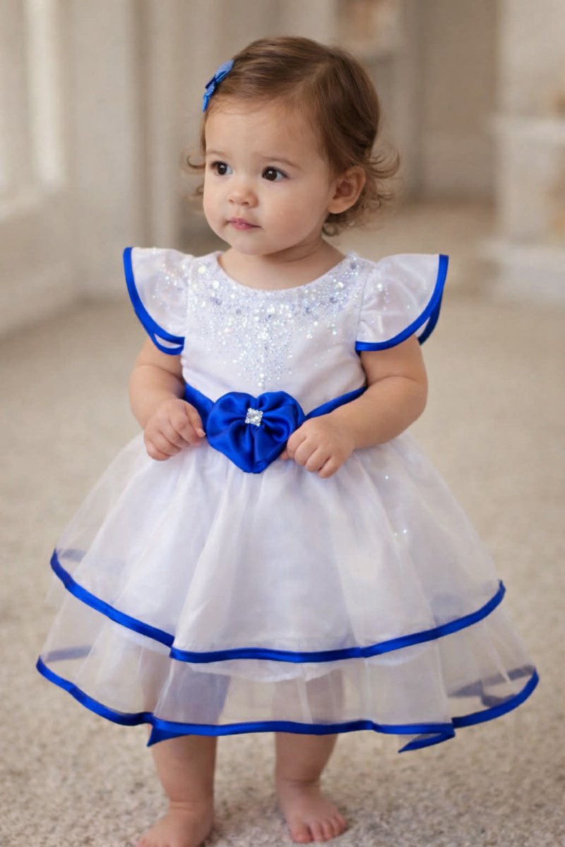 CERIMONIA ABITO NEONATA CERIMONIA ABITO NEONATA manica ad aletta, Chiusura sul retro con zip, foderato allโinterno. applicazione strass sulla pettorina. cintura applicata con fiocco sul retro colore:ย bianco con rifiniture royal taglia: 9-12ย mesi, 18-24 mesi, 24-36mesi composizione: 100%ย poliestere
