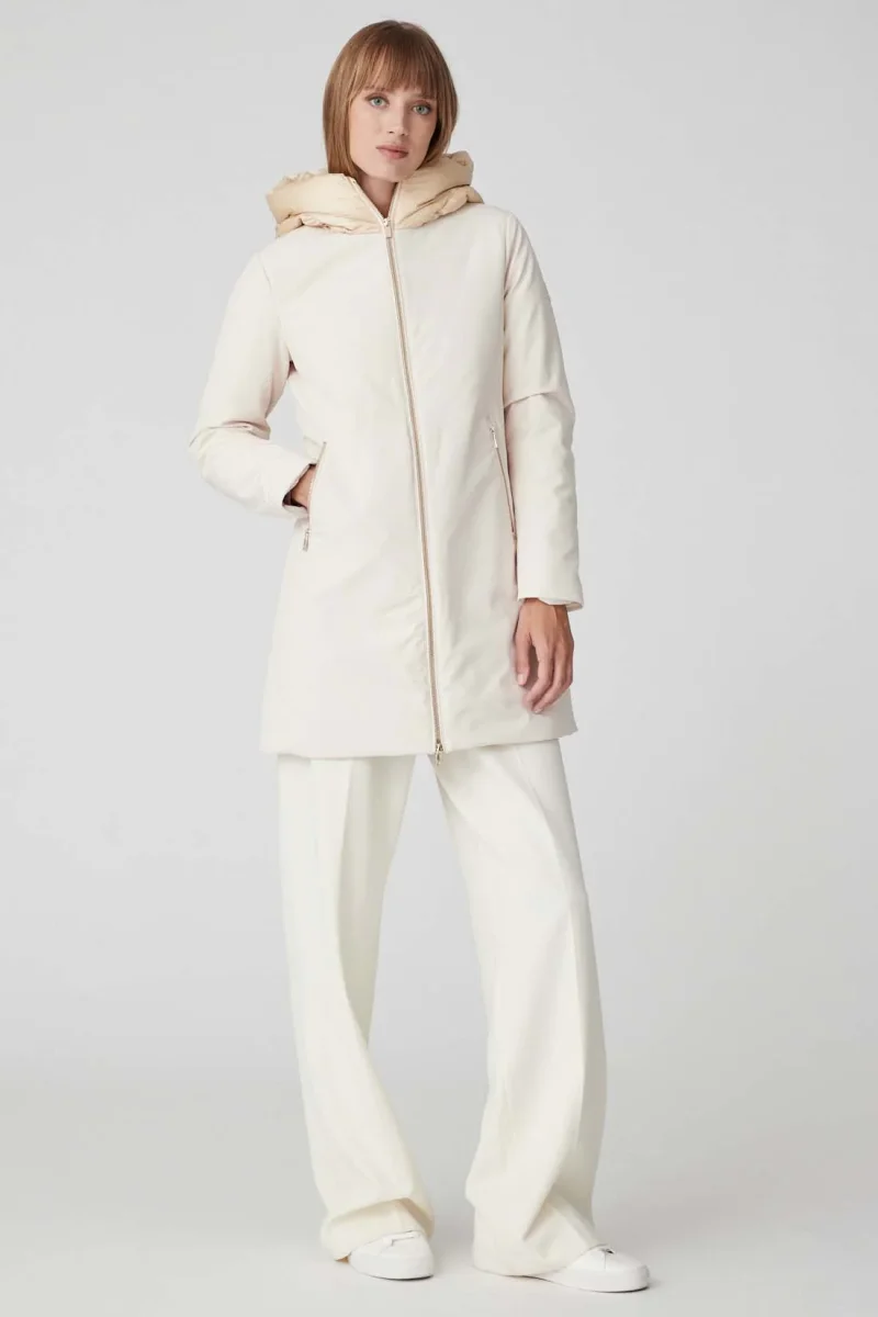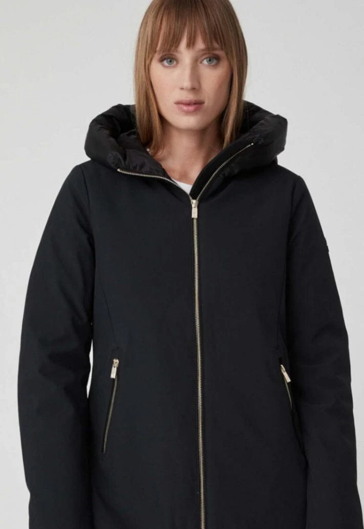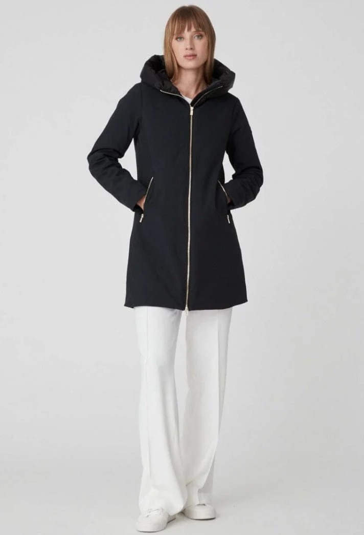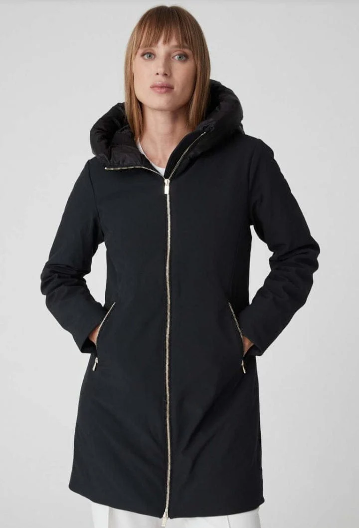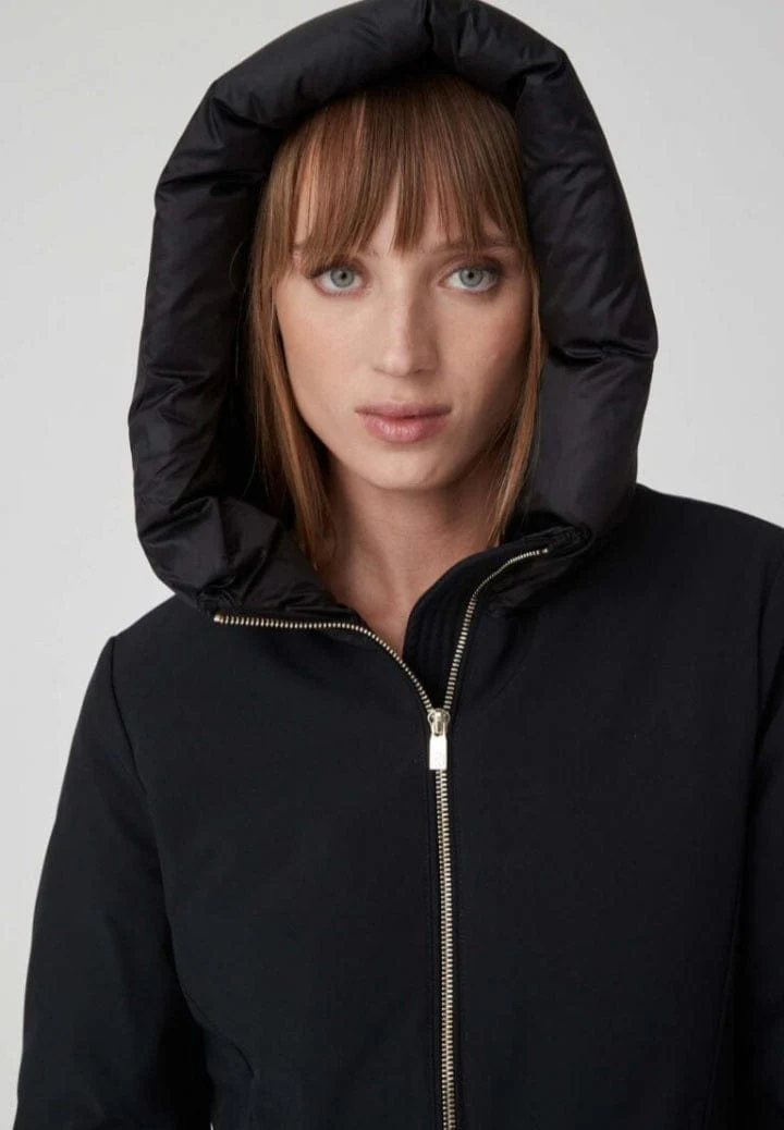 Piumino con cappuccio imbottito con vera piuma certificata 90/10. Realizzato in tessuto softshell triplo strato resistente allโacqua ed alle condizioni climatiche avverse.