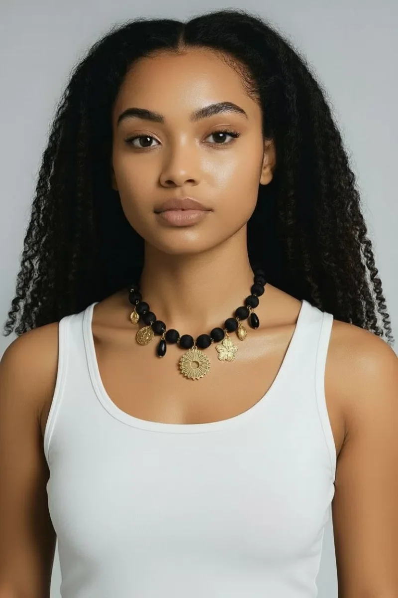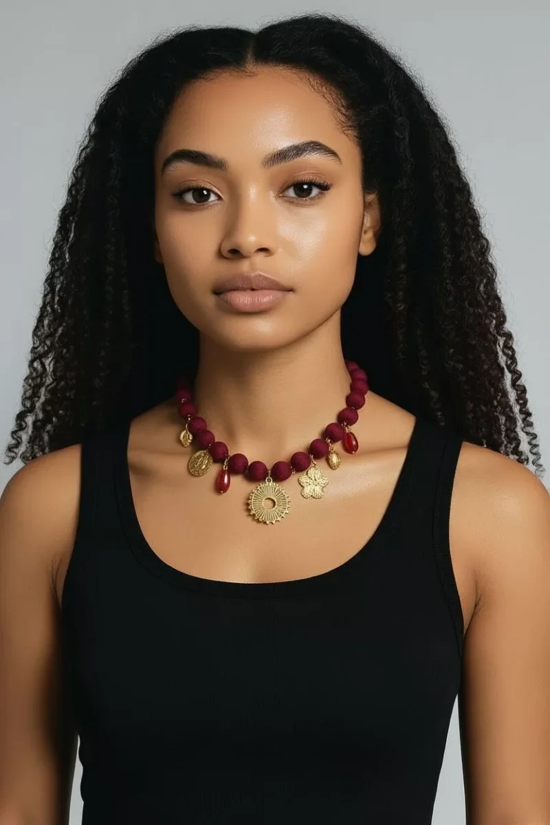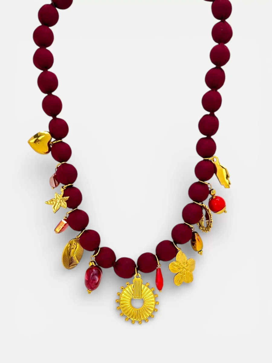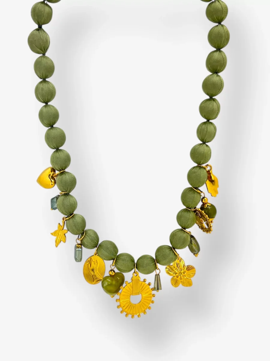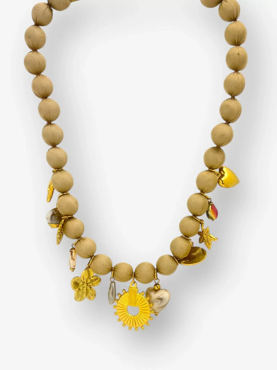 ย Il gioiello si distingue per le sue sfere rivestite in pregiato tessuto nylon, che regalano una texture morbida e un aspetto sofisticato. Ad arricchire la composizione, una selezione diย ciondoli in acciaio doratoย dalle forme variegate โ come cuori, fiori e motivi solari โ che aggiungono un tocco di luce e personalitร al tuo look. Pratica e sicura, laย chiusura a moschettone garantisce una vestibilitร ottimale. Design:ย Girocollo artigianale con charm pendenti. Materiali:ย Sfere in nylon, pendenti in acciaio dorato. Chiusura:ย Moschettone in acciaio. Colori disponibili:ย Beige, Nero, Vino (Bordeaux) e Salvia. Origine:ย 100% Made in Italy.