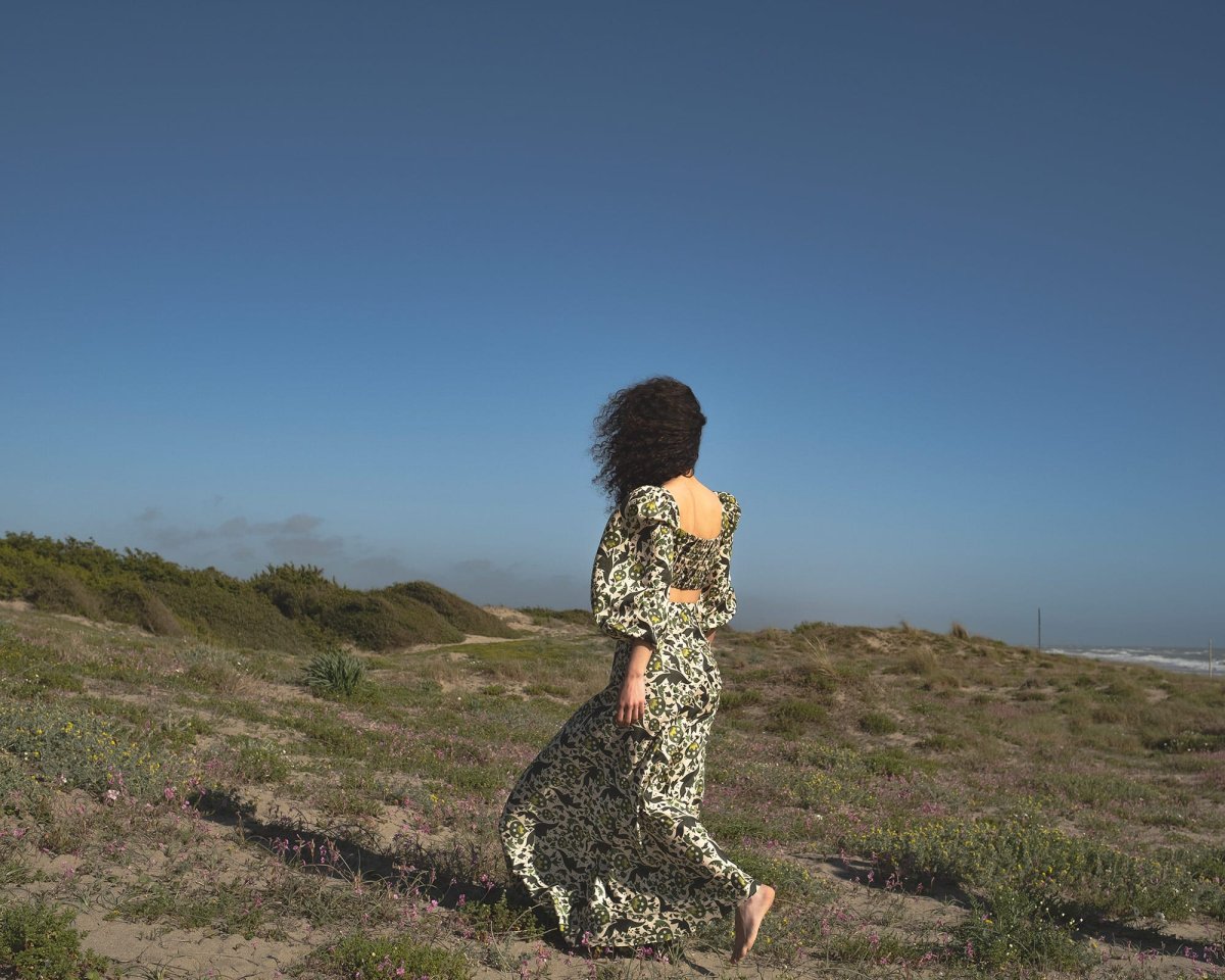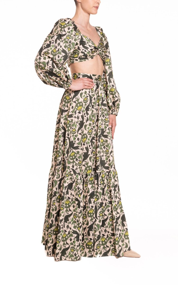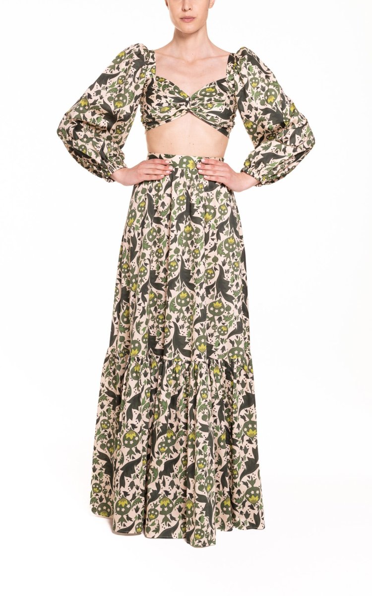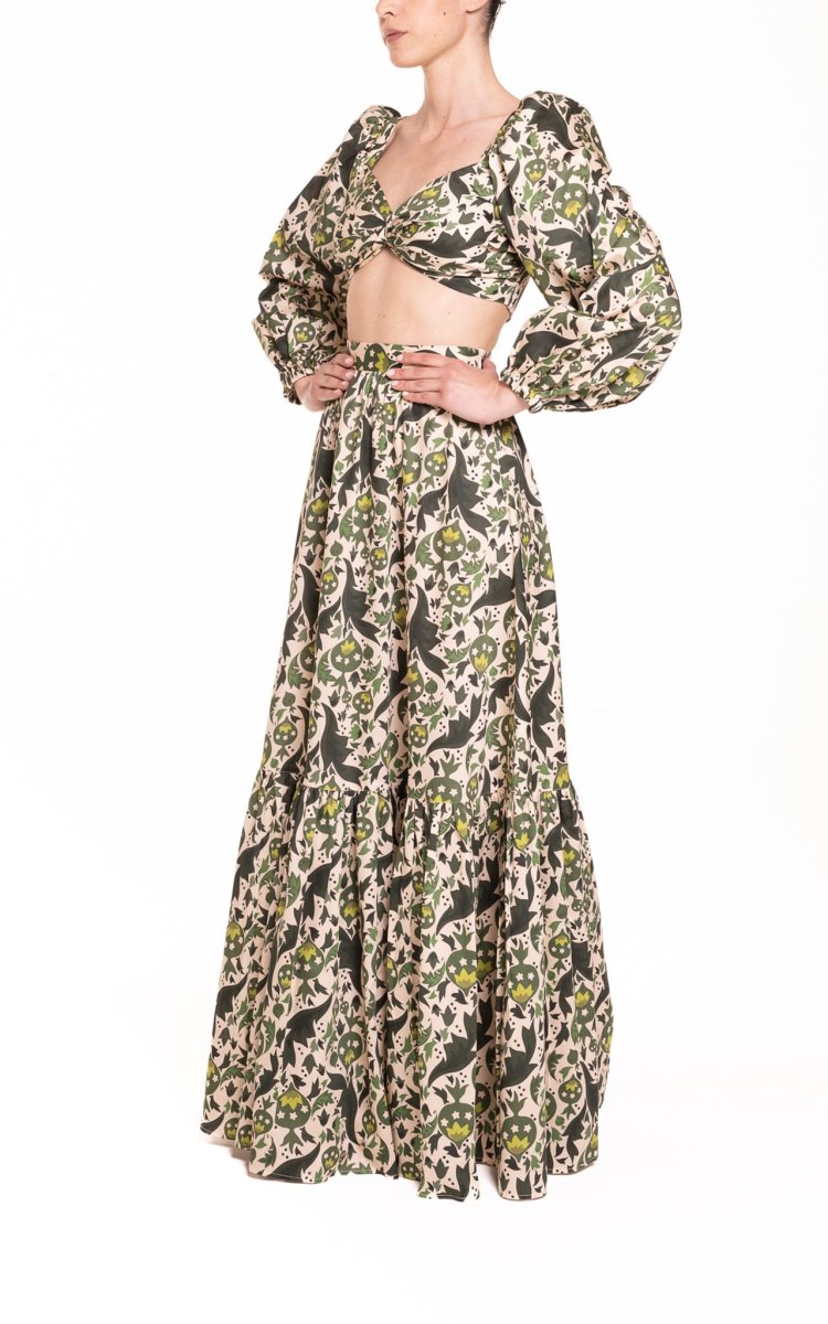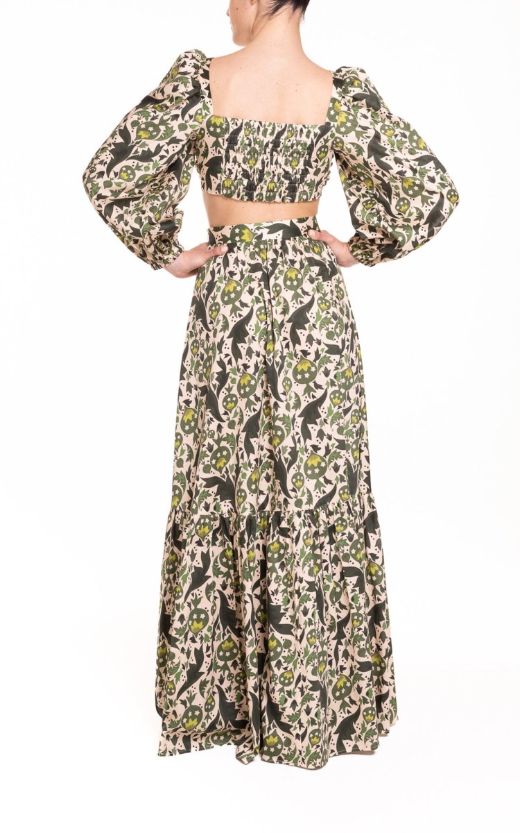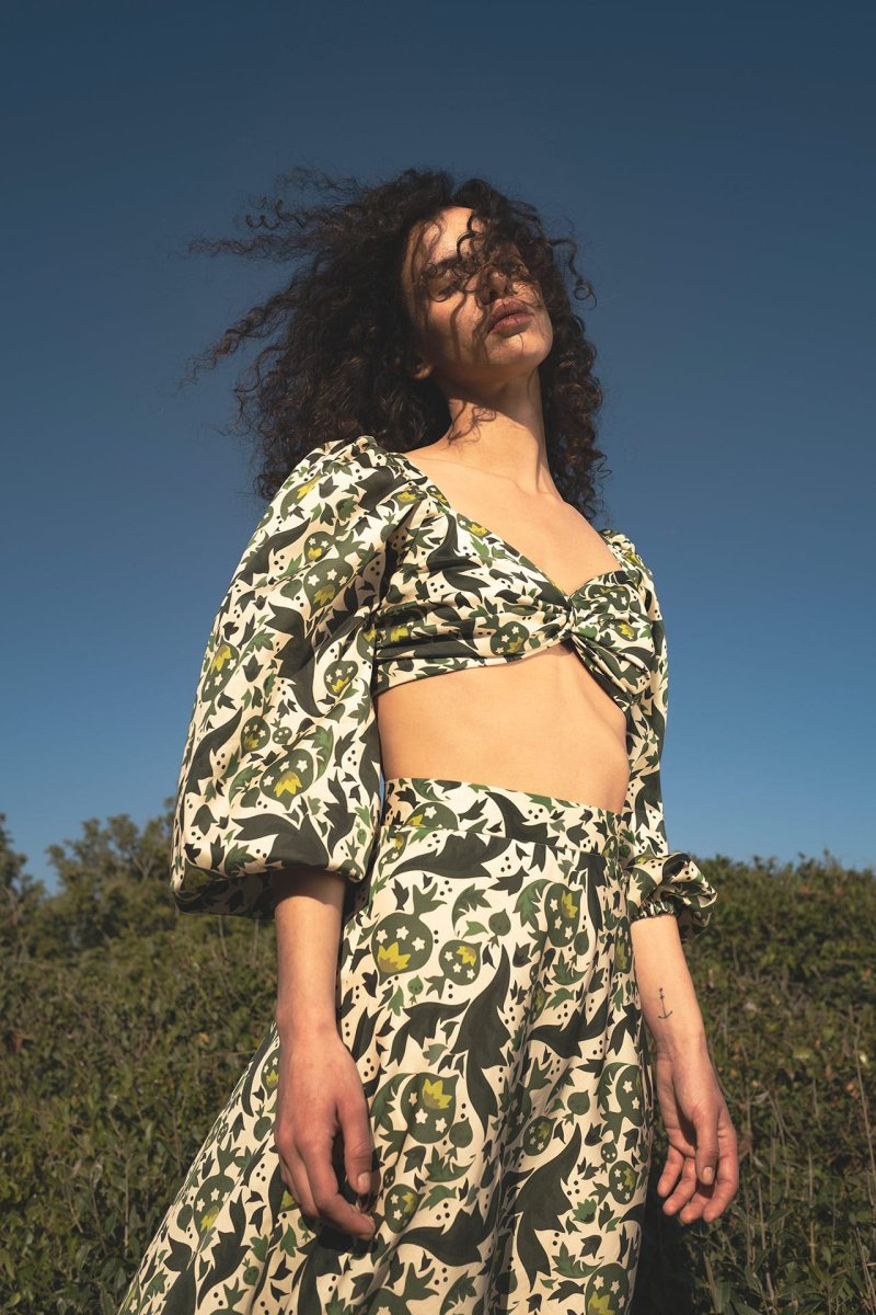 Crop top con maniche a sbuffo fantasia verde con melograni
