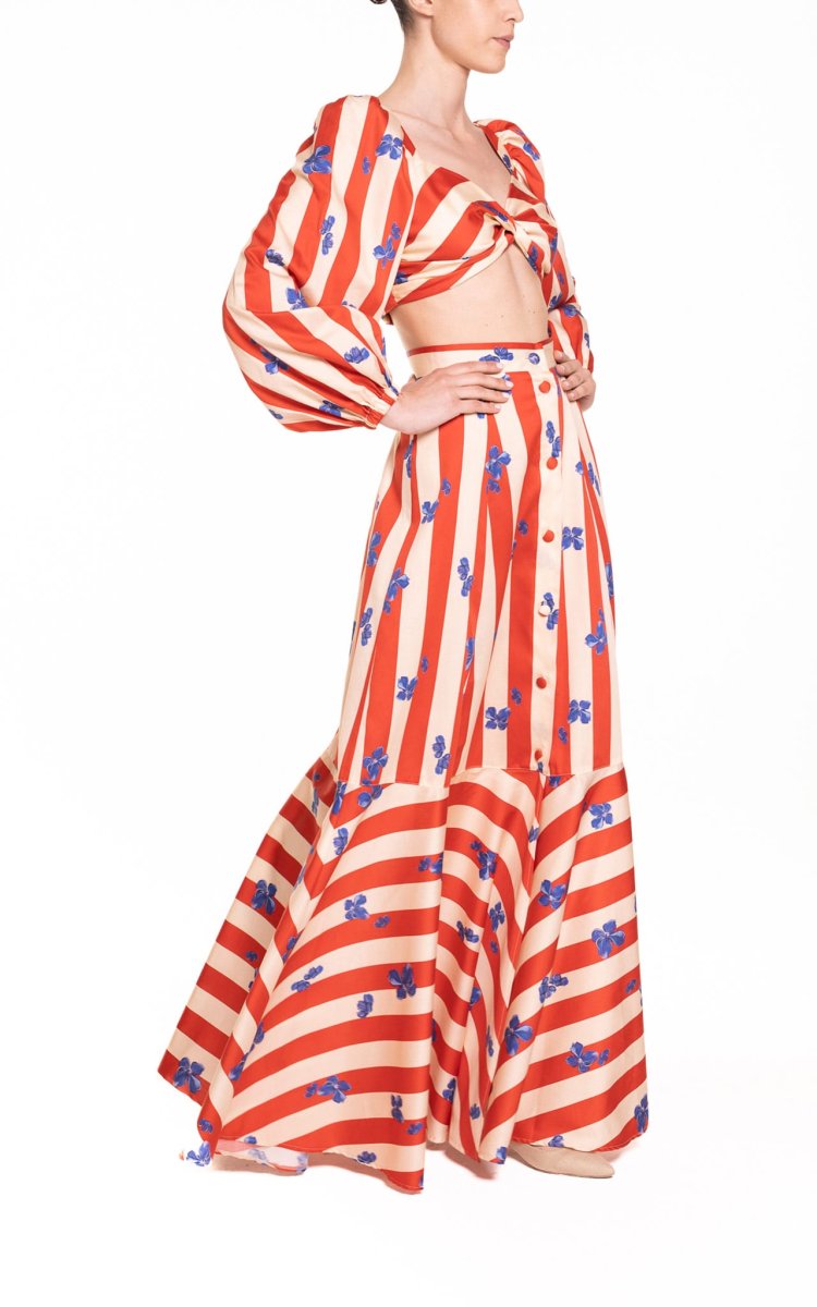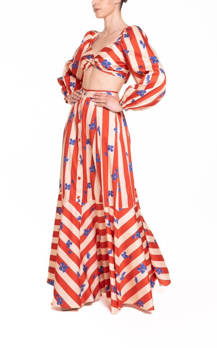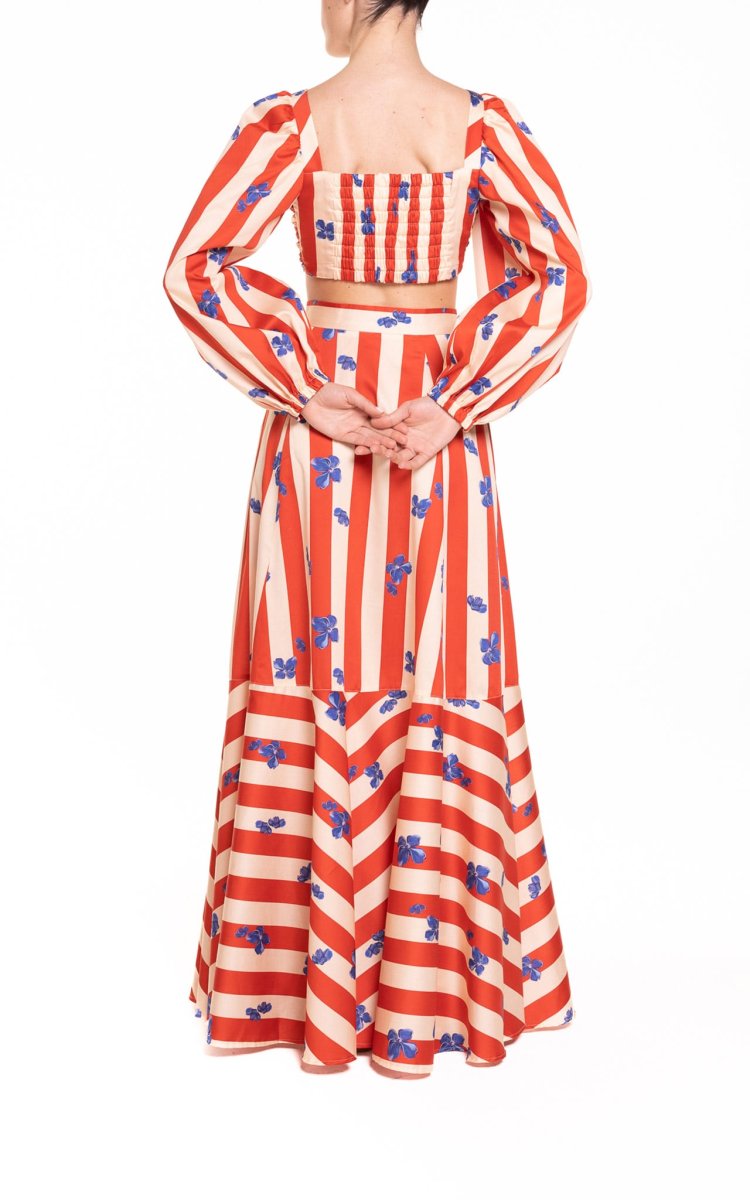 Crop top con maniche a sbuffo riga rosso e panna con fiore bluette