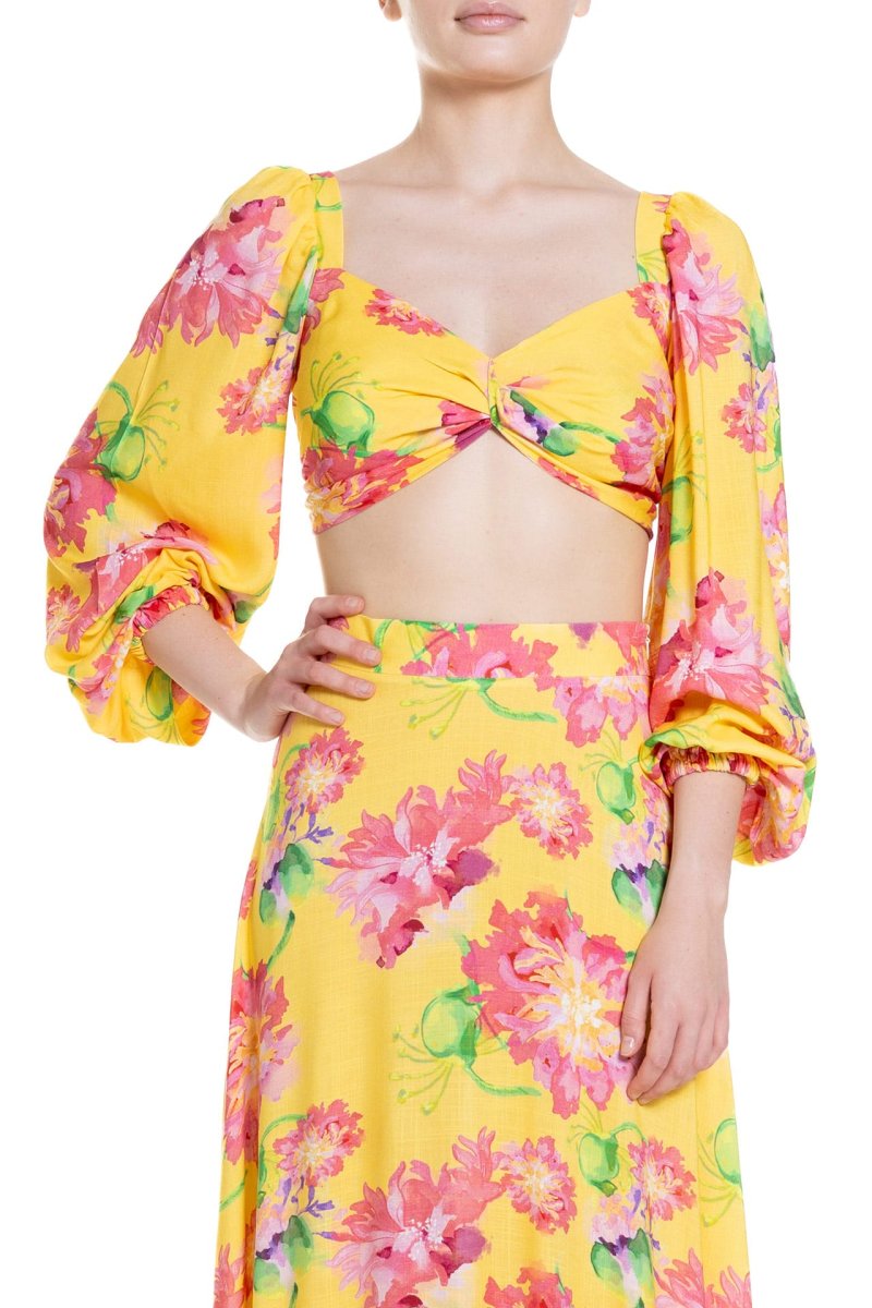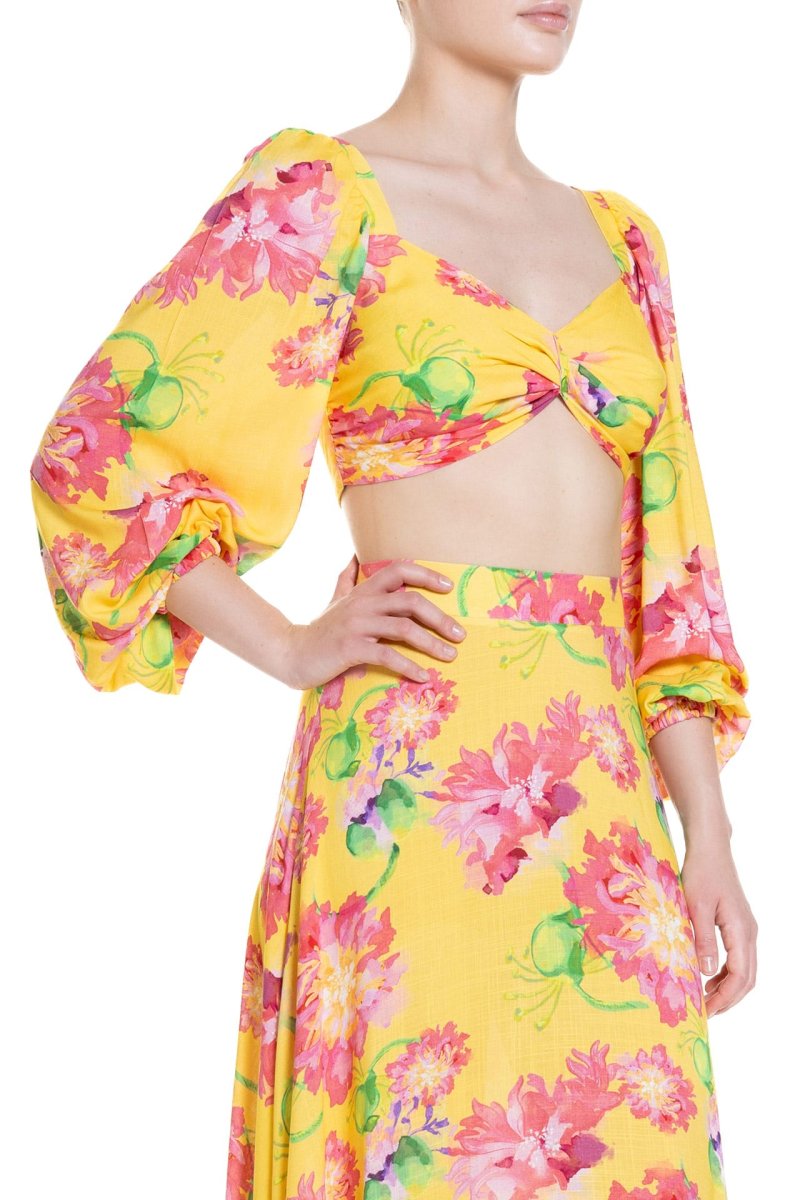 Questo crop top รจ un capo sartoriale, vivace e colorato, perfetto per aggiungere un tocco di freschezza al tuo guardaroba estivo. Realizzato con un tessuto leggero e traspirante, presenta motivi floreali e tropicali in tonalitร accese dipinti a mano. Le maniche a tre quarti leggermente a sbuffo, con elastico ai polsi, creano un effetto voluminoso e romantico. La scollatura a cuore con una torsione centrale aggiunge un tocco elegante e femminile, rendendo questo top ideale per diverse occasioni, dalle passeggiate in spiaggia agli aperitivi serali. Abbina questo crop top con una gonna Poupine a vita alta o dei pantaloni palazzo per un look chic e sofisticato. Completa l’outfit con sandali o espadrillas e accessori colorati per un tocco di allegria.