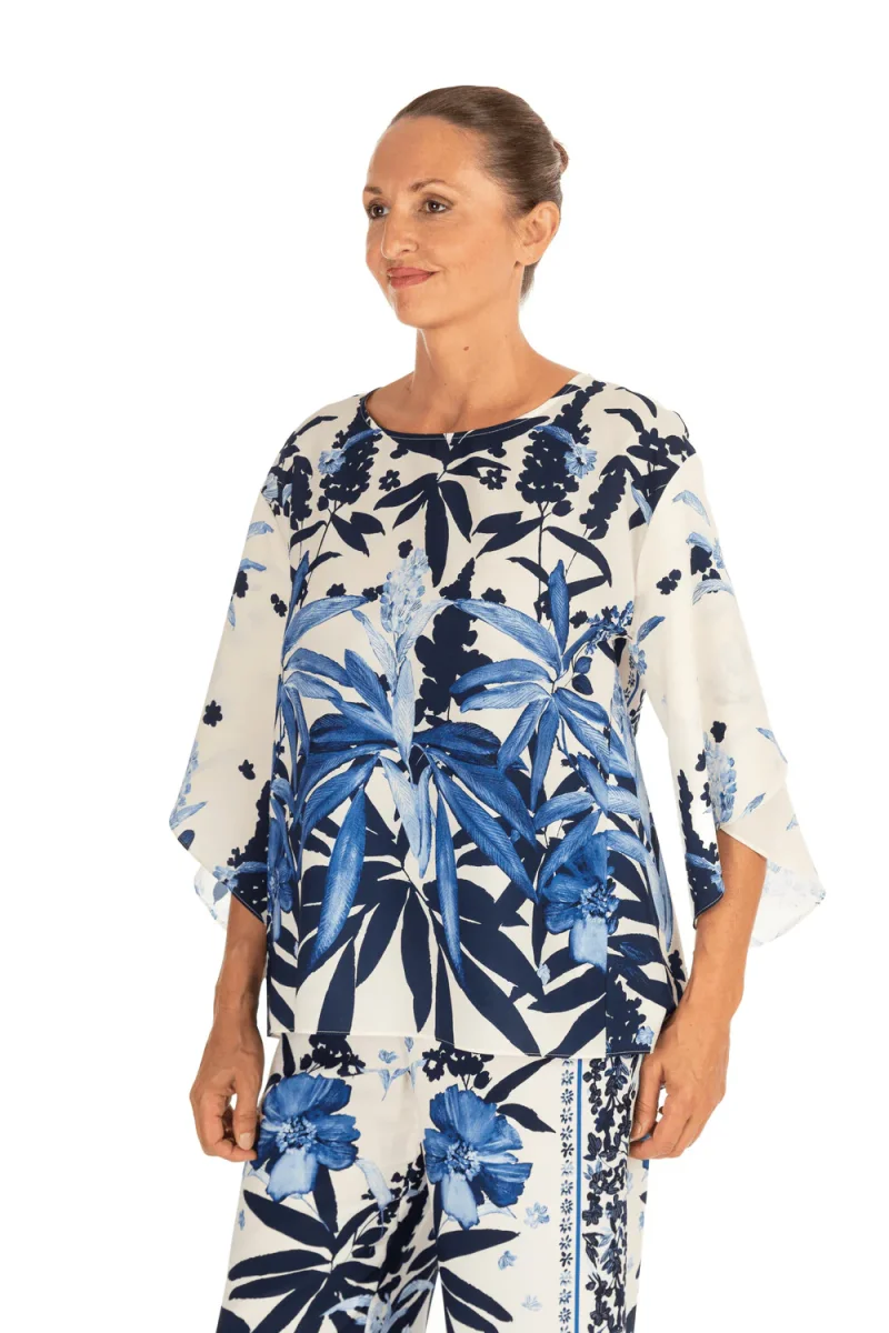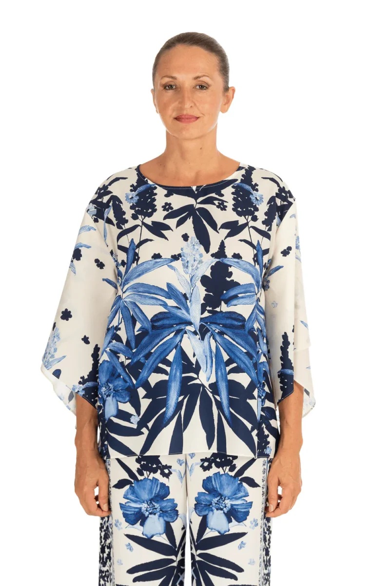 Blusa in tessuto fluido con stampa floreale piazzata nei toni del blu su fondo avorio. La linea ampia con maniche arricchite da piega e scollo rotondo crea un effetto arioso e contemporaneo.