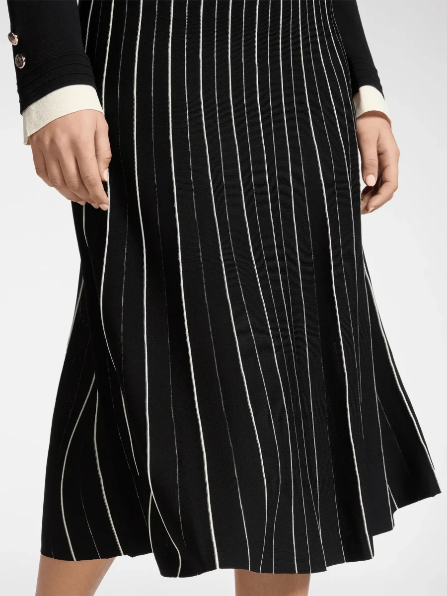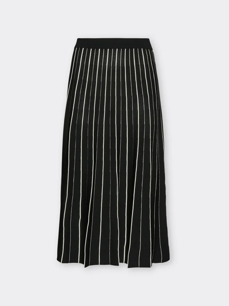 Gonna plissé midi in maglia lavorata a righe con vita elasticizzata e linea fluida. La lavorazione plissé verticale crea movimento e slancia la figura. Si abbina a cardigan e décolleté, dolcevita e ankle boots, o a un top coordinato per un look versatile e raffinato.