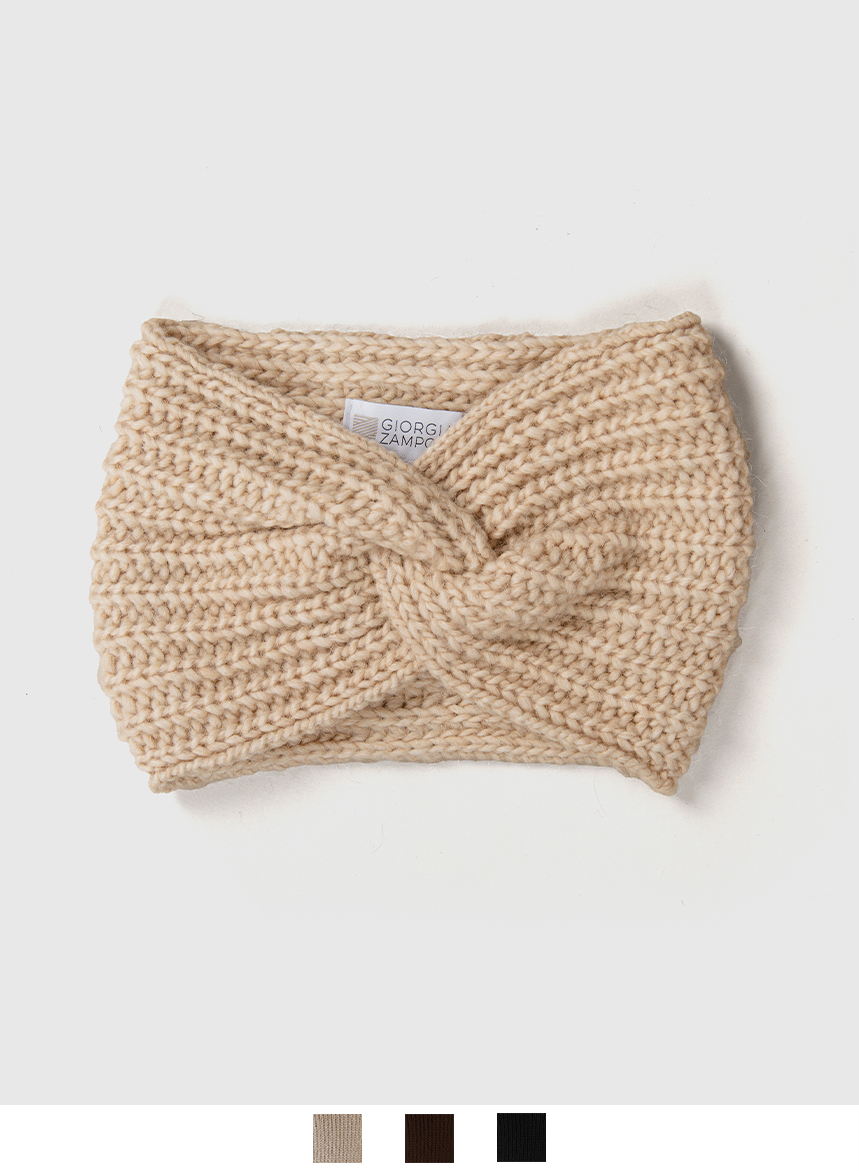 Fascia per capelli di maglia in Lana e Alpaca. Questa linea di accessori รจ in coordinato alla serie di capispalla di maglieria Ethical Fur.