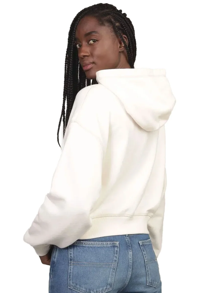 Felpa corta con cappuccio da donna Tommy Jeans. Caratteristicheย Puro cotoneย Girocolloย Con chiusuraย Tasca frontaleย Logo ricamato sul pettoย Dettagli in maglia elastica su polsini e vitaTaglia e taglioย Taglio cortoComposizioneย 100% cotone