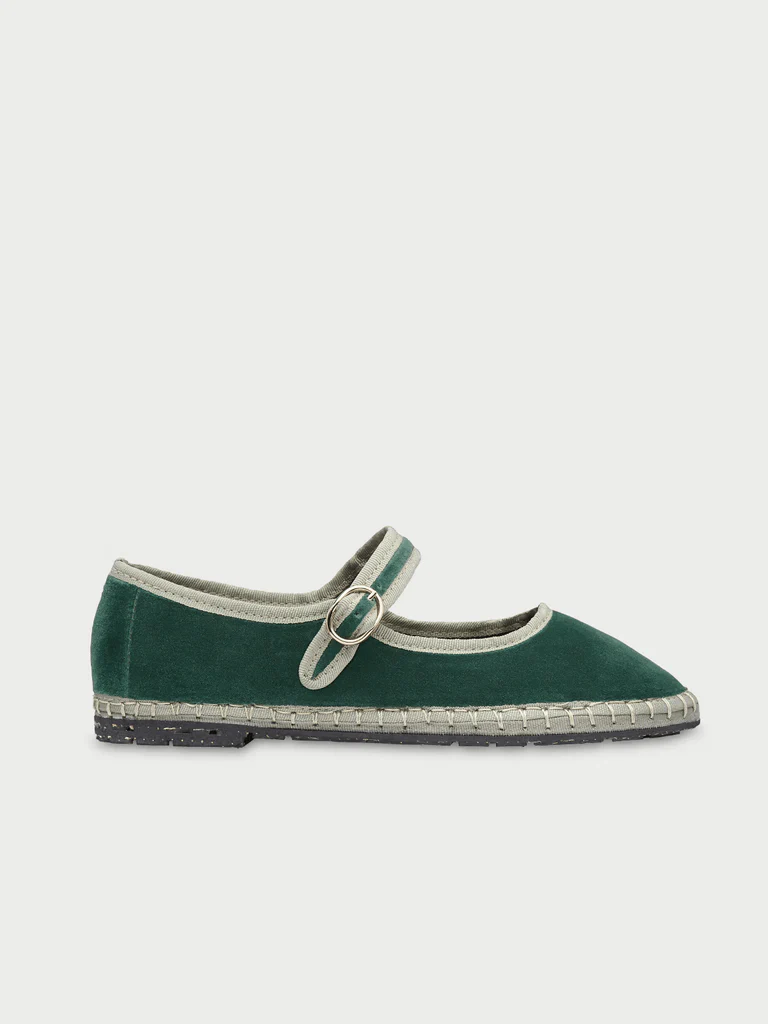 - Mary Jane in velluto verde con chiusura a fibbia verde chiaro.