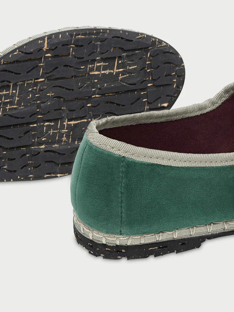 Modello: JAY Mary Jane in velluto verde con chiusura a fibbia verde chiaro. L’esterno della scarpa รจ in lino al 100%, mentre l’interno รจ in cotone biologico al 100% con trattamento antibatterico. La suola รจ realizzata in gomma ricavata da pneumatici di bicicletta riciclati.