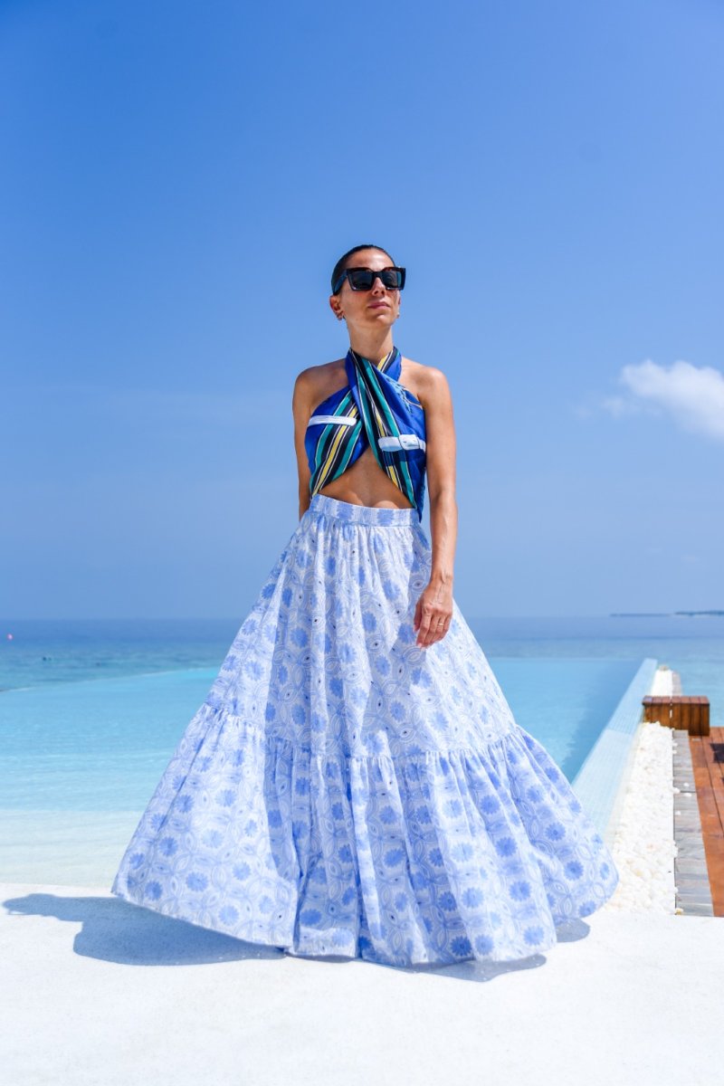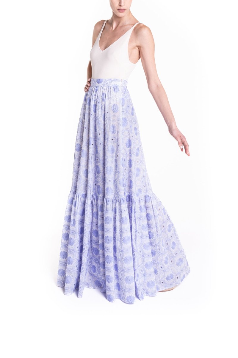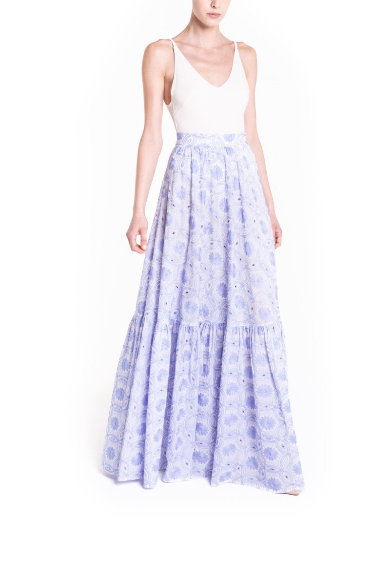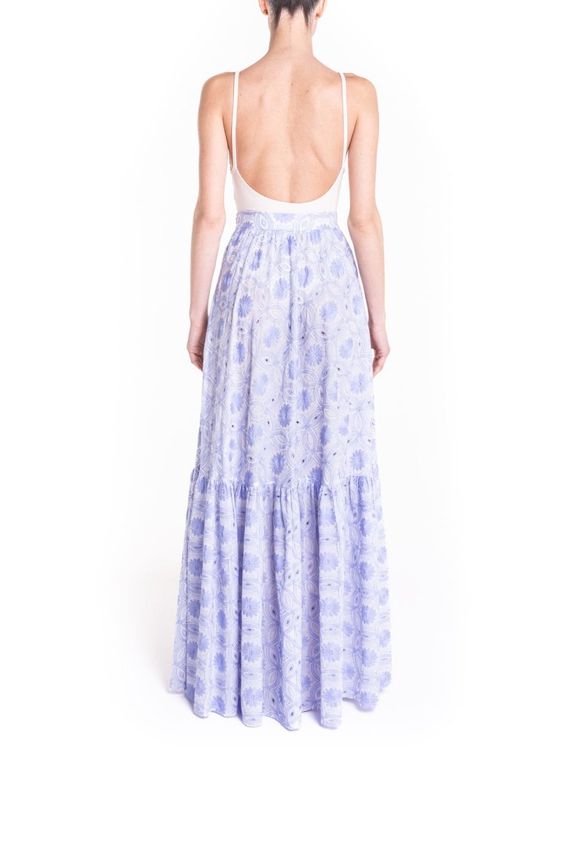 Gonna a ruota lunga a trapezio in cotone ricamato floreale. Arricciatura a una balza sul fondo. Un capo morbido, naturale e sostenibile per la tua estate.