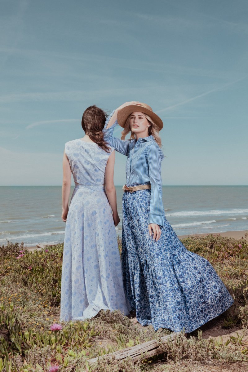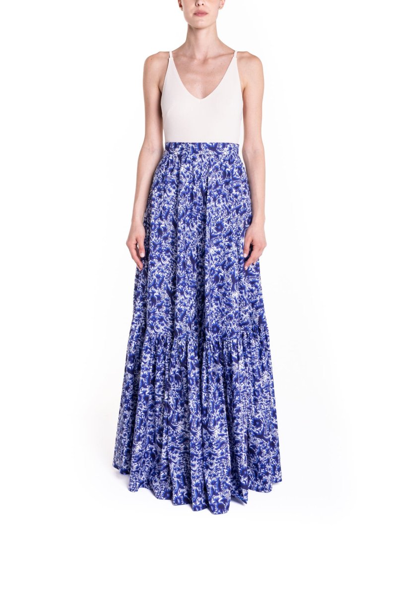 Gonna a ruota con balza fantasia blu