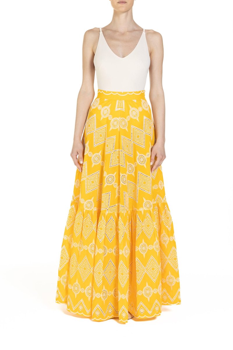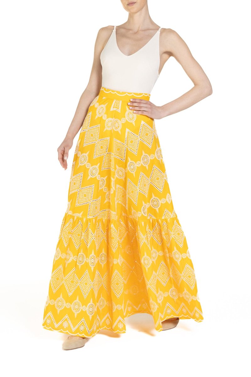 Gonna super femminile e senza tempo, ricamata, con vita alta e balza finale.โจPerfetta da abbinare ad un top dello stesso tessuto per un look romantico o per unโoccasione speciale. Vestibilitร ampia e morbida, per sentirsi sempre bene. Questo capo รจ un connubio di raffinatezza e stile classico.