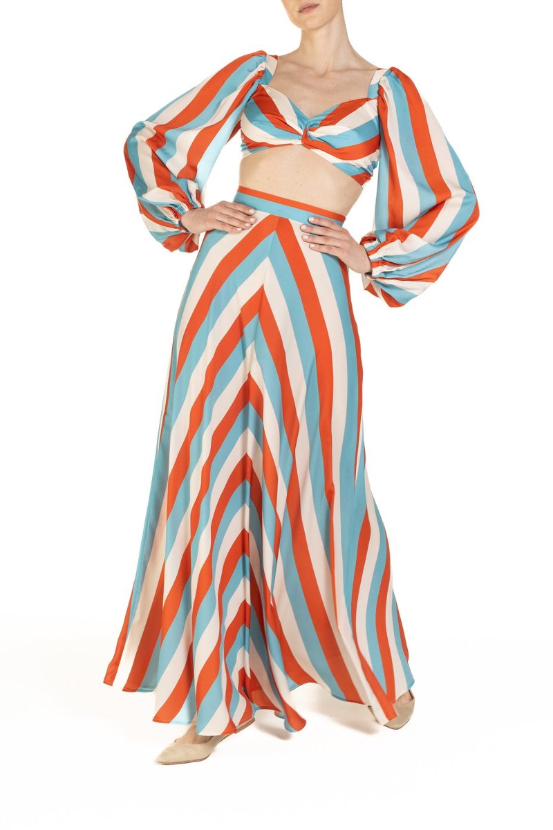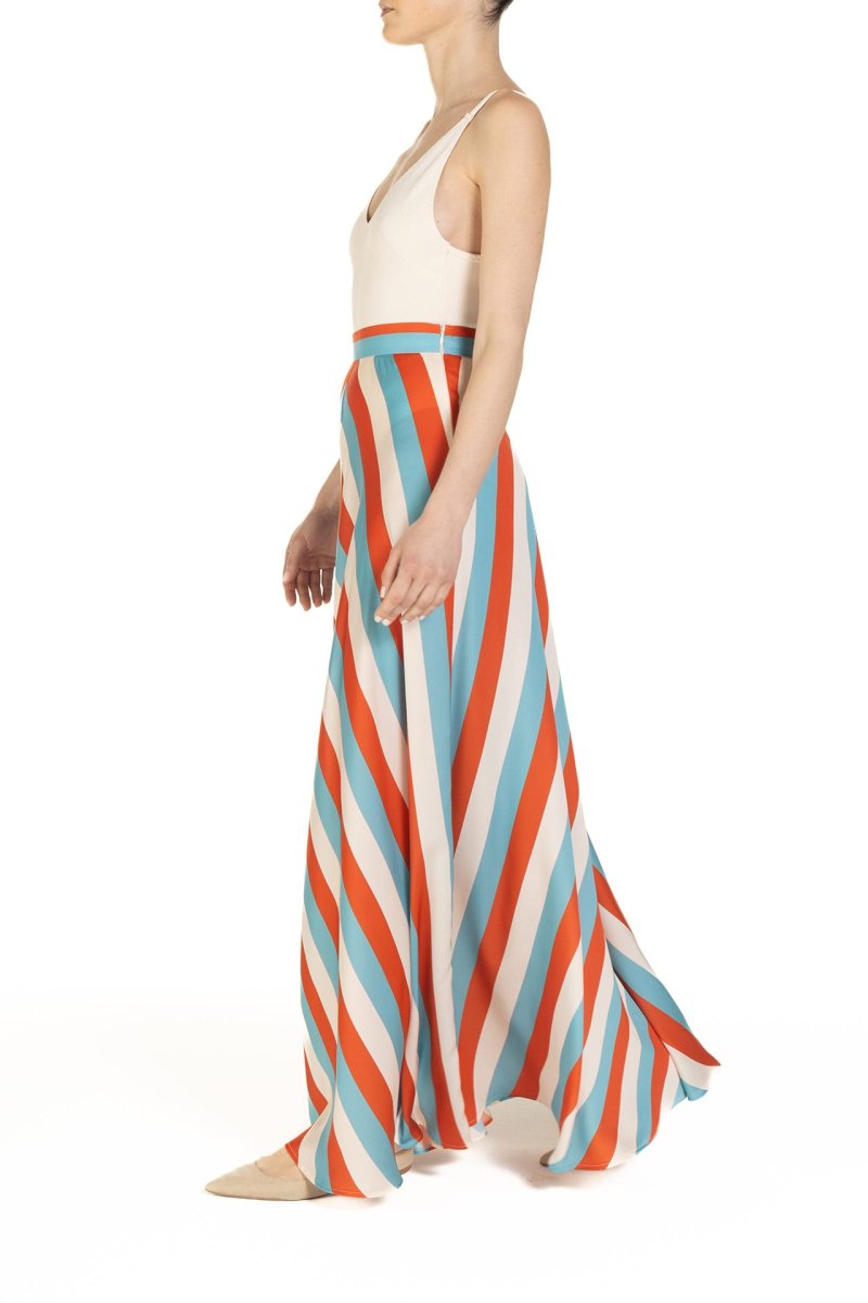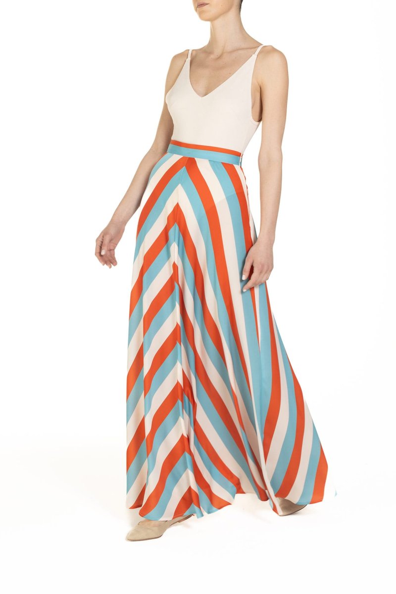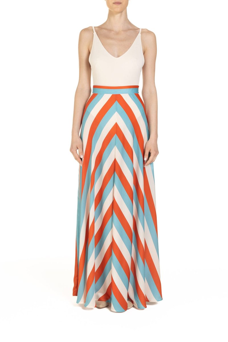 Gonna lunga a ruota in tessuto leggero dona una nota di contrasto, con le sue immancabili righe Poupine, ai look audaci della Primavera Estate 2025.