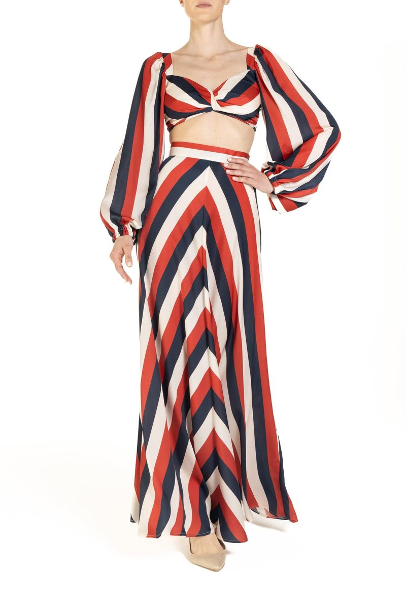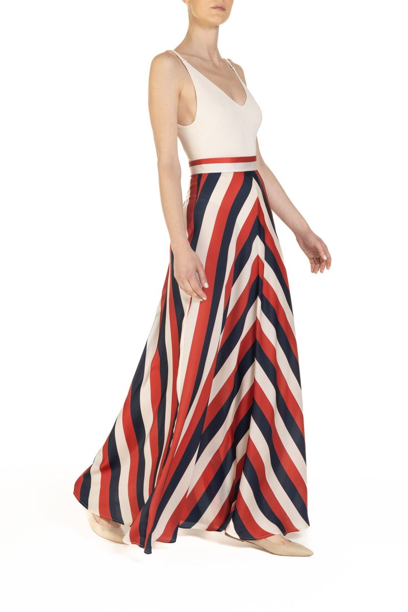 Gonna lunga a ruota in tessuto leggero dona una nota di contrasto, con le sue immancabili righe Poupine, ai look audaci della Primavera Estate 2025.
