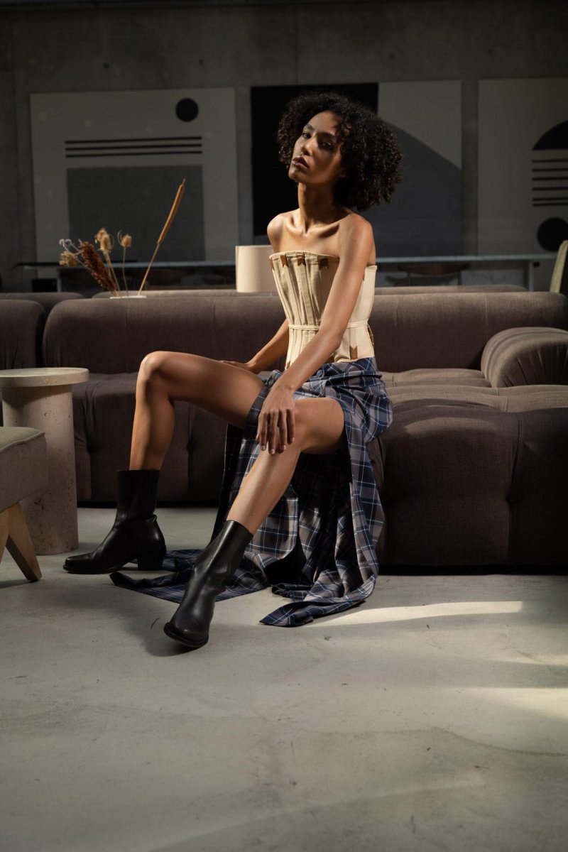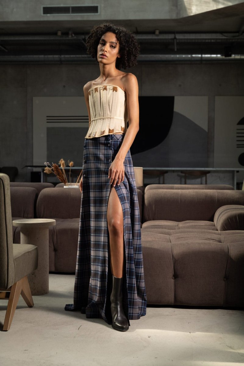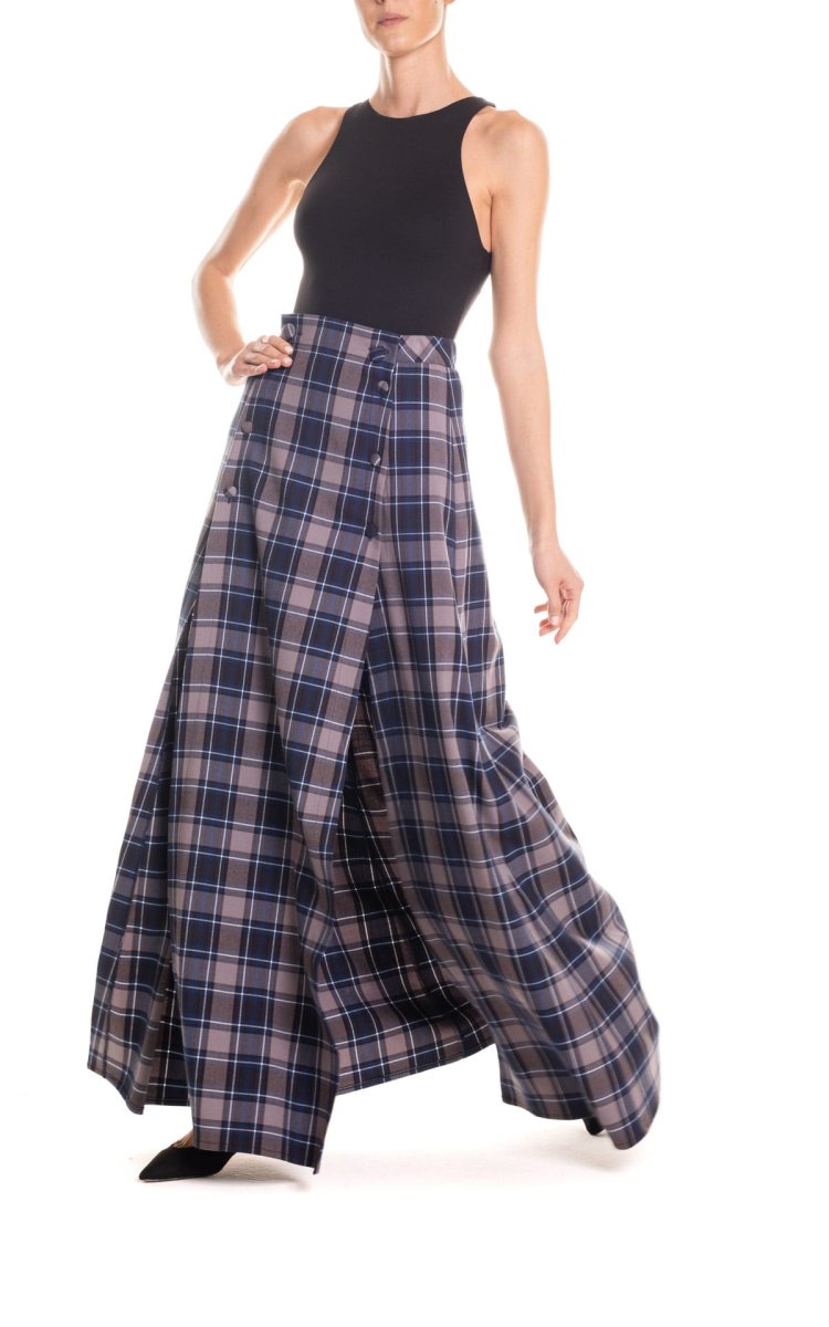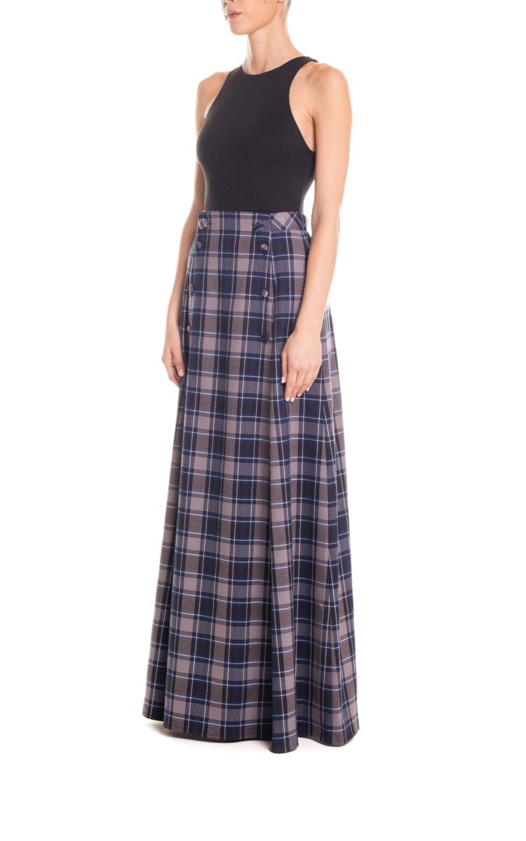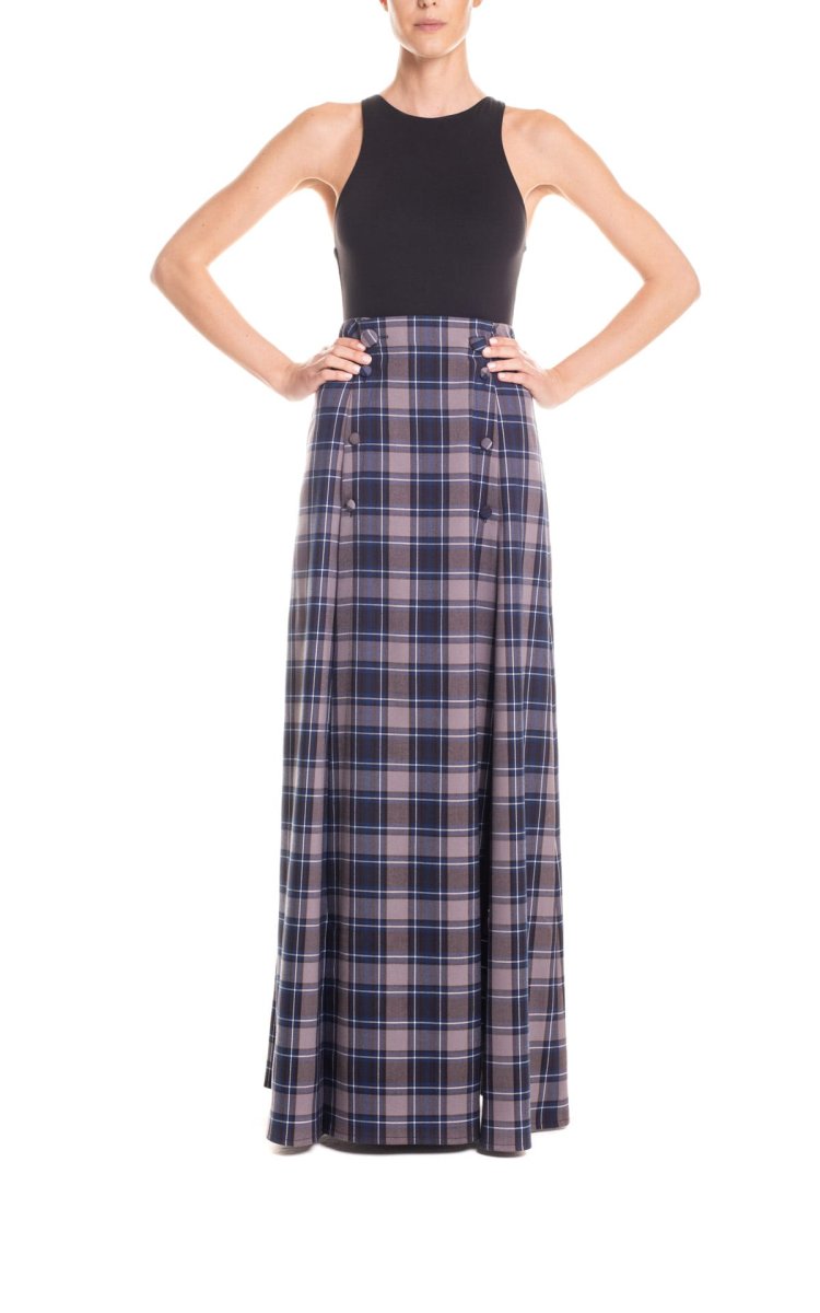Gonna lunga con spacchi laterali, in tessuto scozzese a vita alta, dalle linee fluide.