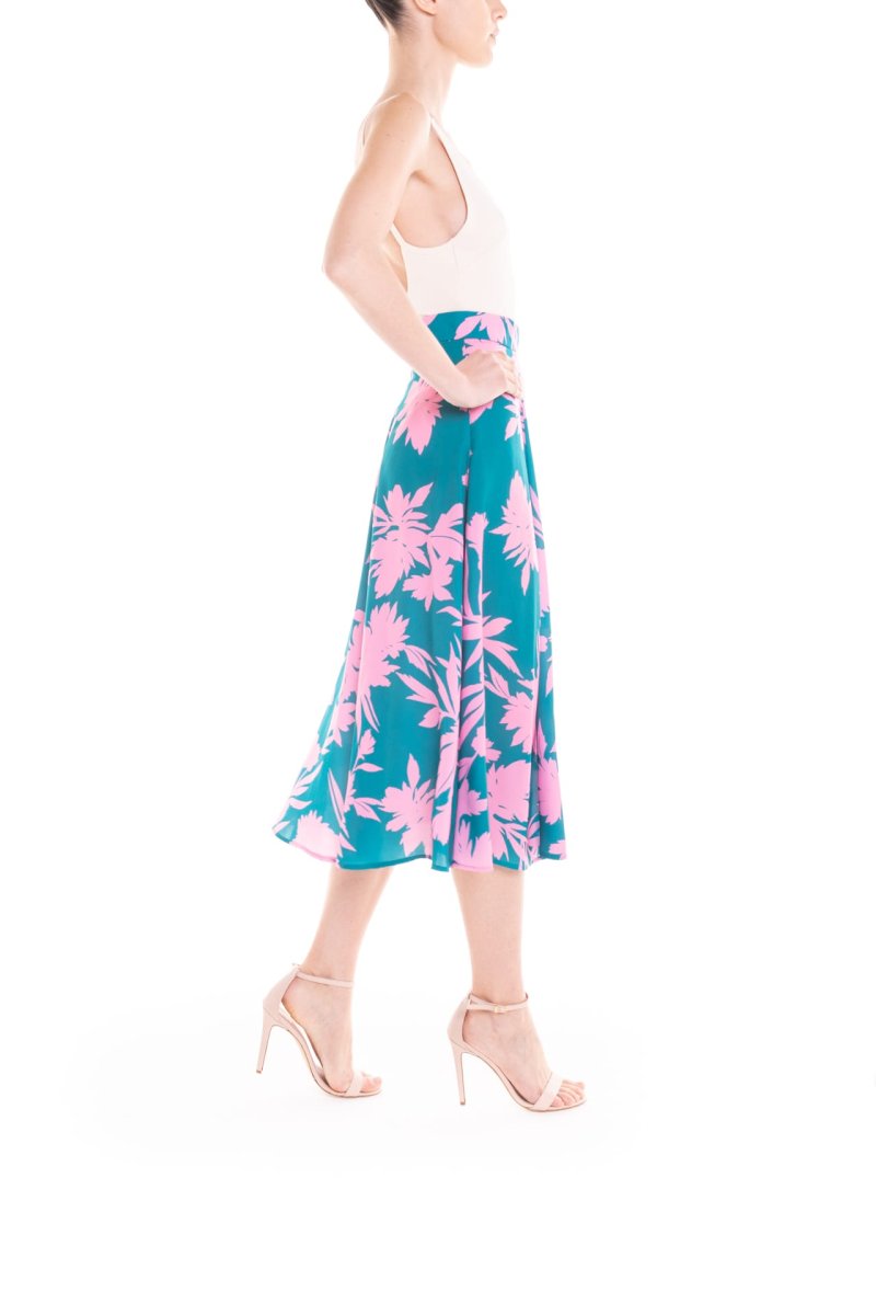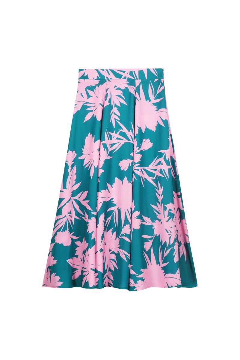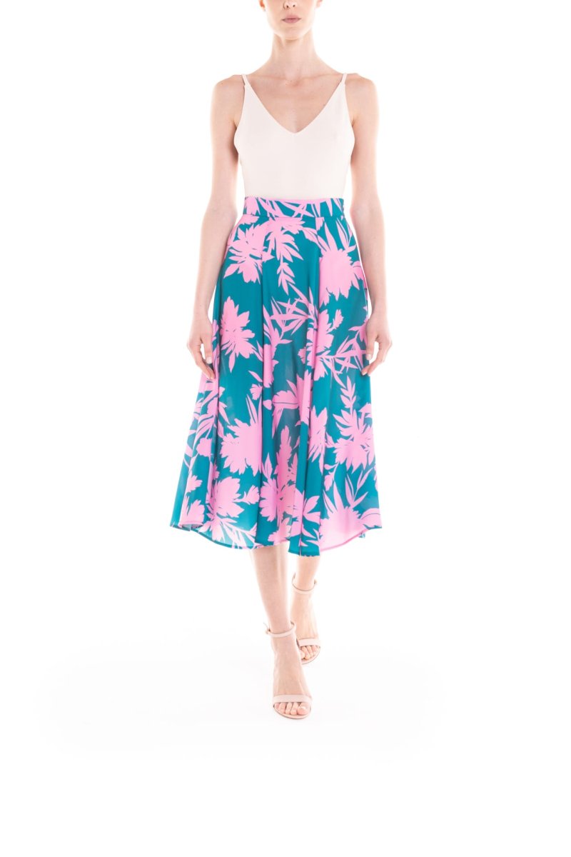 Gonna longuette floreale svasata caratterizzata da diversi teli che rendono il movimento ancora piรน romantico. Abbinabile a diversi capi a seconda che si voglia renderla piรน sporty o chic.