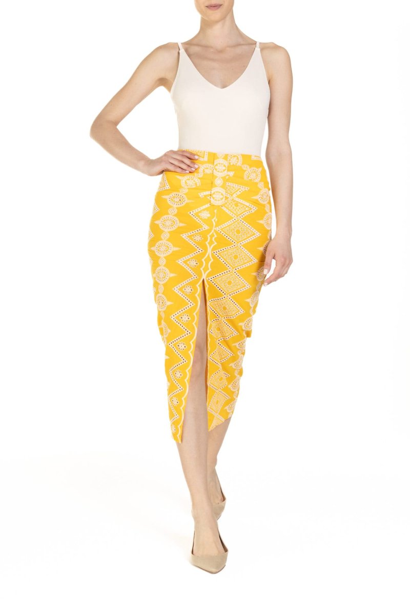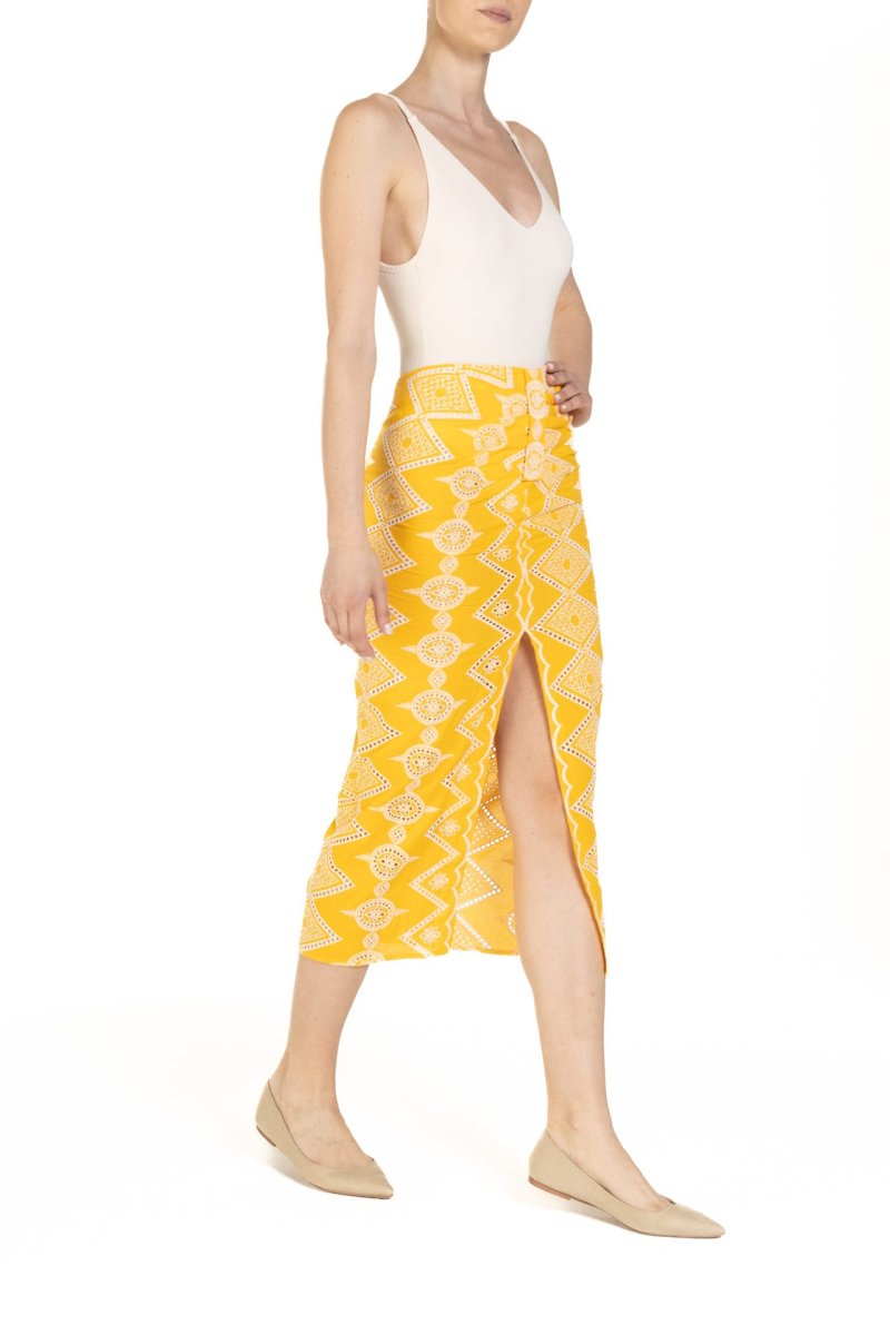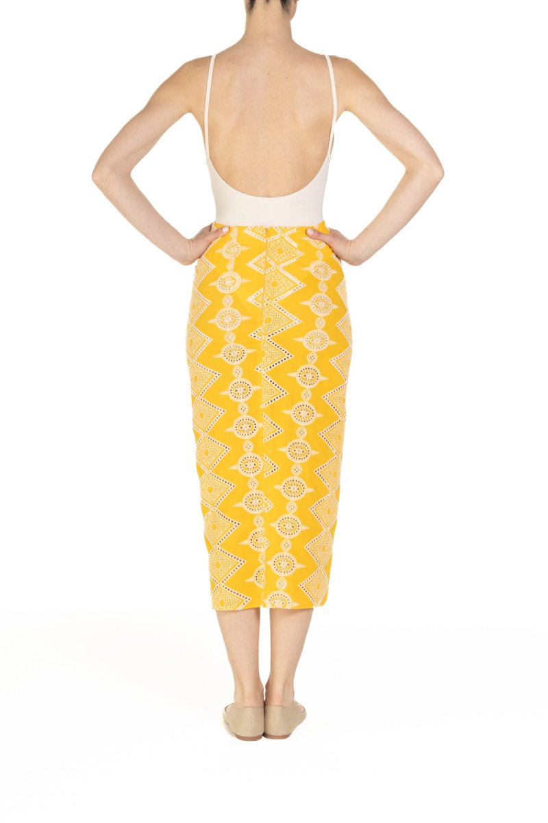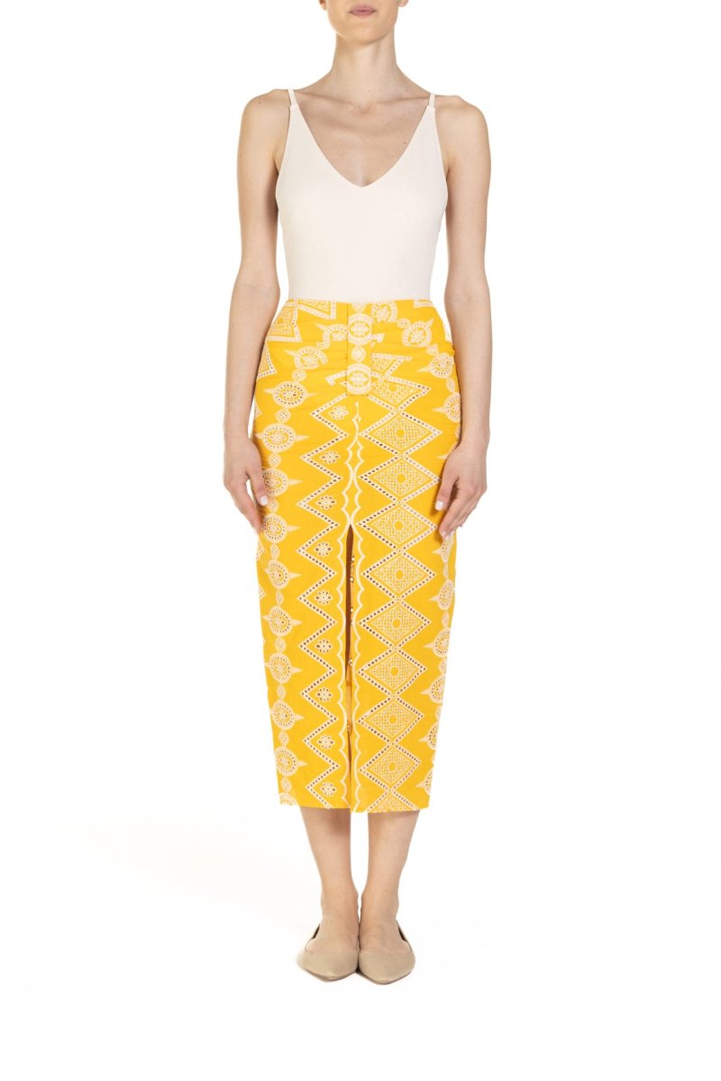 Gonna midi in cotone ricamato a vita alta, presenta delle arricciature al centro che valorizzano la figura. Un design morbido che copre la gamba con una lunghezza media. Con un tacco o con una scarpa bassa, con una camicia o con una t-shirt, sarete sempre stiloseย ed uniche.