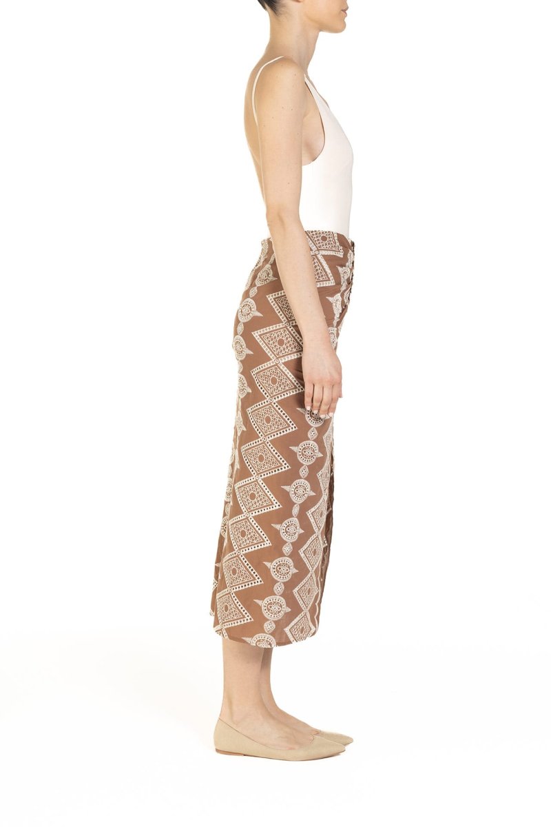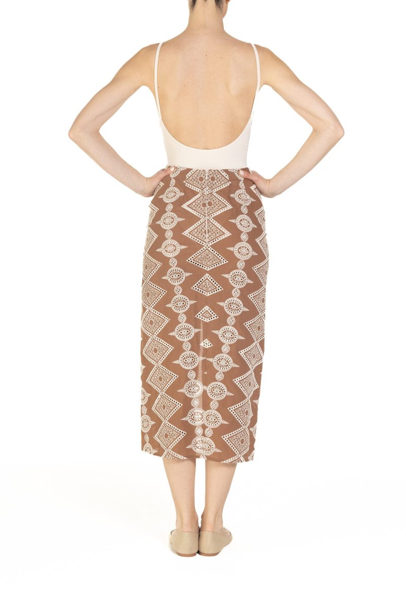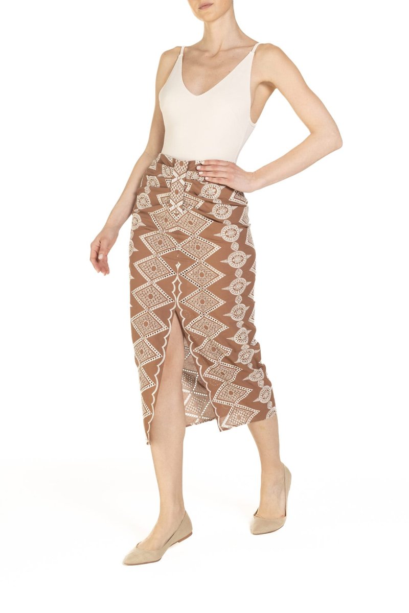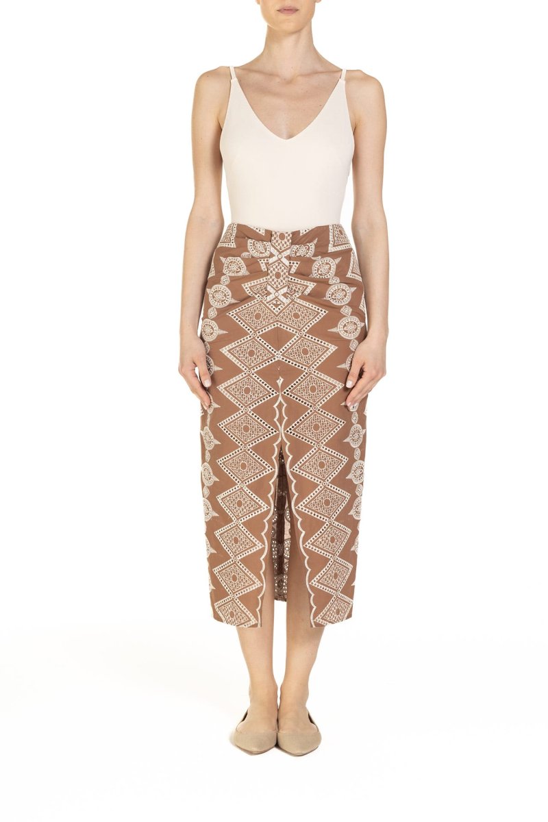 Gonna midi in cotone ricamato a vita alta, presenta delle arricciature al centro che valorizzano la figura. Un design morbido che copre la gamba con una lunghezza media. Con un tacco o con una scarpa bassa, con una camicia o con una t-shirt, sarete sempre stiloseย ed uniche.