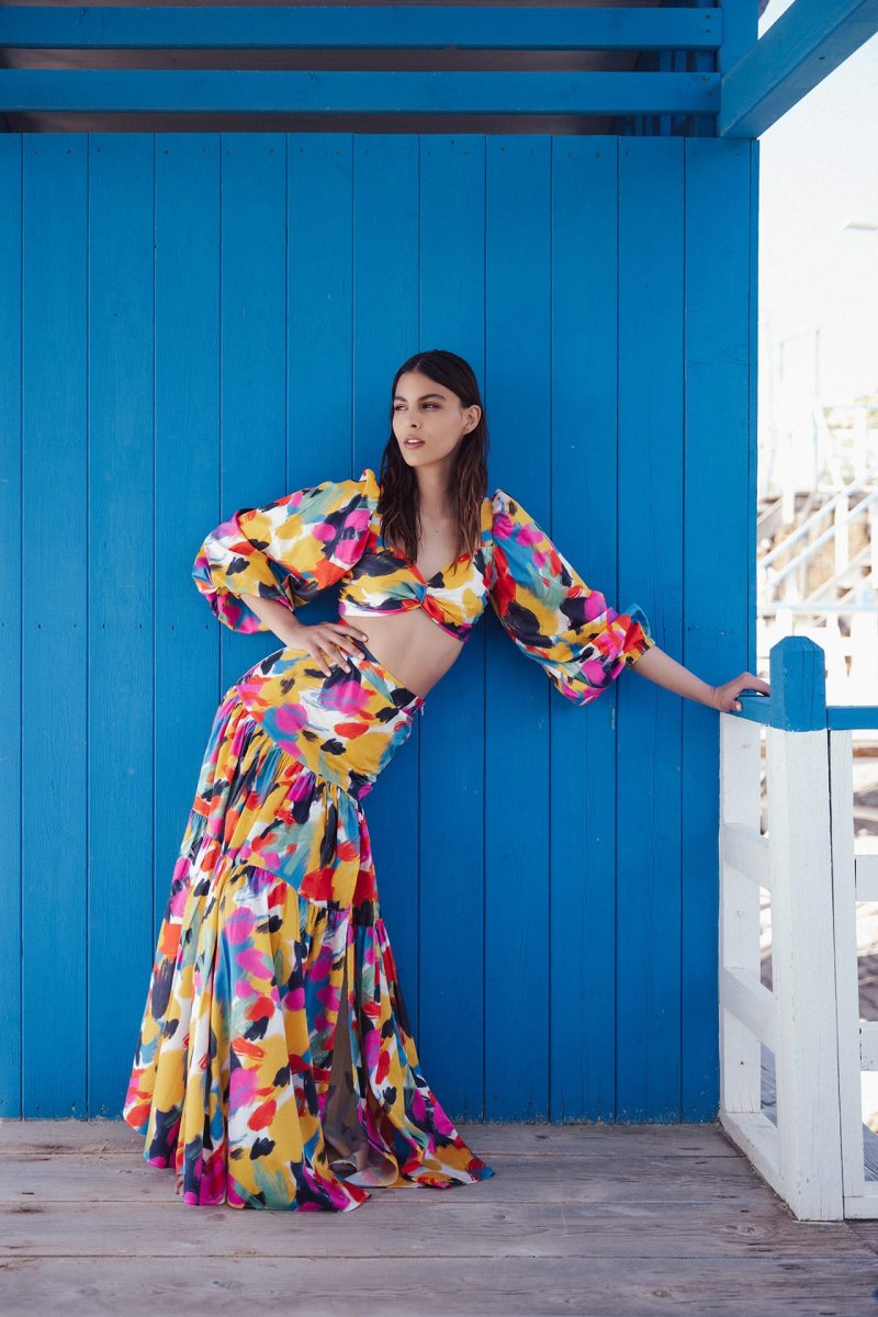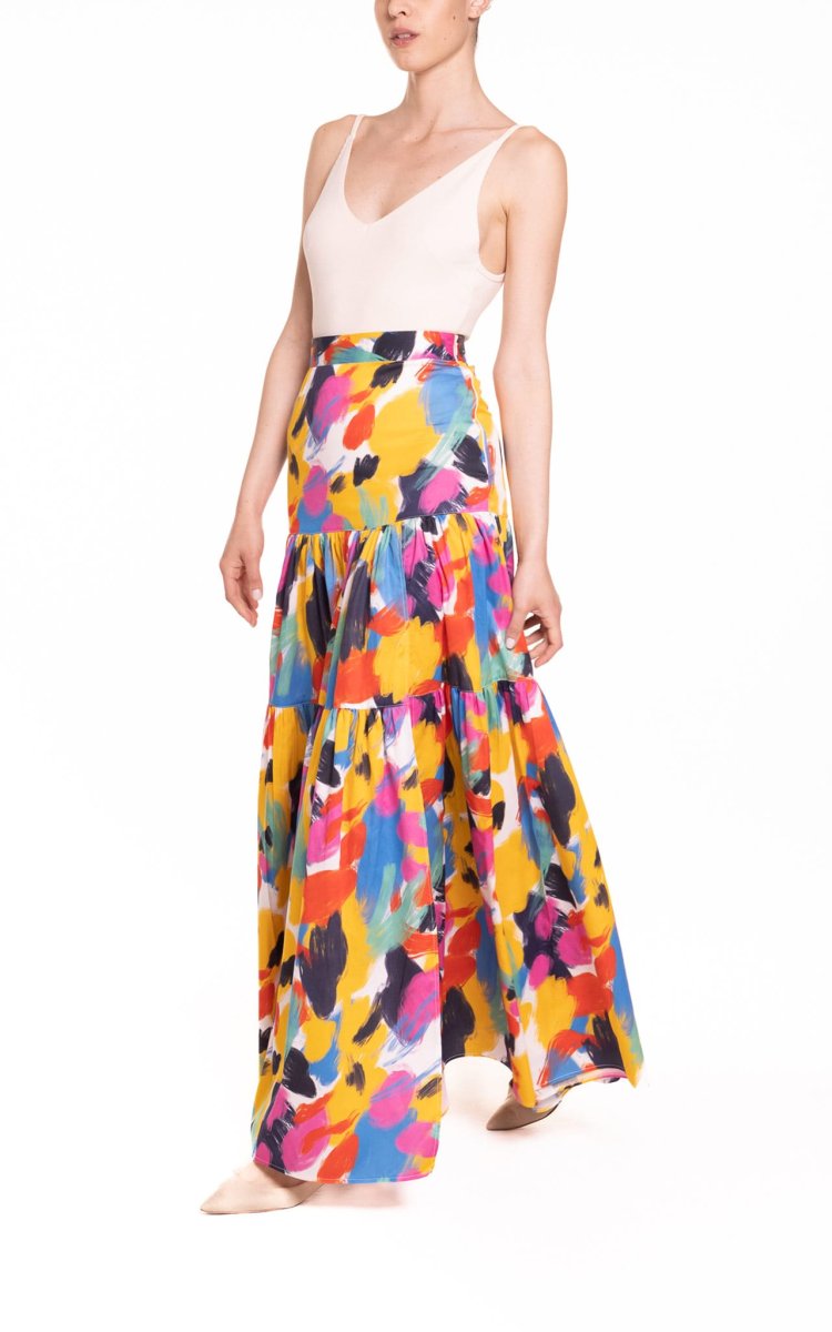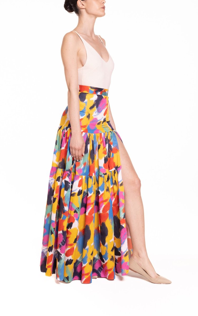 Gonna lunga sartoriale a ruota ampia con balze e spacco laterale, a vita alta, dalle linee fluide. Il cotone decorato con una stampa fantasia all-over aggiungerร colore e brillantezza alla vostra femminilitร .Un capo unico, di unโeleganza essenziale che non vi stancherร mai.