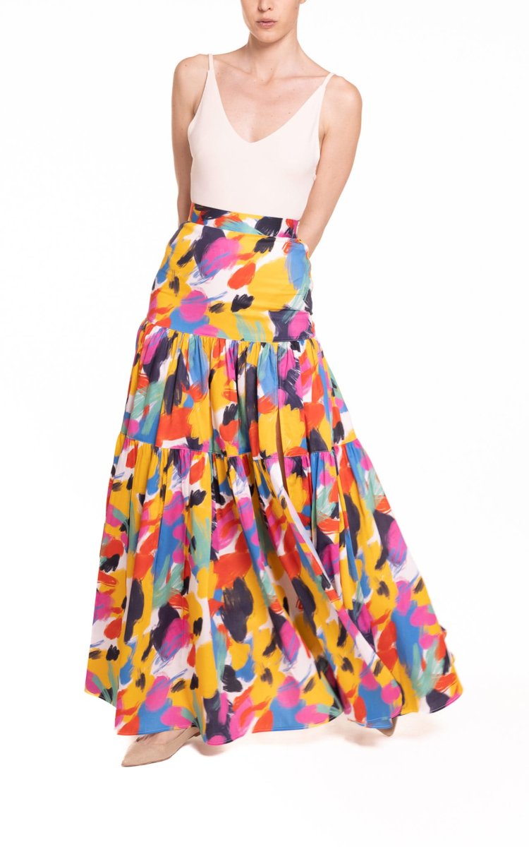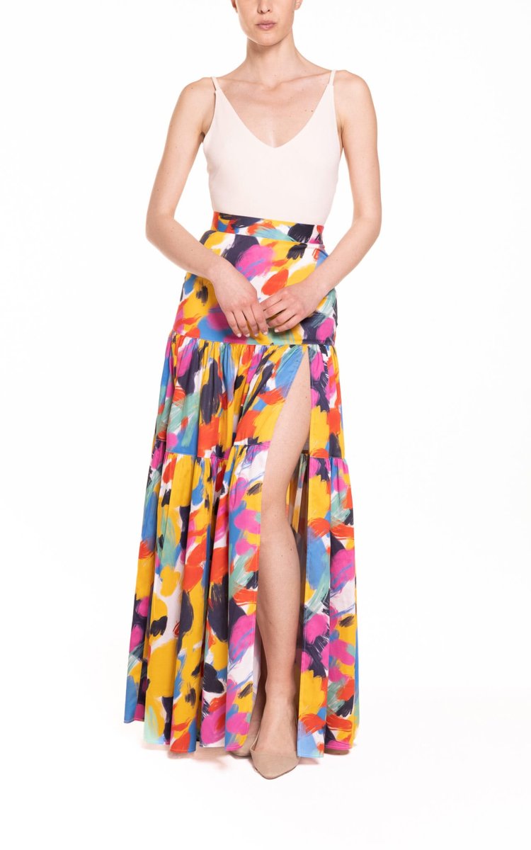 Gonna lunga con balze e spacco fantasia multicolor