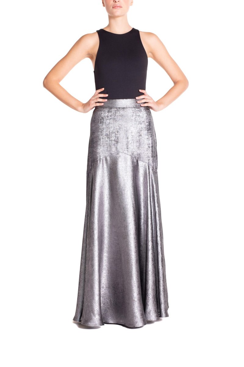 Questa gonna lunga in lamé argento e oro è un vero statement di eleganza moderna. La silhouette a sirena avvolge delicatamente i fianchi e si apre dal ginocchio con un ampio taglio svasato, creando un movimento fluido e luminoso ad ogni passo. Il pannello a V rovesciata, punto focale del design, esalta la brillantezza del tessuto e aggiunge un dettaglio sartoriale di grande impatto. Un capo che fonde struttura e leggerezza, perfetto per un look sofisticato e senza tempo.