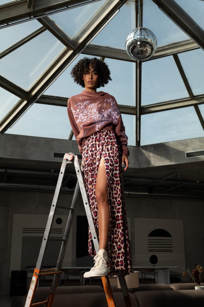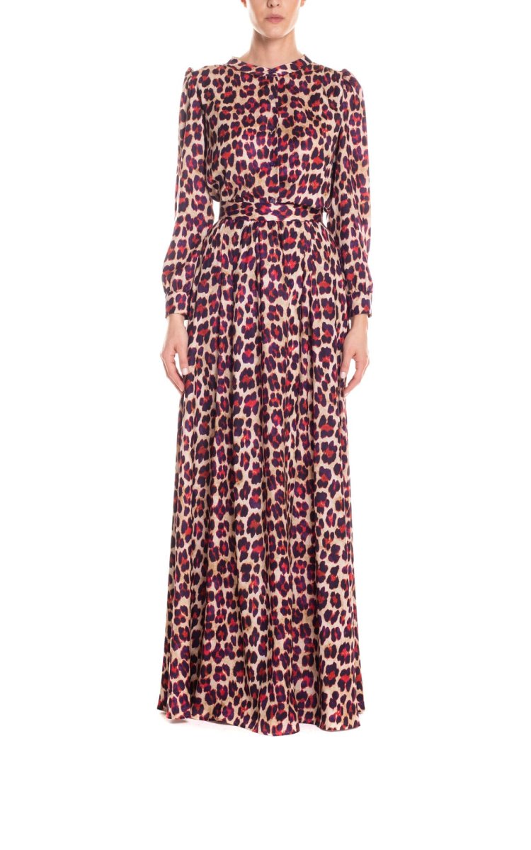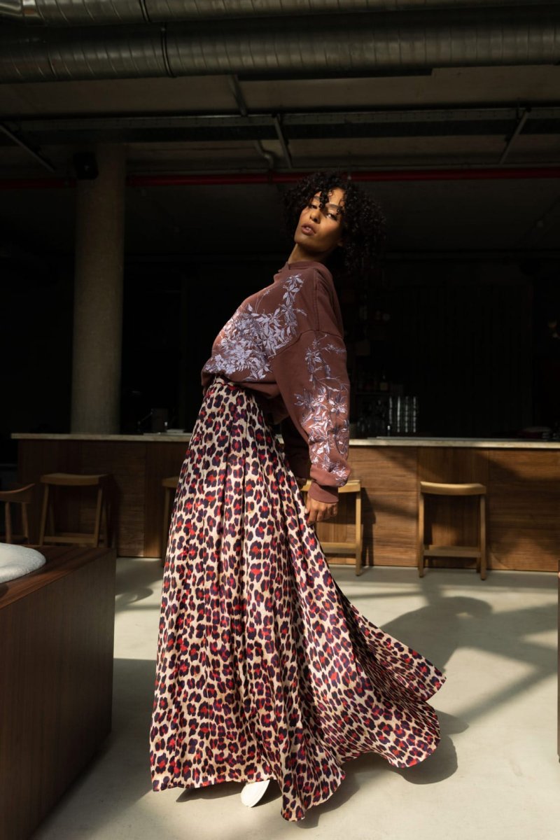 Gonna lunga a ruota in tessuto leggero dona una nota vibrante allโ autunno inverno Poupine, con una nuova stampa animalier viva, intrigante, bella, da amare e indossare per sempre.