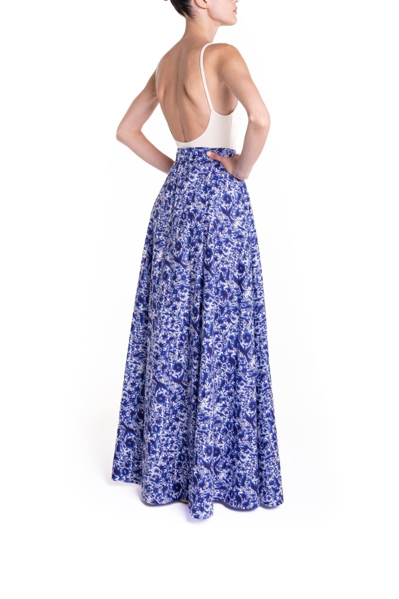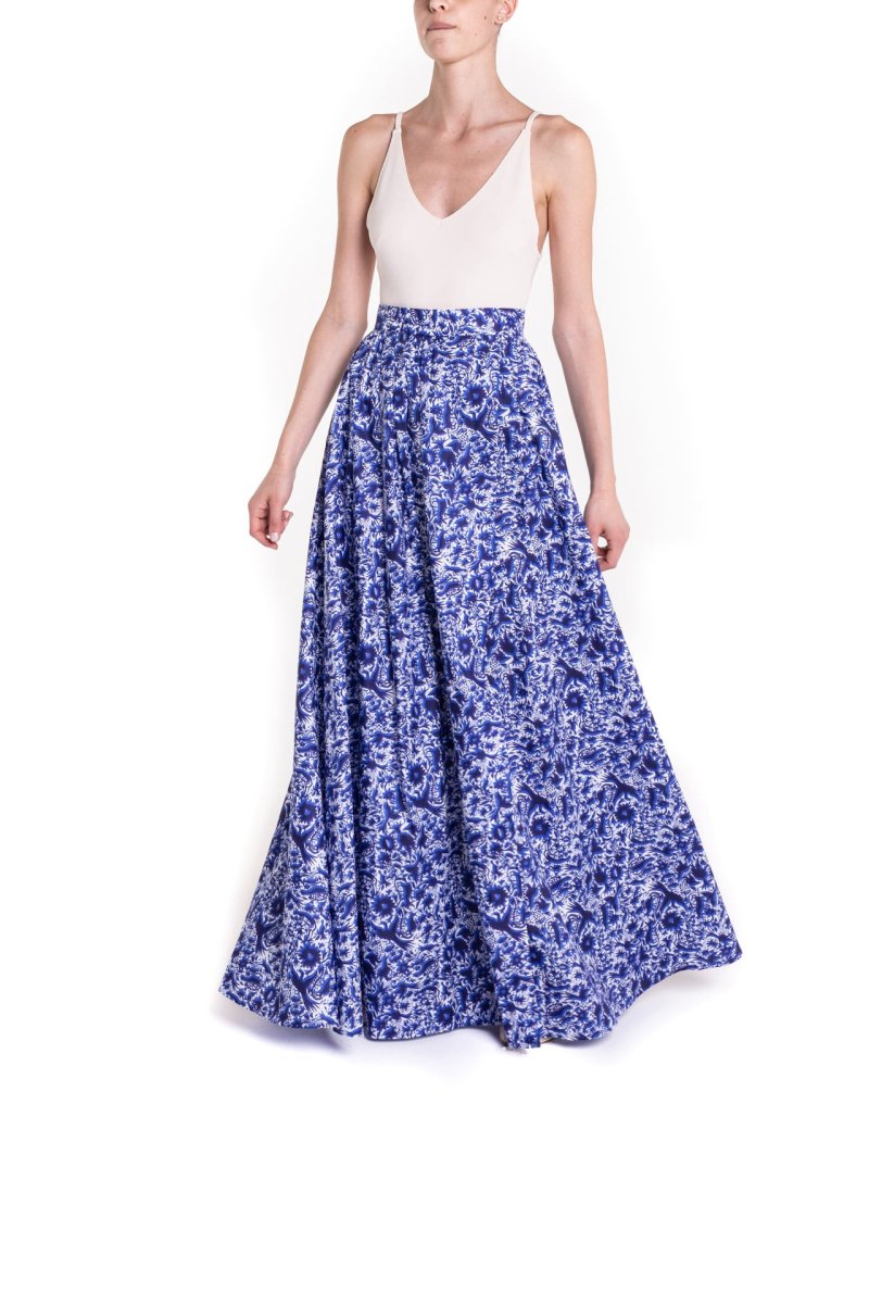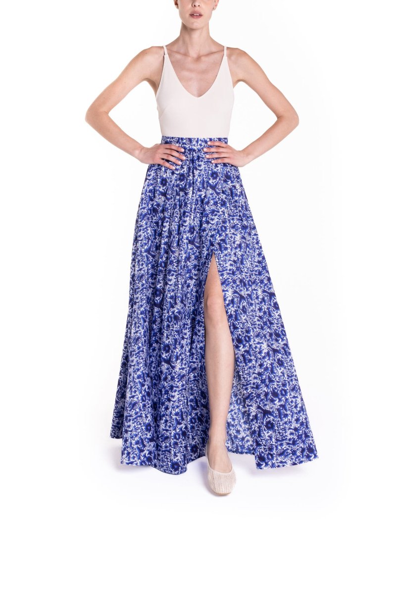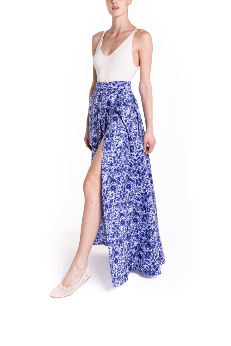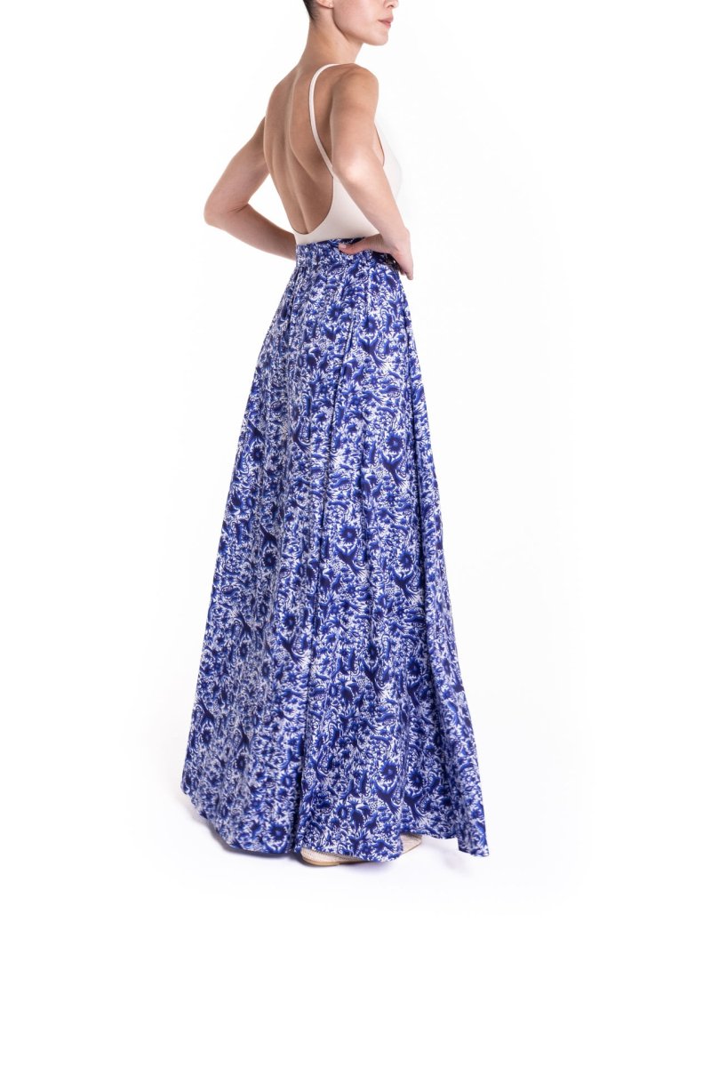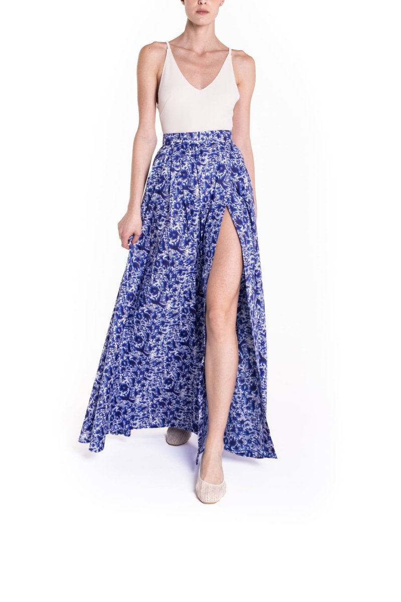 Gonna maxi ruota con spacco laterale fantasia blu