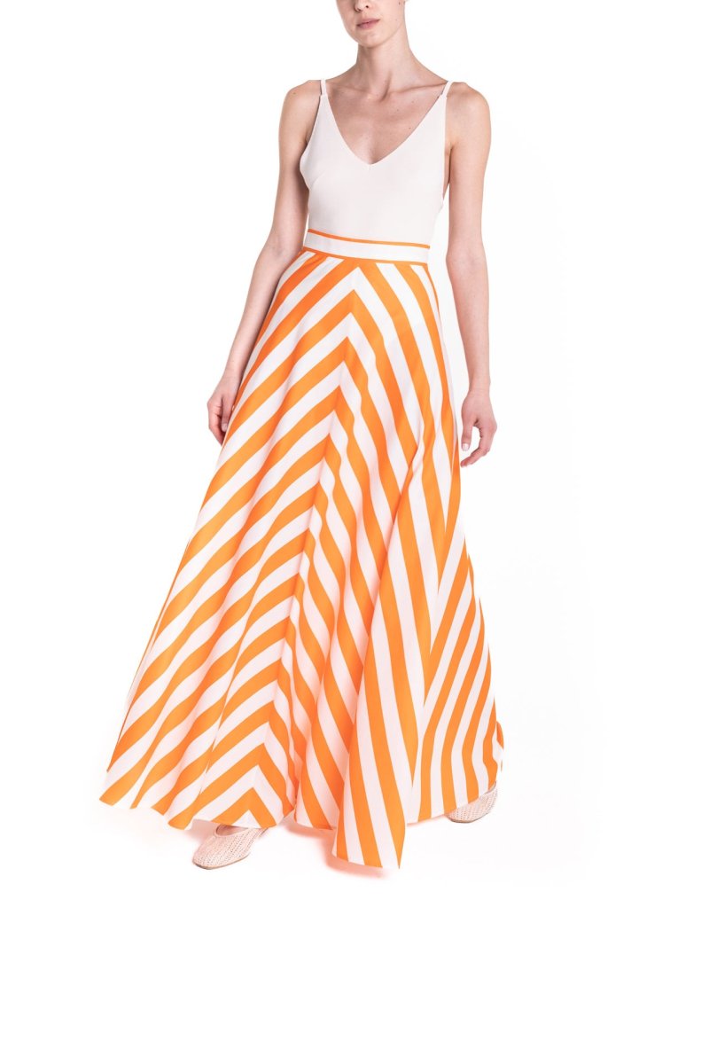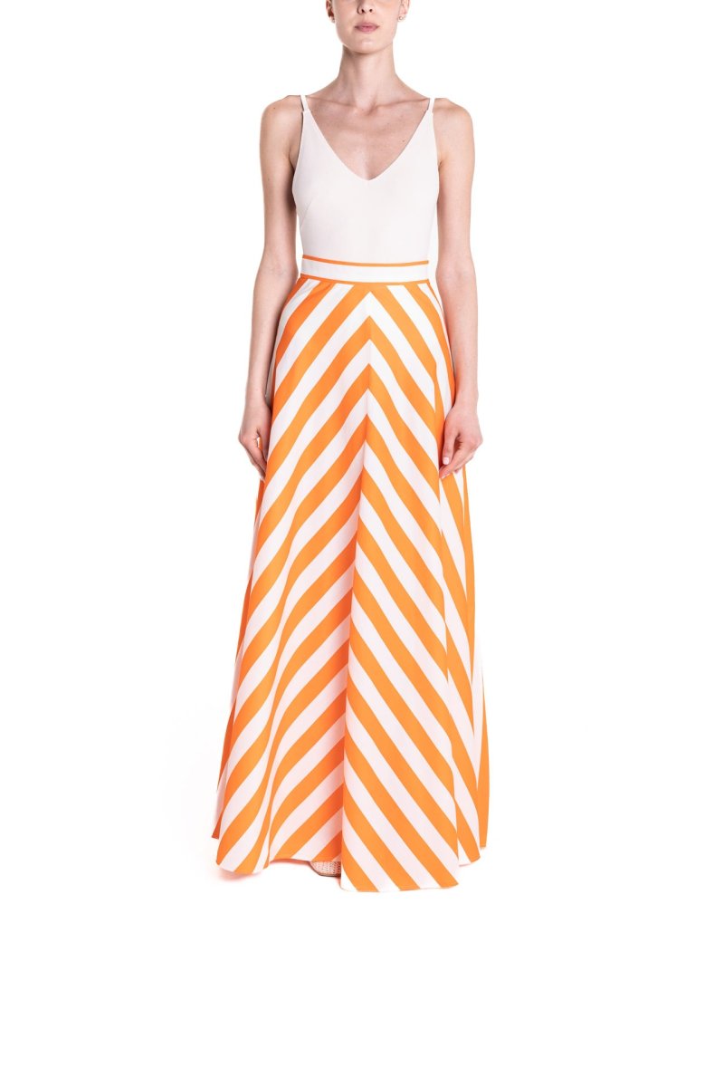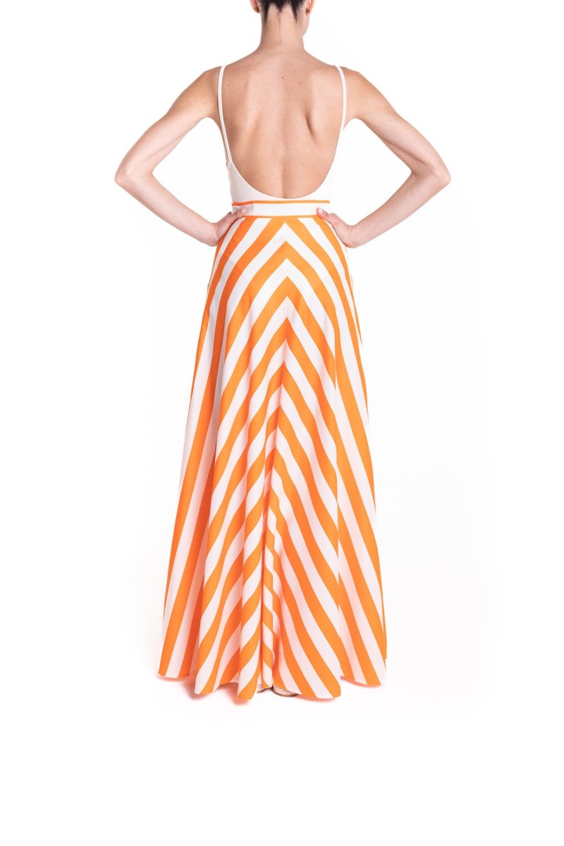 Gonna lunga in cotone dal taglio svasato, fluida e freschissima, dona una nota di contrasto, con le sue immancabili righe Poupine, ai look audaci della Primavera Estate 2022. Permette di creare outfit eleganti o casual data la sua grandissima versatilitร . Per evitare ogni minima trasparenza nel bianco, consigliamo di indossare intimo color nude.
