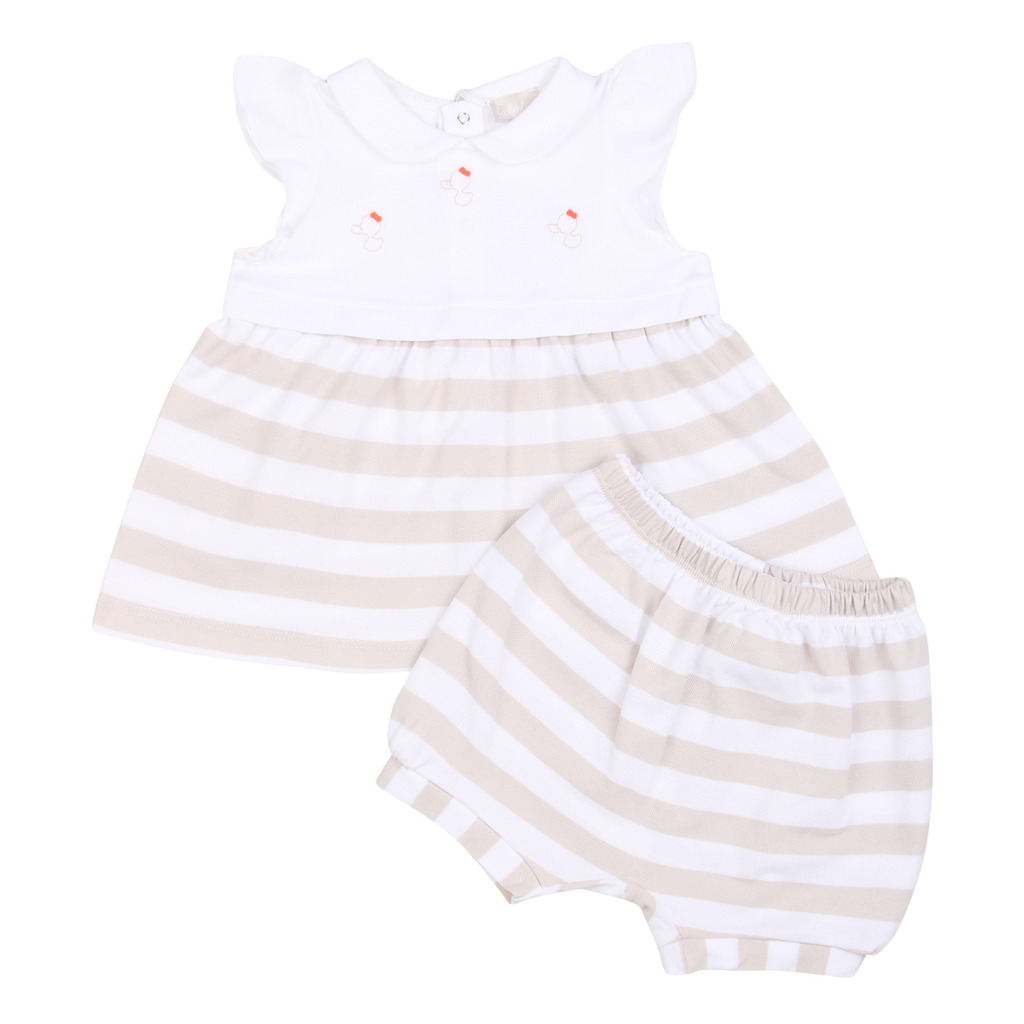 LALALU’ COMPLETO 2 PEZZI LALALU’ COMPLETO 2 PEZZI composto da abito colletto a polo e culottes. chiusura sul retro colore: bianco/beige composizione: cotone taglia: dalla 1 mese alla 9 mesi